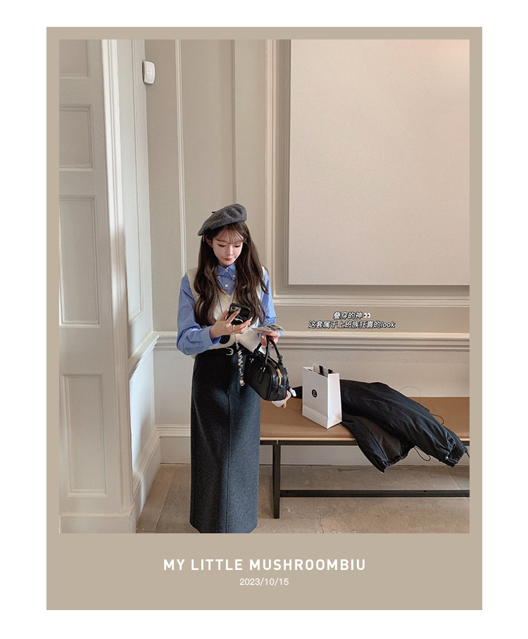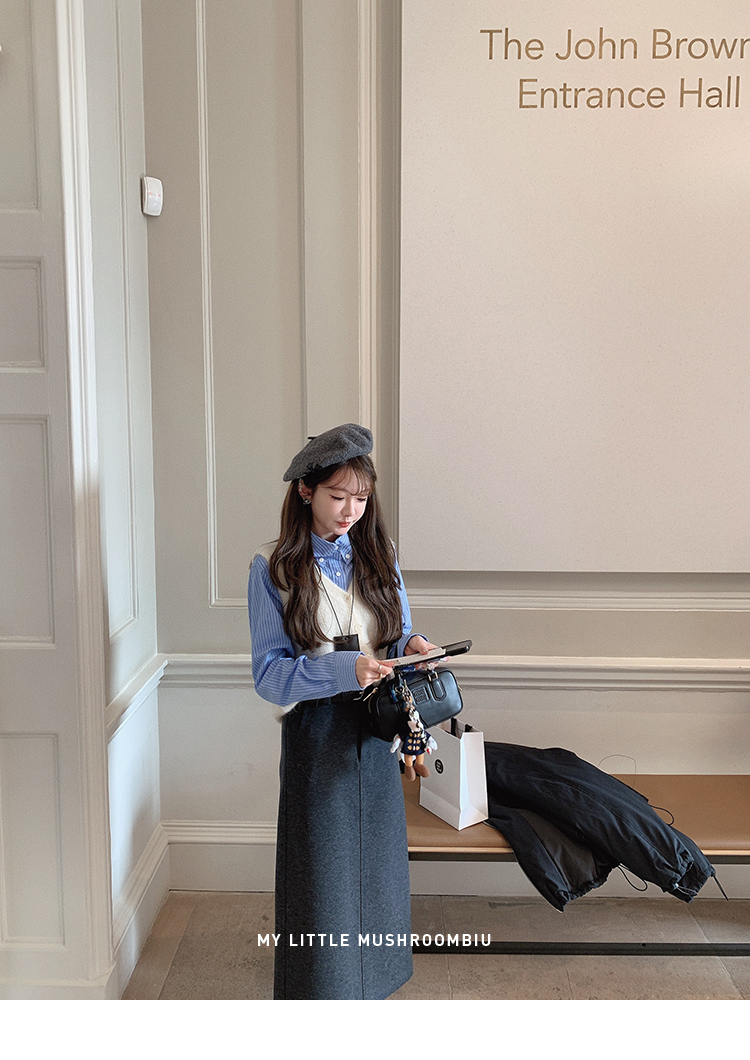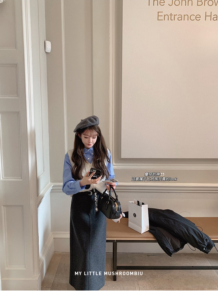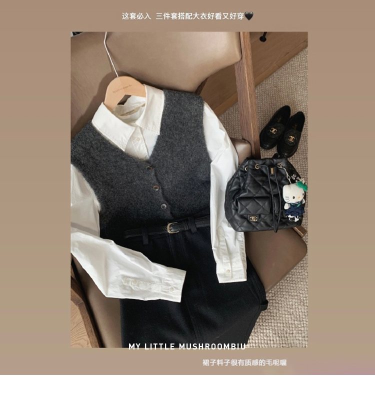 | 背心:40%羊驼40%羊毛16%尼龙4%氨纶 衬衫:白色:100%棉 蓝条:72%棉25%锦纶3%氨纶 半裙:22%羊毛54%聚酯纤维12%棉12%粘纤 |