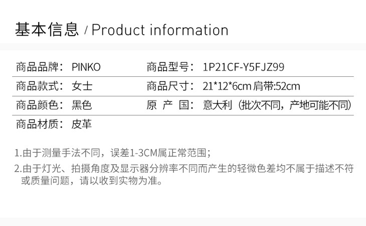 [香港直邮]QHSS19 Pinko 品高 女士牛皮黑色挎包 1P21CF-Y5FJZ99