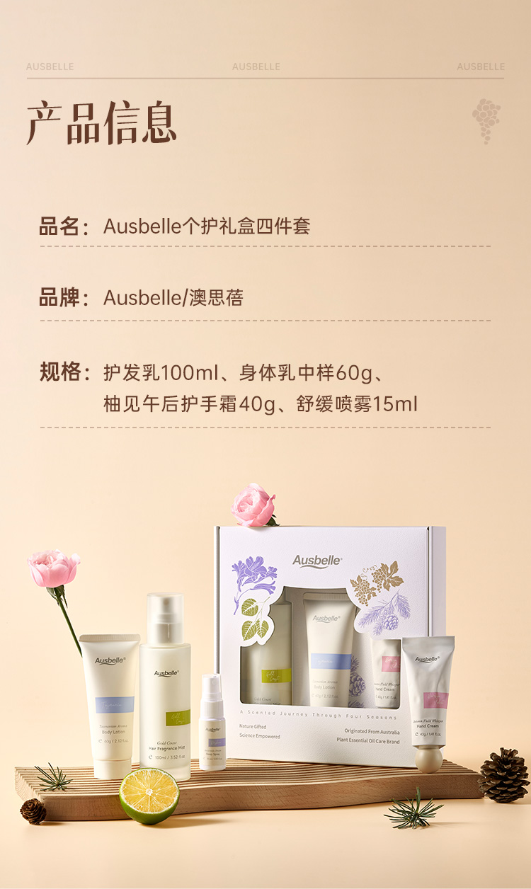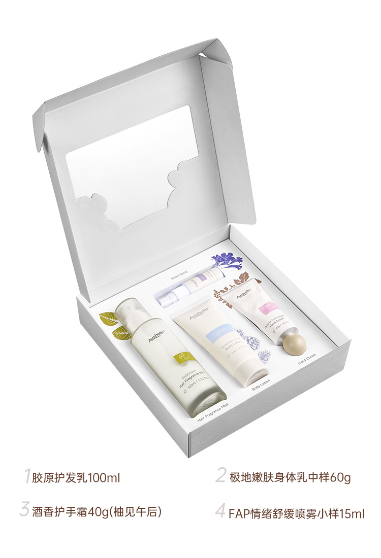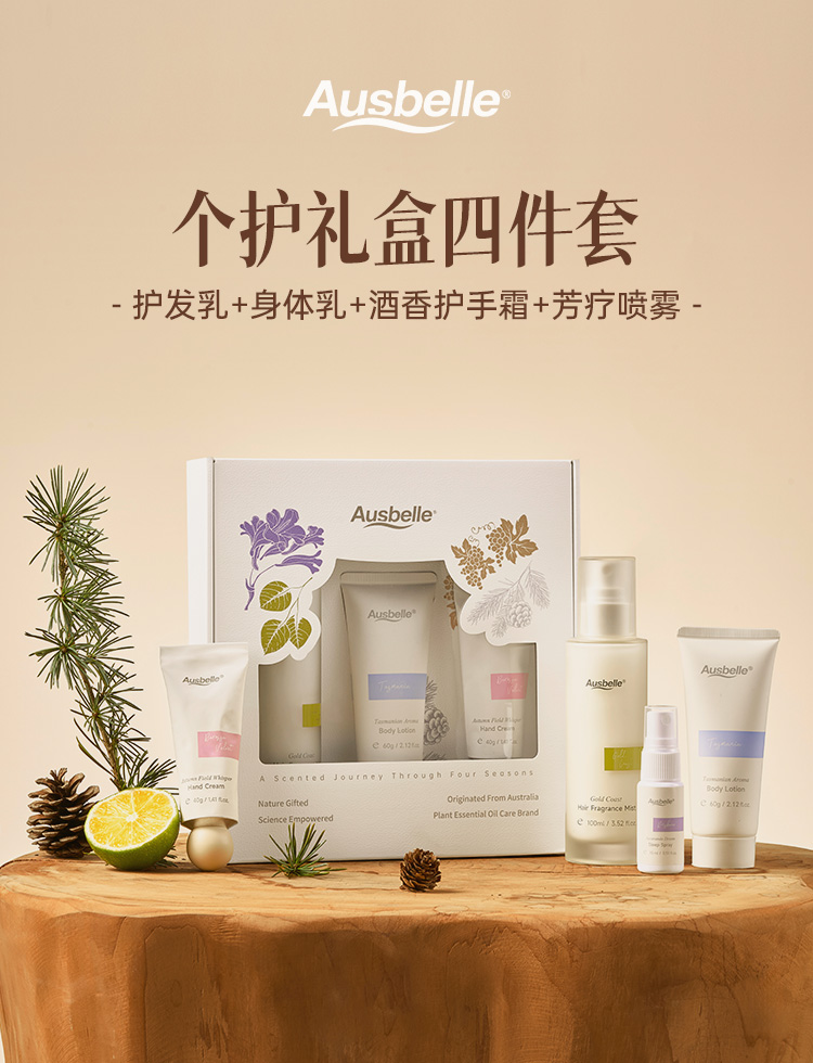 【跨境】Ausbelle澳思蓓香氛个护套盒(护发乳100ml+身体乳60g+护手霜40g+舒缓喷雾15ml)