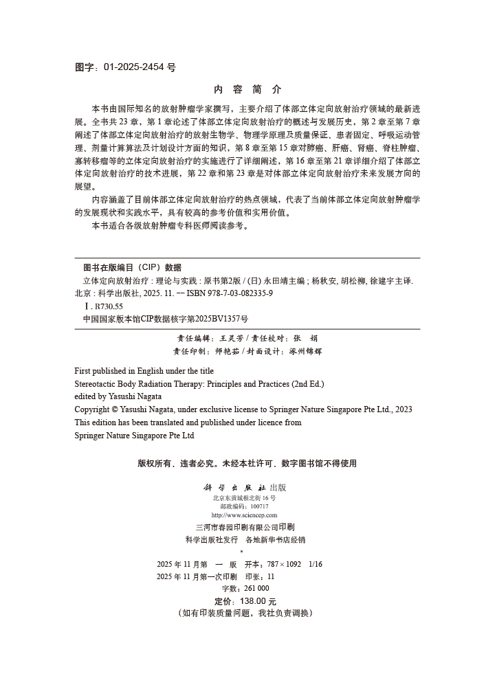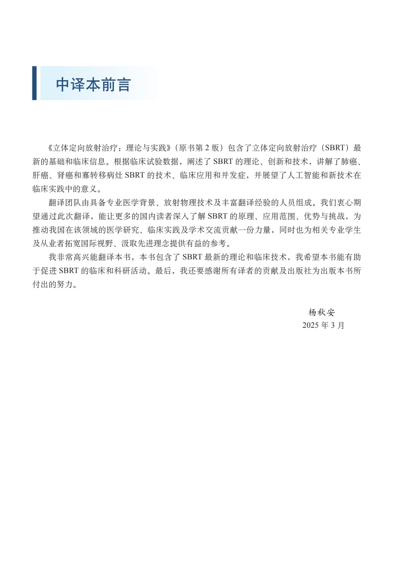 内容涵盖了目前体部立体定向放射治疗的热点领域,代表了当前体部立体定向放射肿瘤学的发展现状和实践水平,具有较高的参考价值和实用价值。