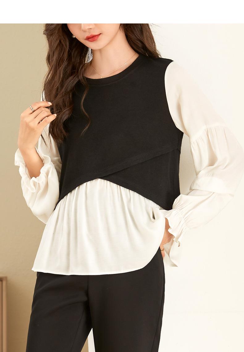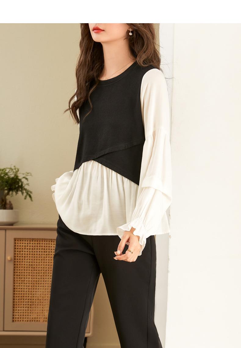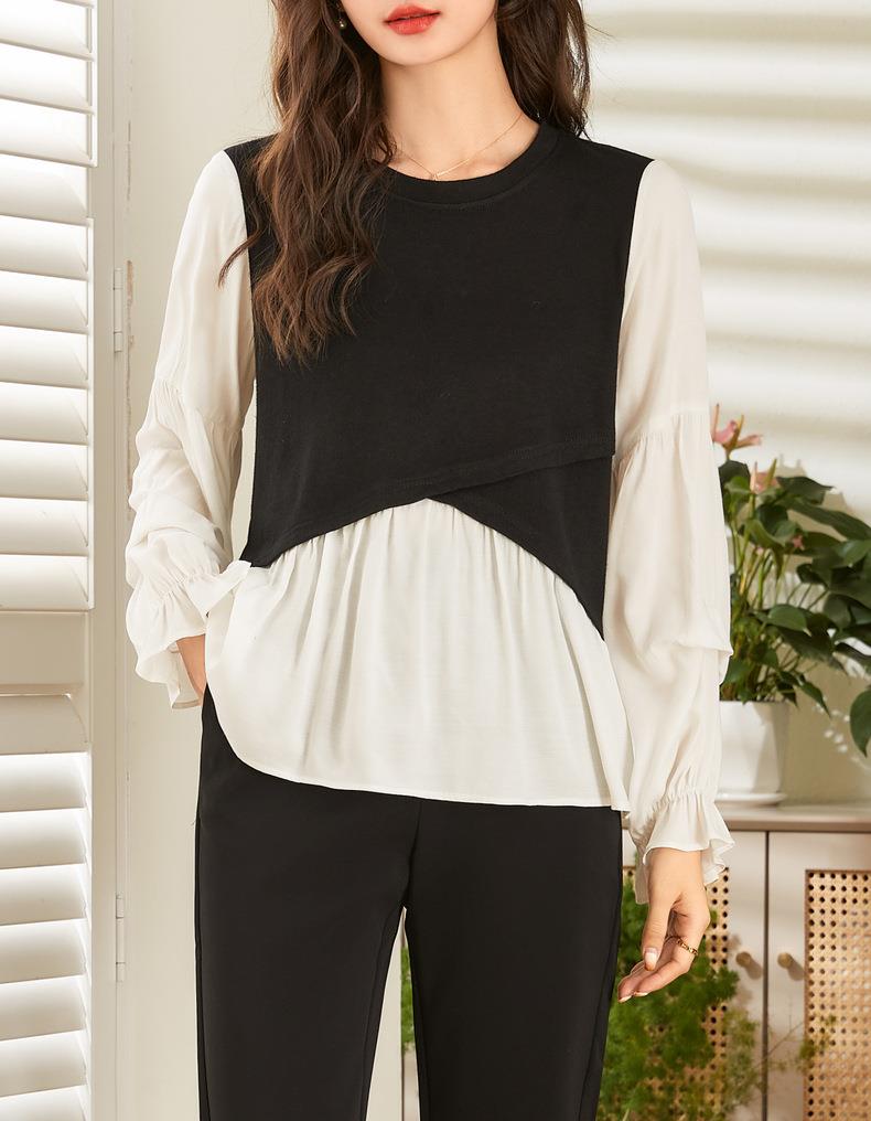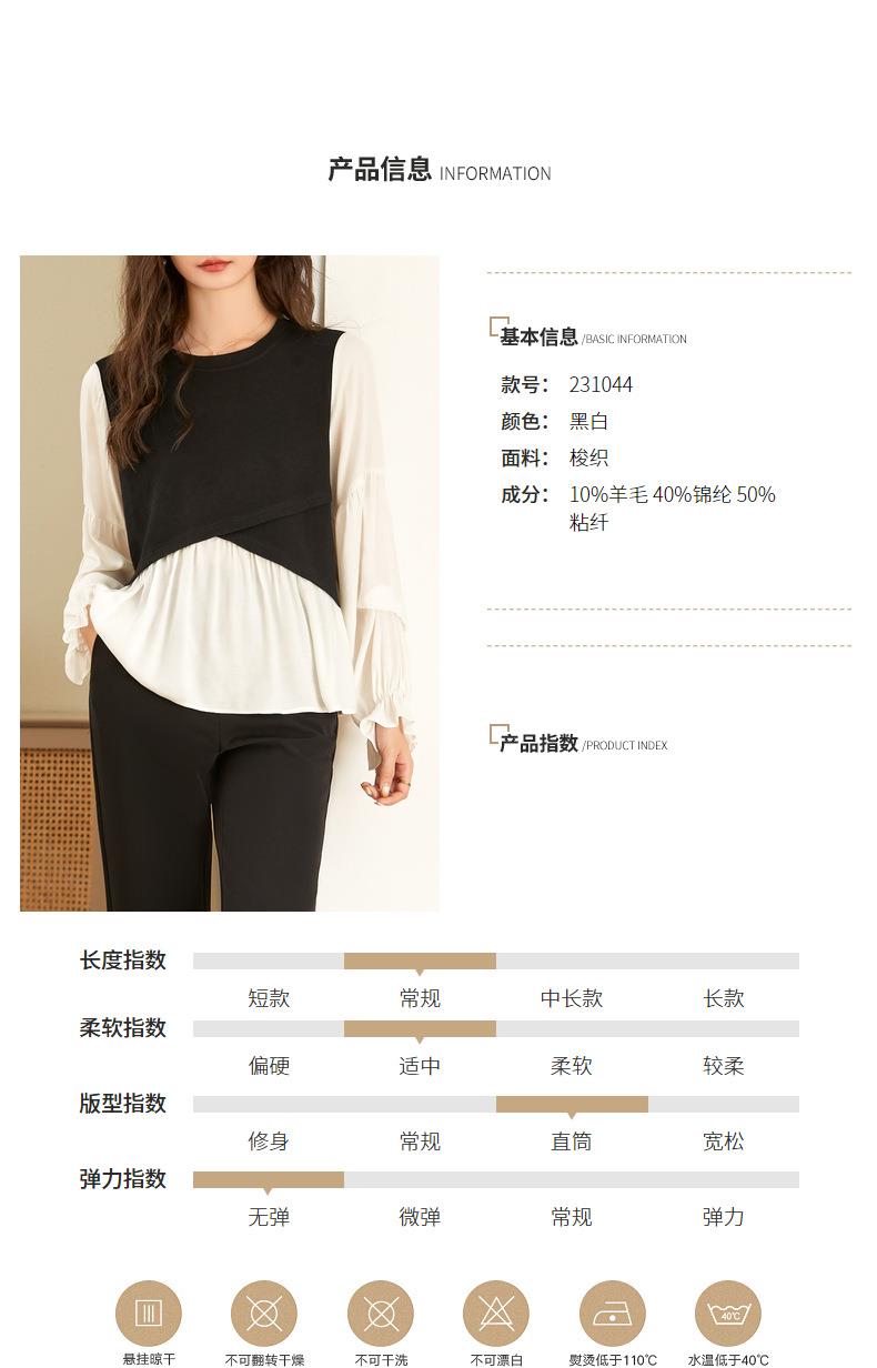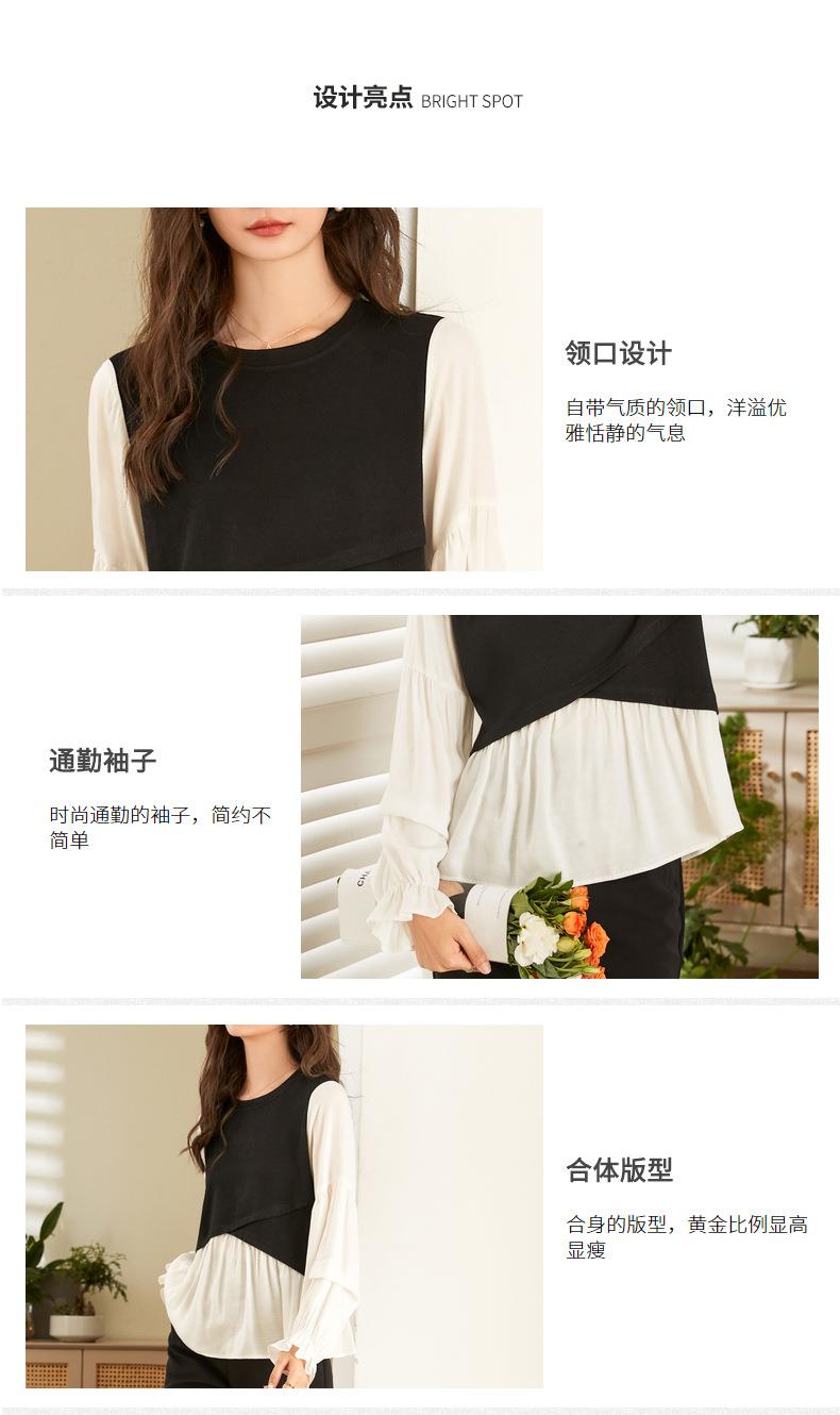 百姿 拼接喇叭袖衬衫女2023秋季新款圆领名媛风小众长袖羊毛衬衣