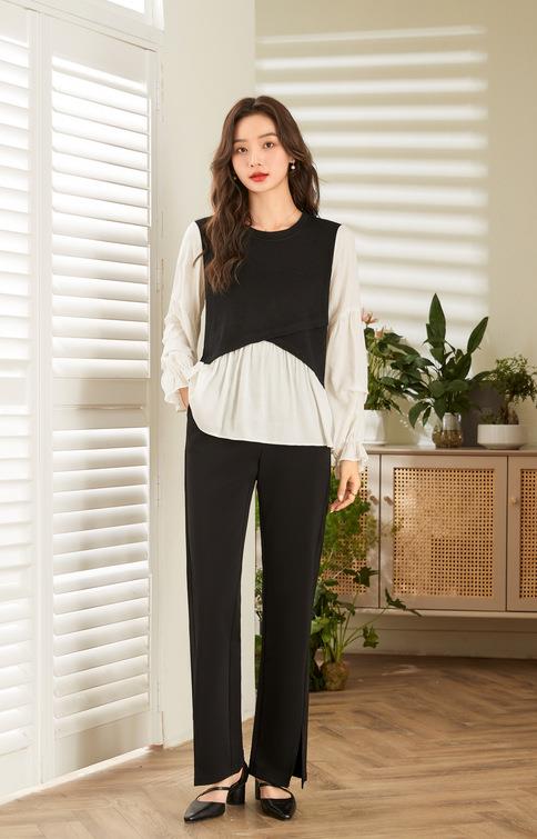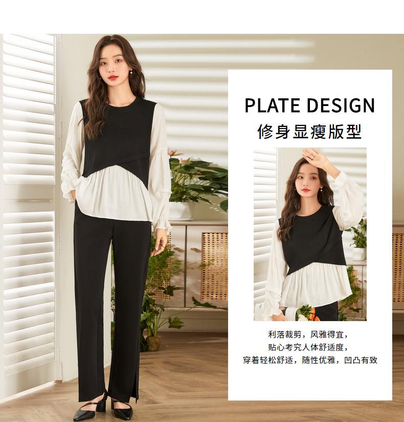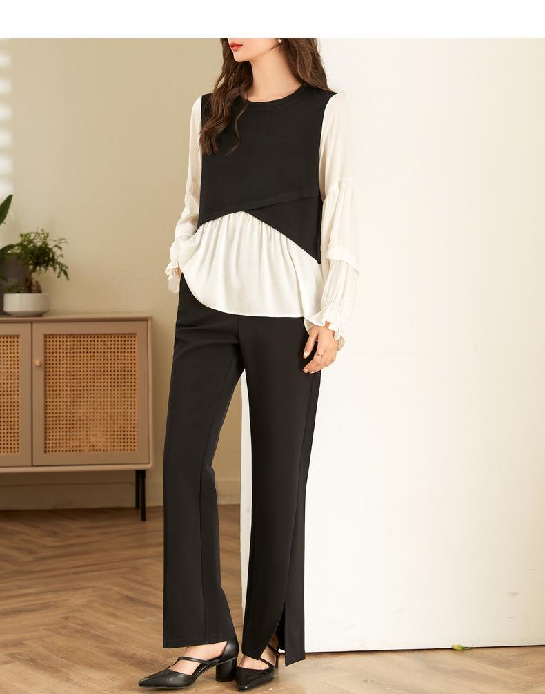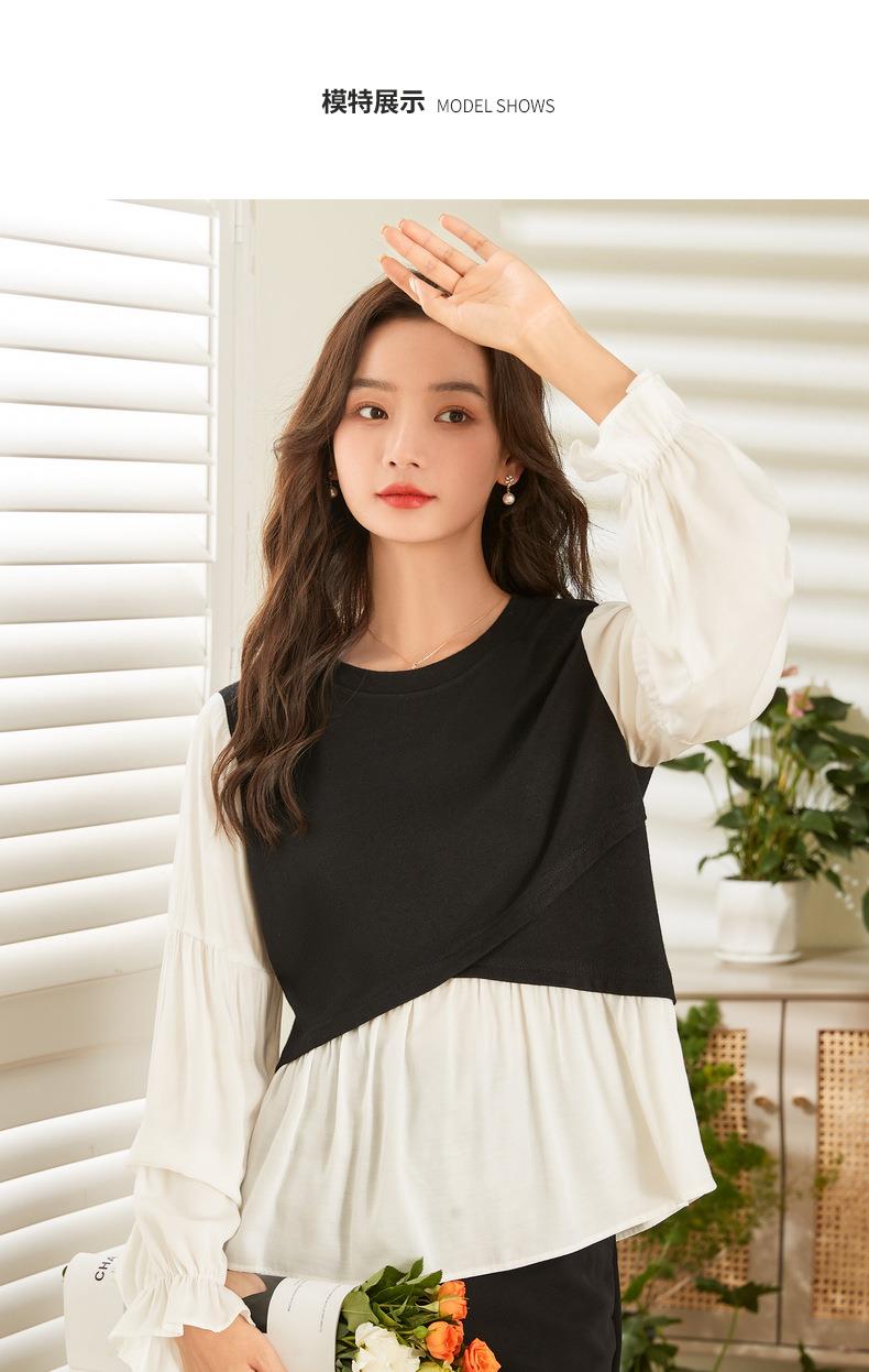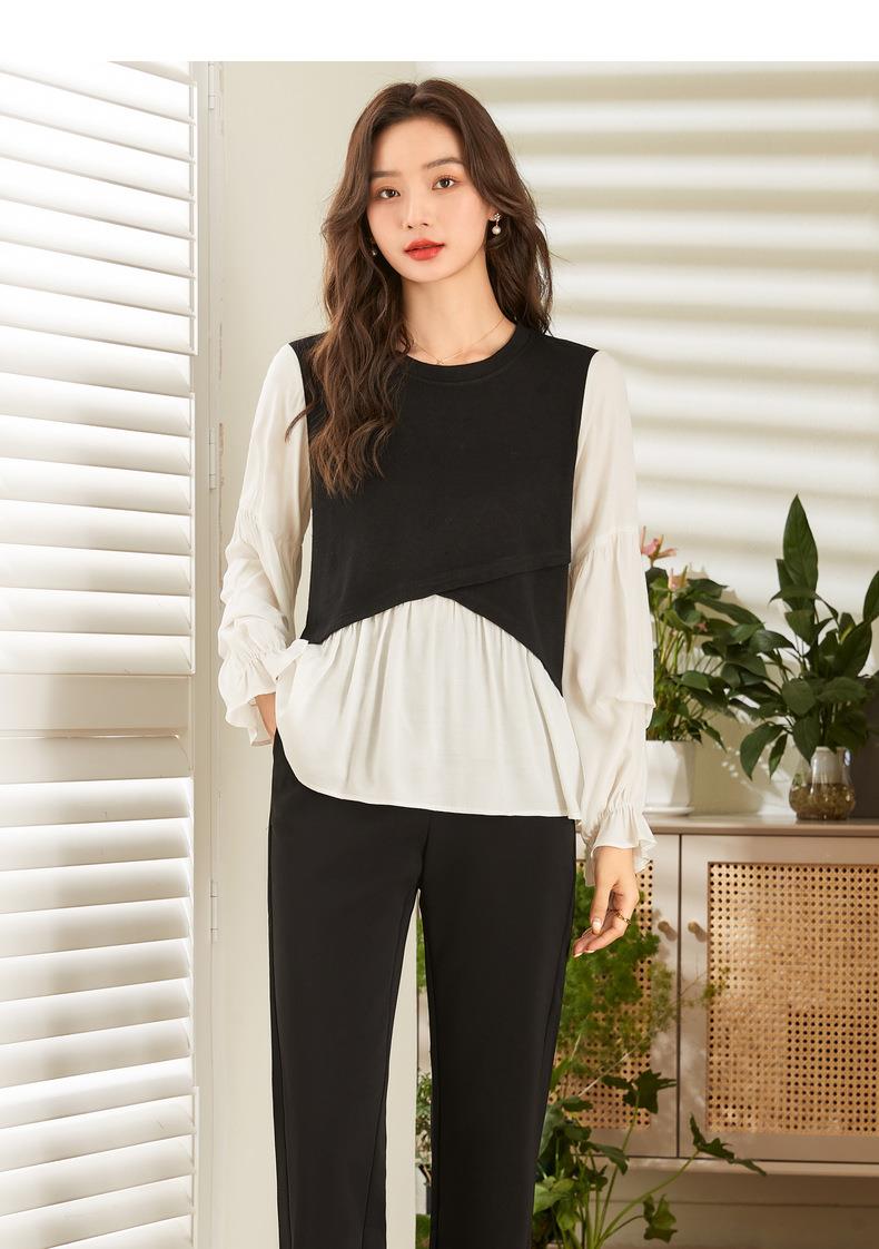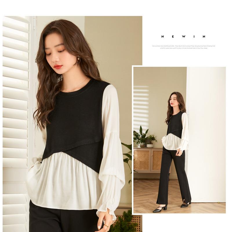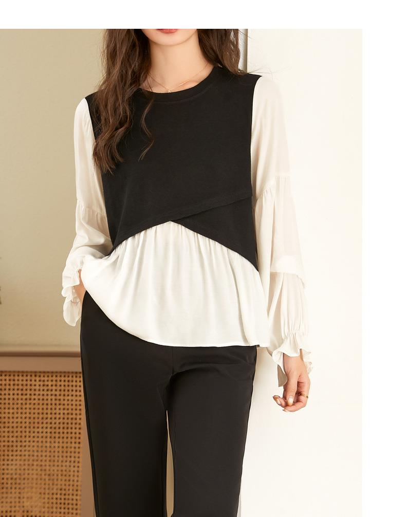 百姿 拼接喇叭袖衬衫女2023秋季新款圆领名媛风小众长袖羊毛衬衣