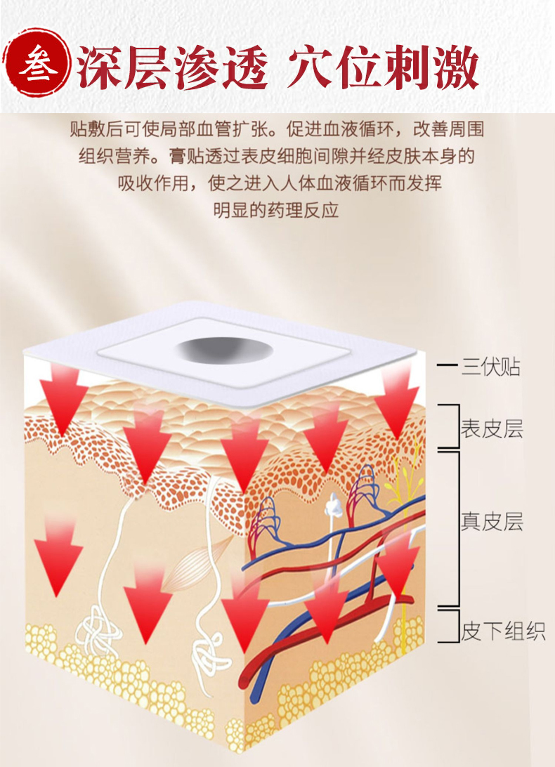 2.三伏贴是一种膏药,也是一种传统中医的治疗法、预防医学手段。三伏贴疗结合了针灸、经络与中药学,以中药直接贴敷于穴位,经由中药对穴位产生微面积化学性、热性刺激,达到治病、防病的效果。