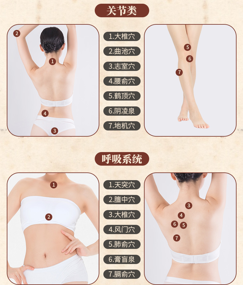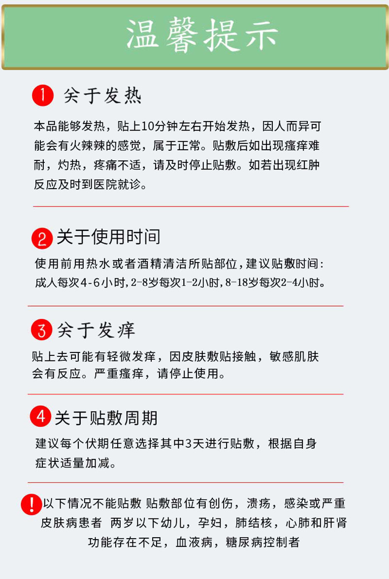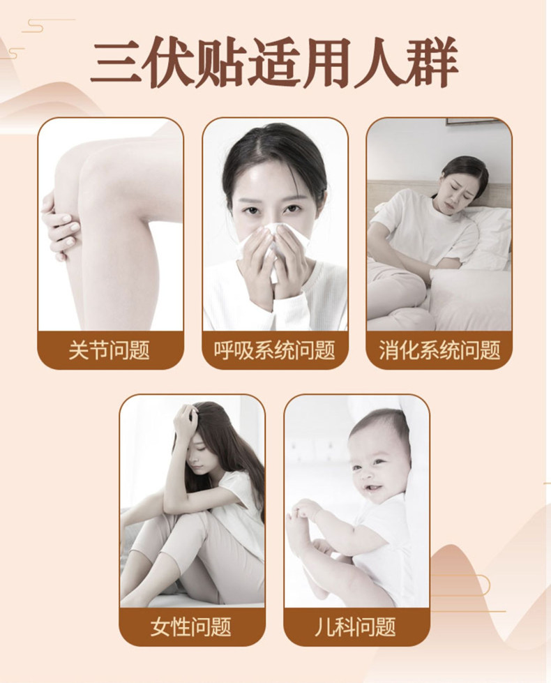 5.三伏贴适用于支气管哮喘、慢性支气管炎、支气管扩张、慢性咽炎、鼻炎、慢性阻塞性肺病、反复上呼吸道感染、肺气肿、肺心病等呼吸系统病症。女性体寒痛经; 小孩抵抗力低; 消化不好,关节疼痛,体质差等