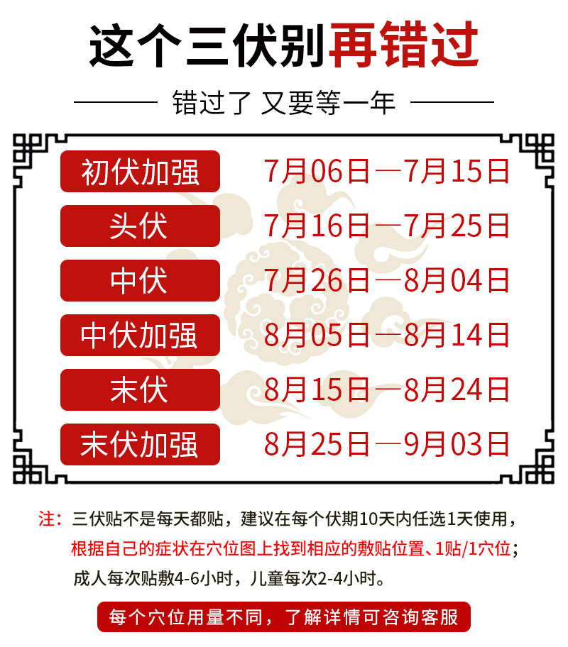 3.三根据中医“冬病夏治”的理论,对一些在冬季容易产生、复发或加重的疾病,在夏季进行扶正培本的治疗,以鼓舞正气,增加机体抗病能力,从而达到防治疾病的目的。利用天气的阳气,人体的阳气,药物的阳气,将冬天所受的寒气,从体内驱除。三伏天,人的肺脏气血畅通,药物容易深达脏腑,此时贴敷可以有效刺激穴位,使药物更好的循经导入。