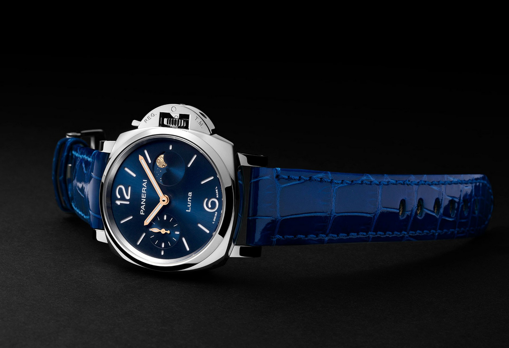 镜面材质 | 蓝宝石水晶玻璃 | 表盘 | 抛光精钢表壳 蓝色太阳放射饰纹,附夜光阿拉伯数字及小时标示。3点钟位置设月相显示,9点钟位置设小秒盘。 |