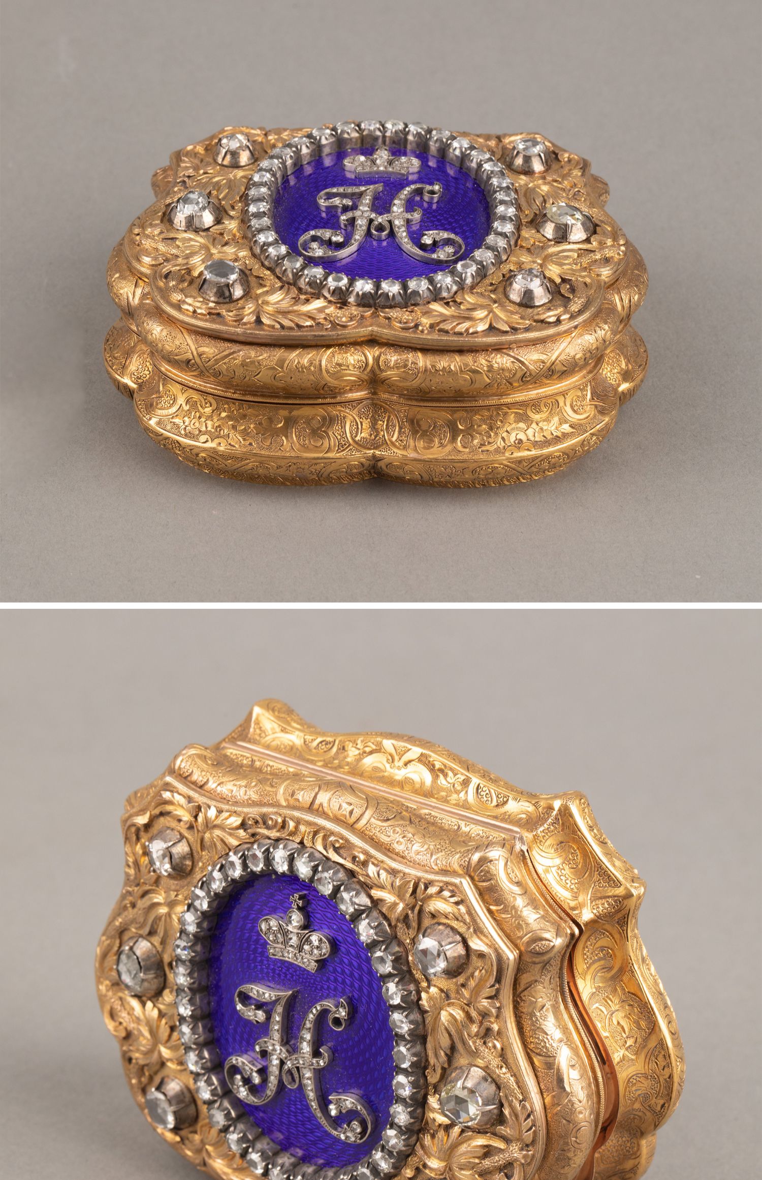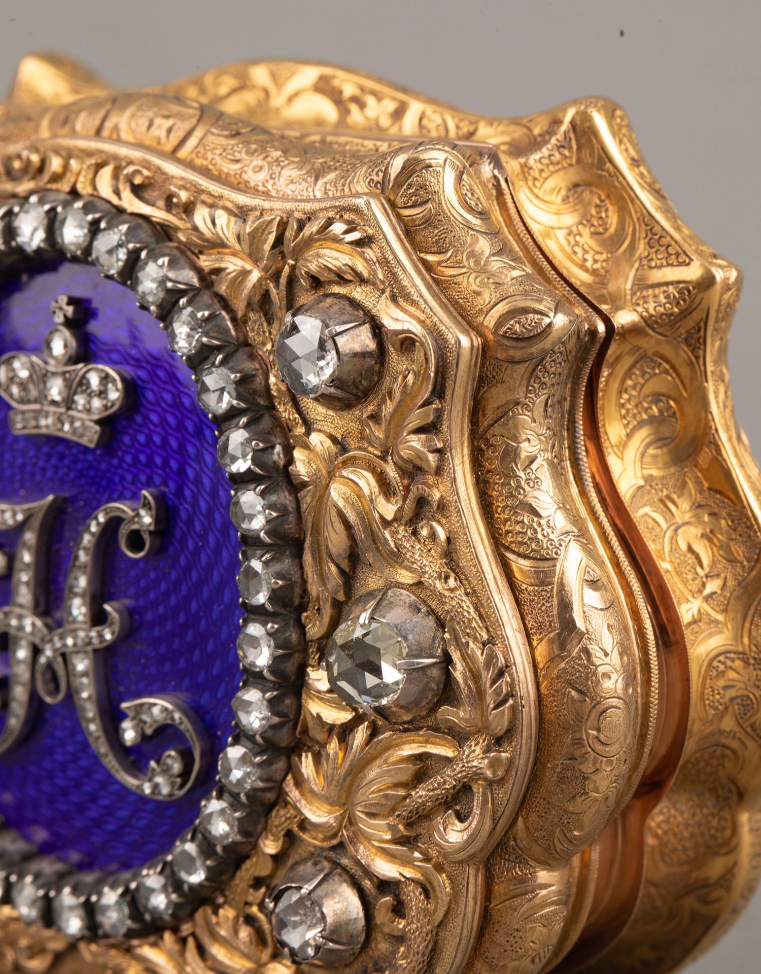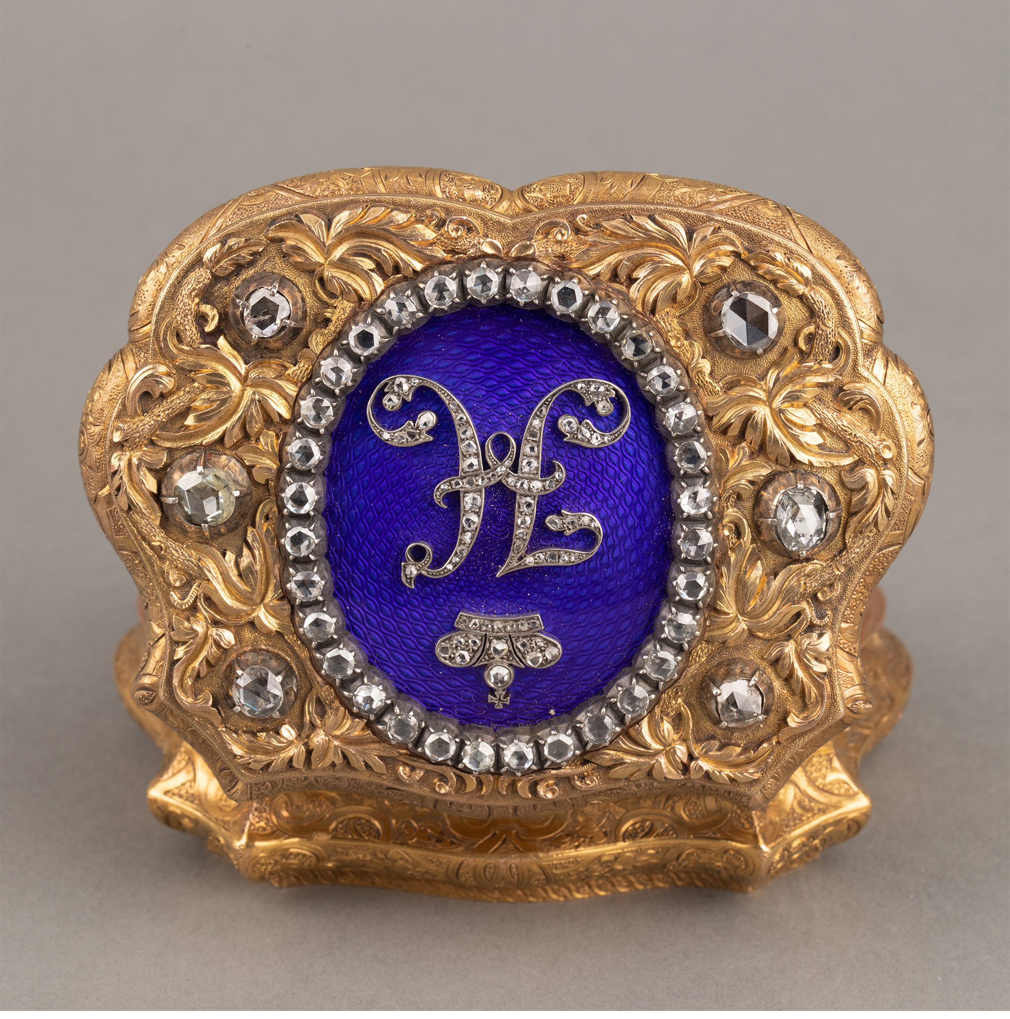 独角鹿西洋古董德国工坊出品黄金镶嵌钻石蓝色玑镂珐琅鼻烟盒