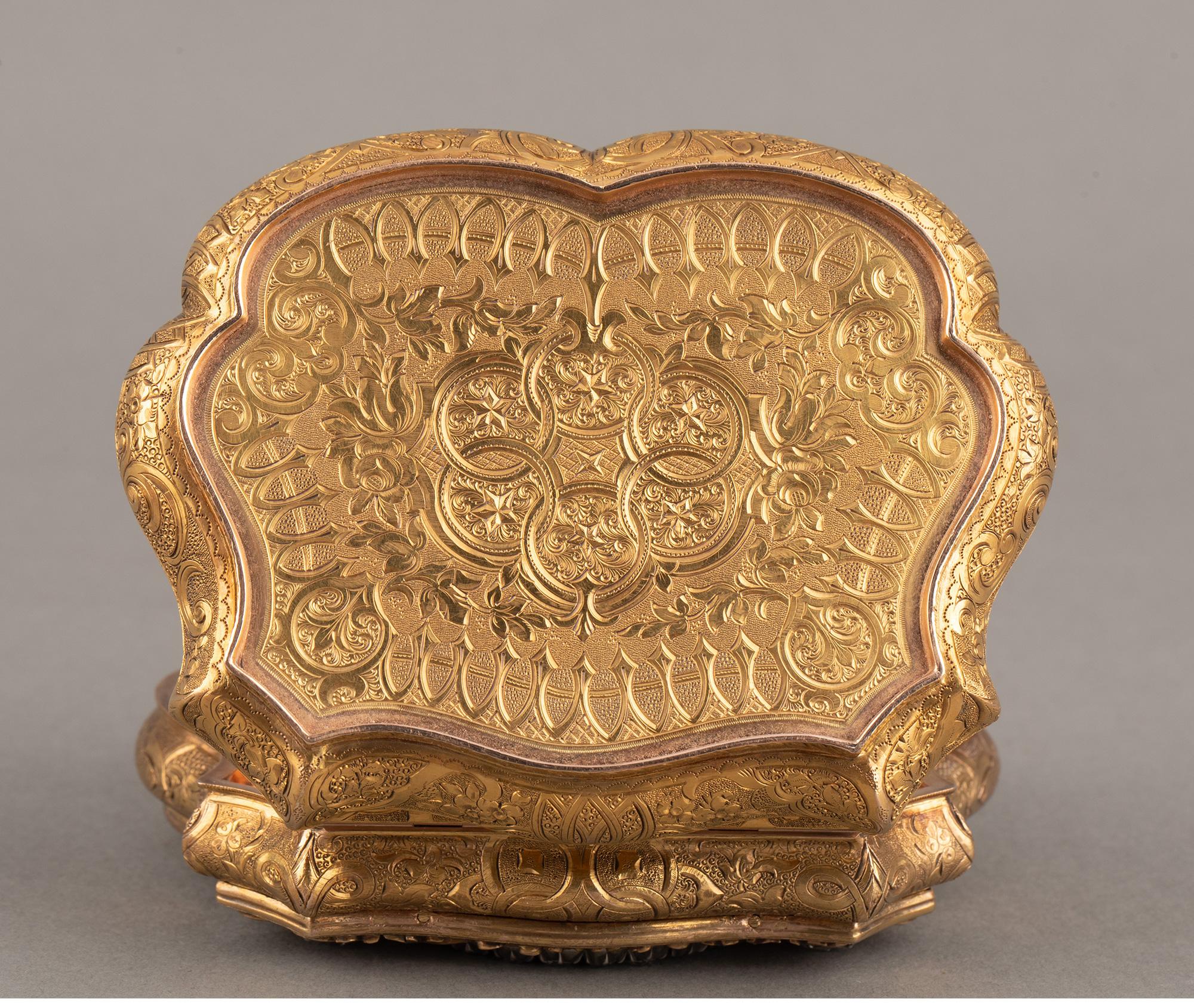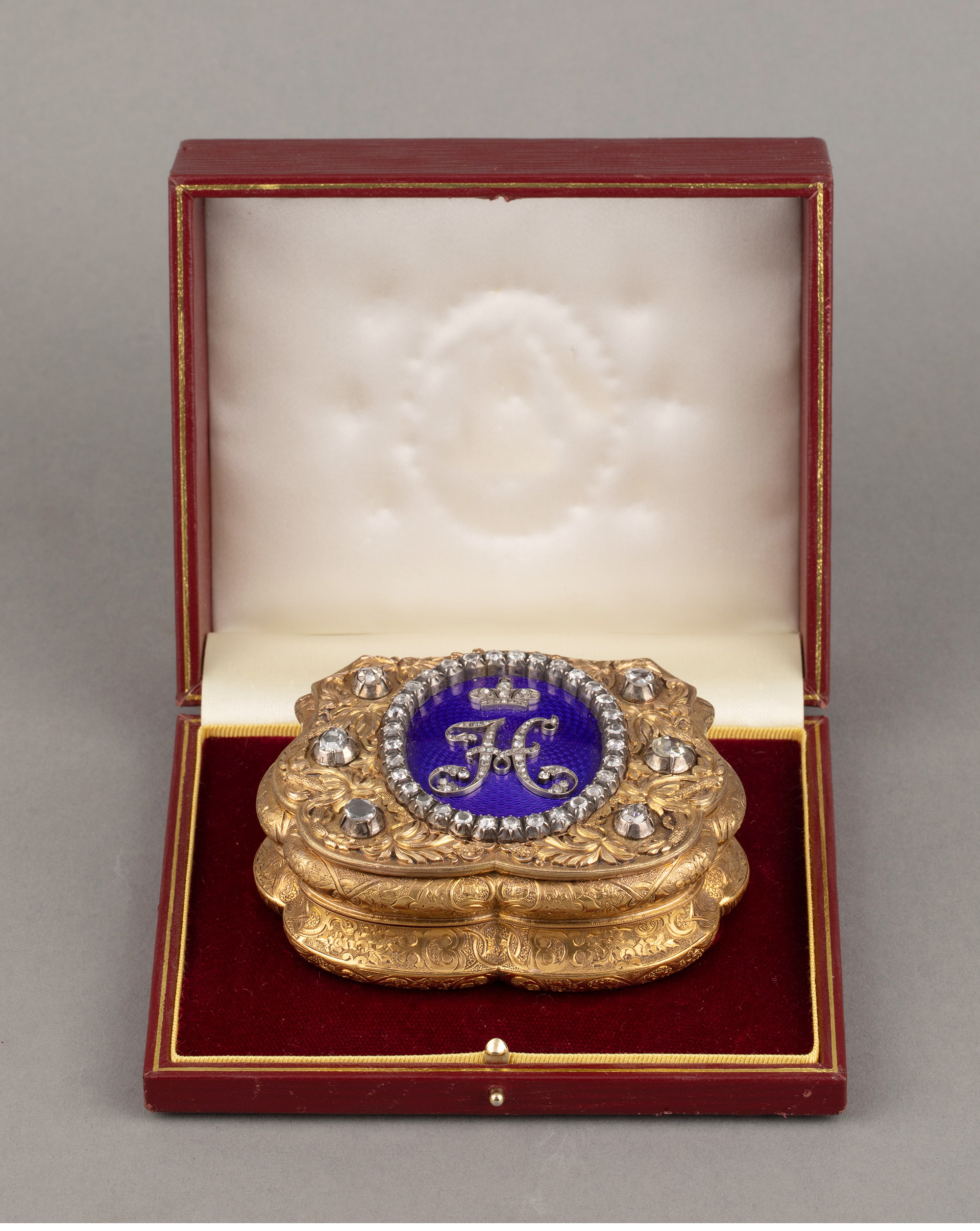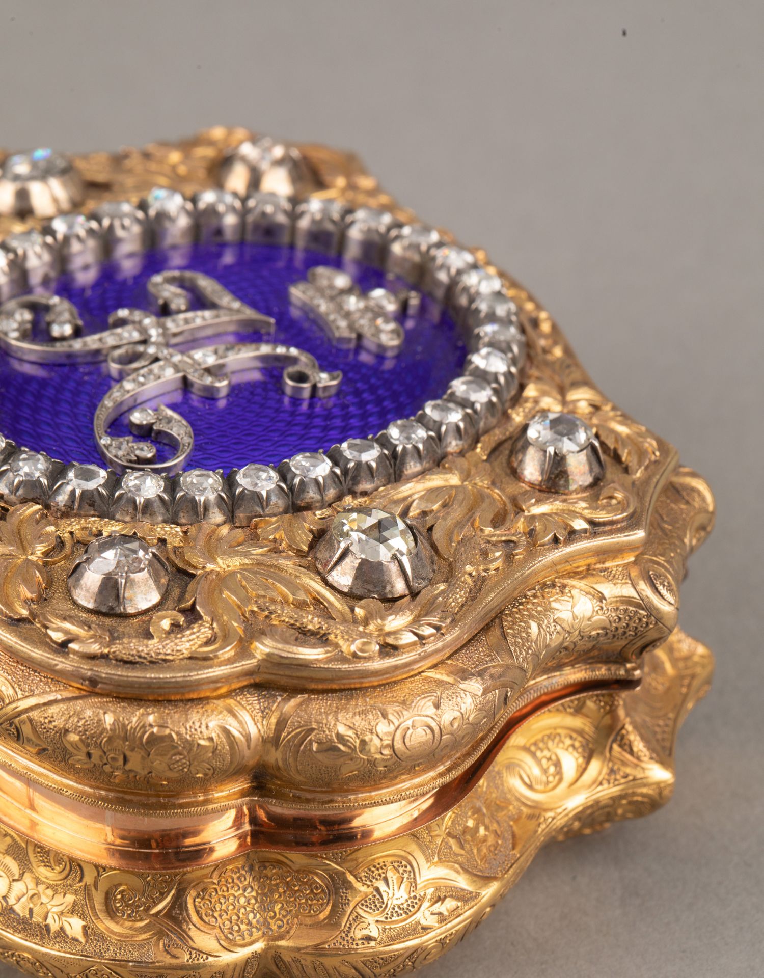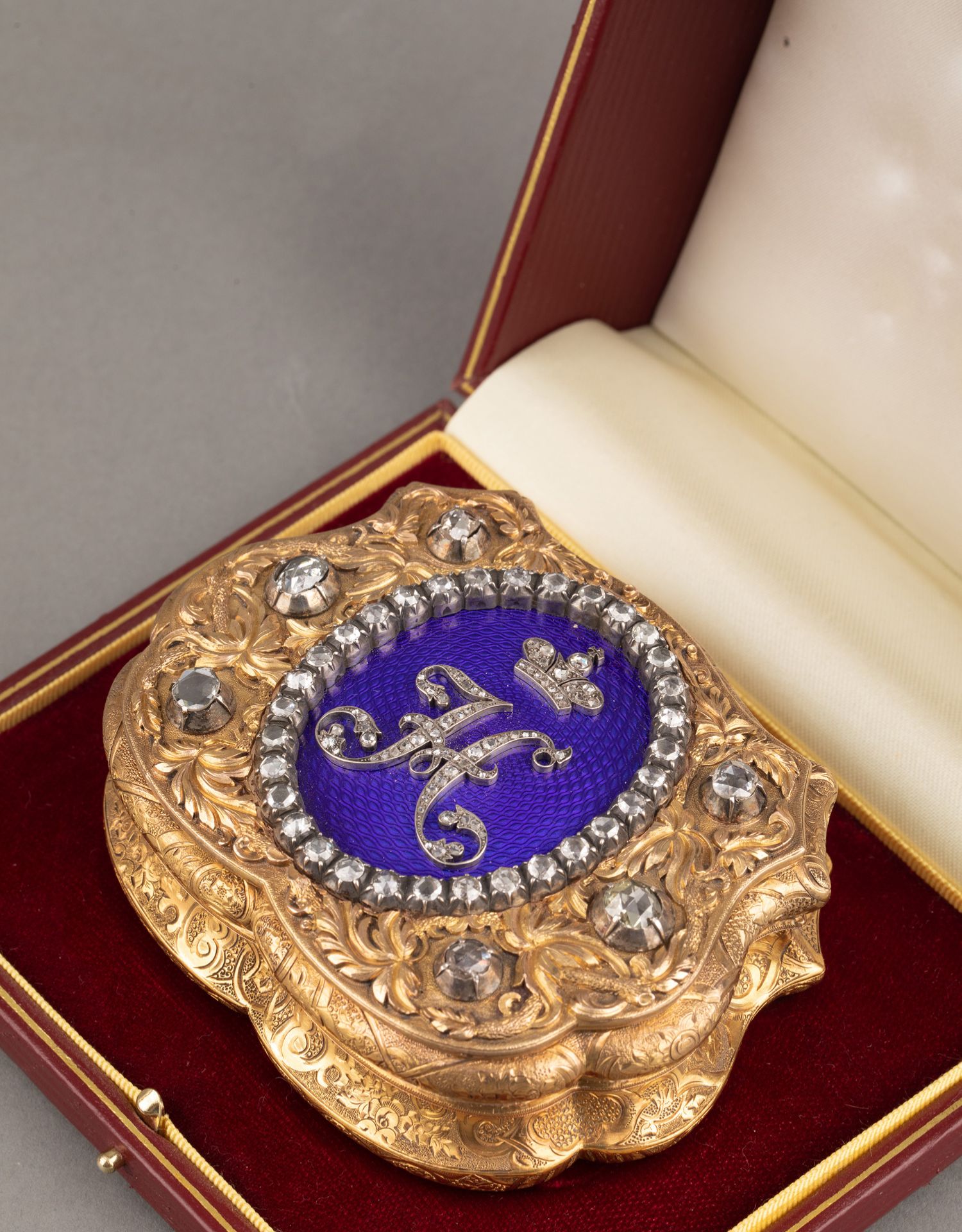 独角鹿西洋古董德国工坊出品黄金镶嵌钻石蓝色玑镂珐琅鼻烟盒