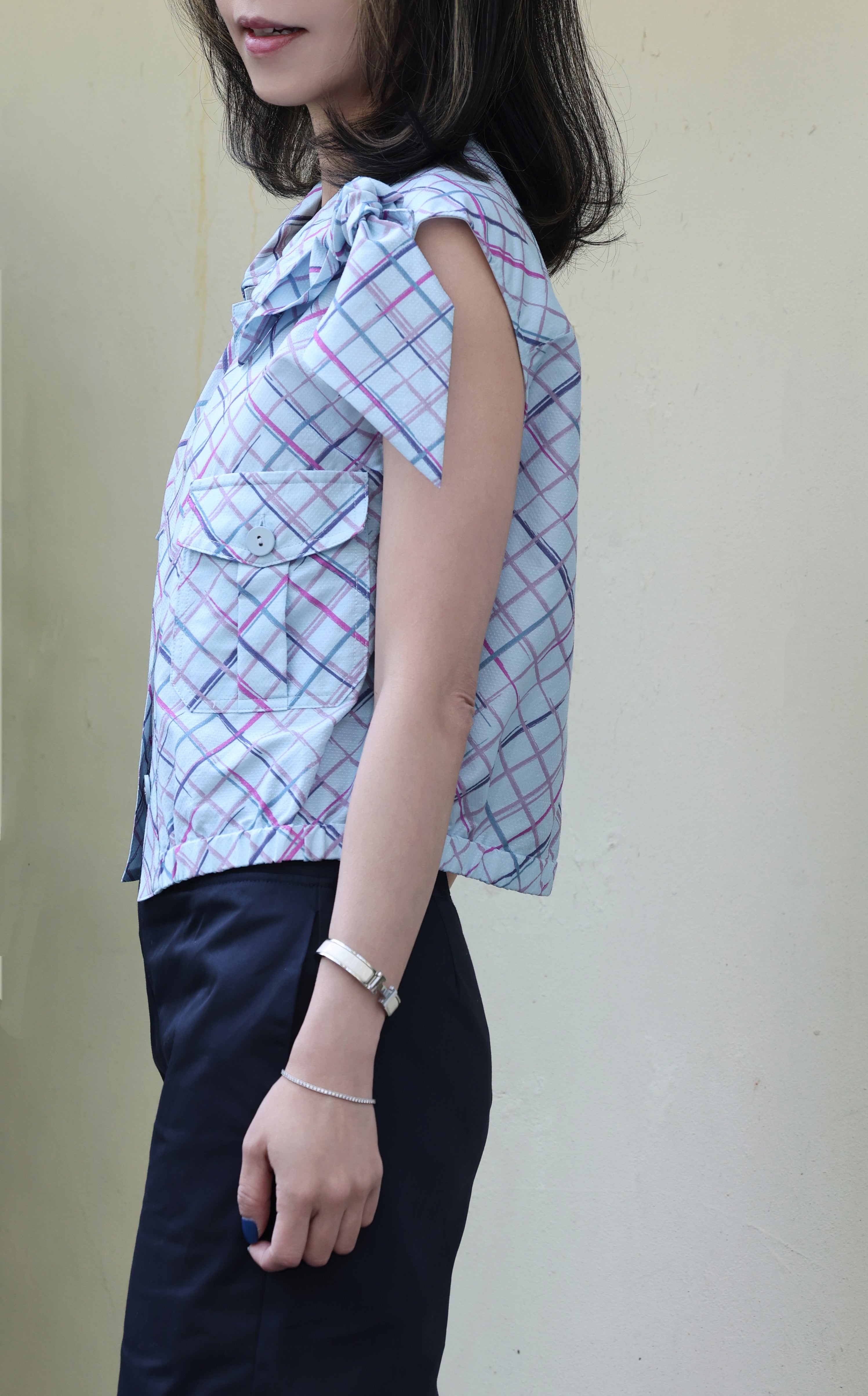 TYNVIE 肩部系带无袖工装夹克-格纹印花