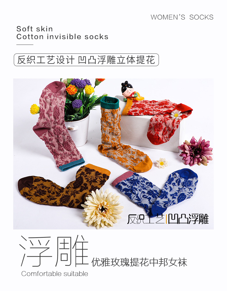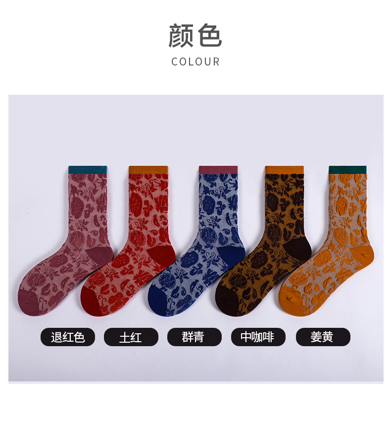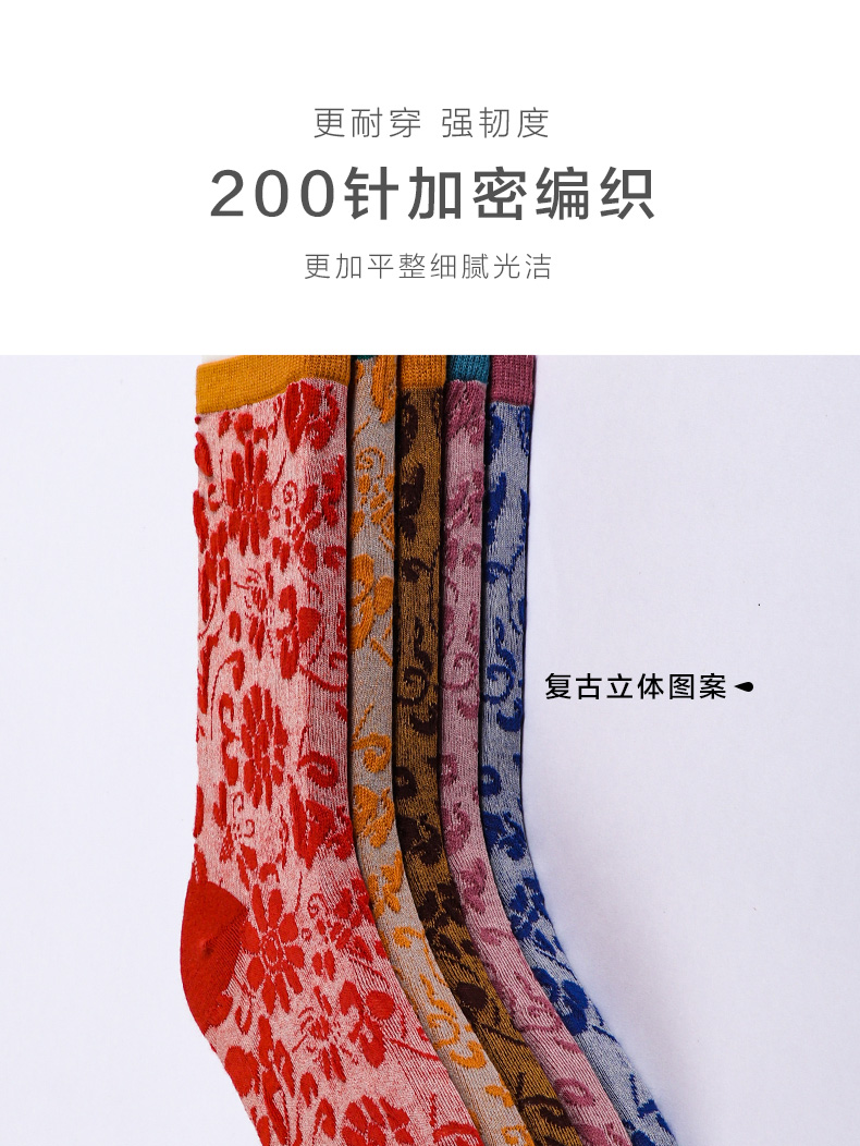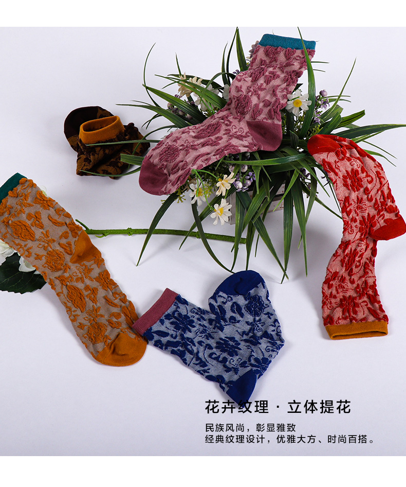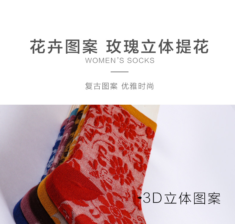 【任选6双99.5】秋冬女款棉质玫瑰浮雕反织提花民族风冬季中邦女袜