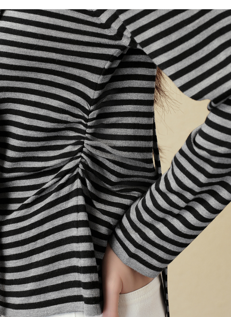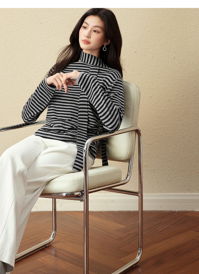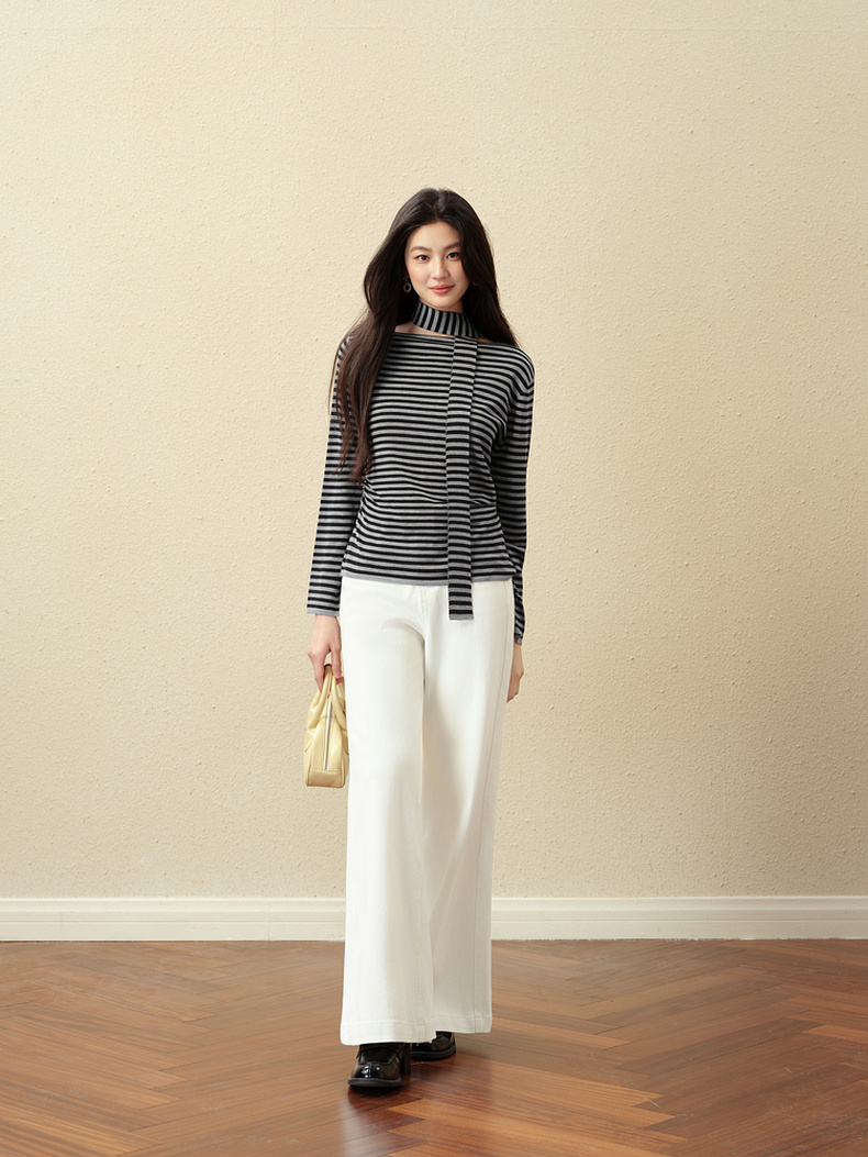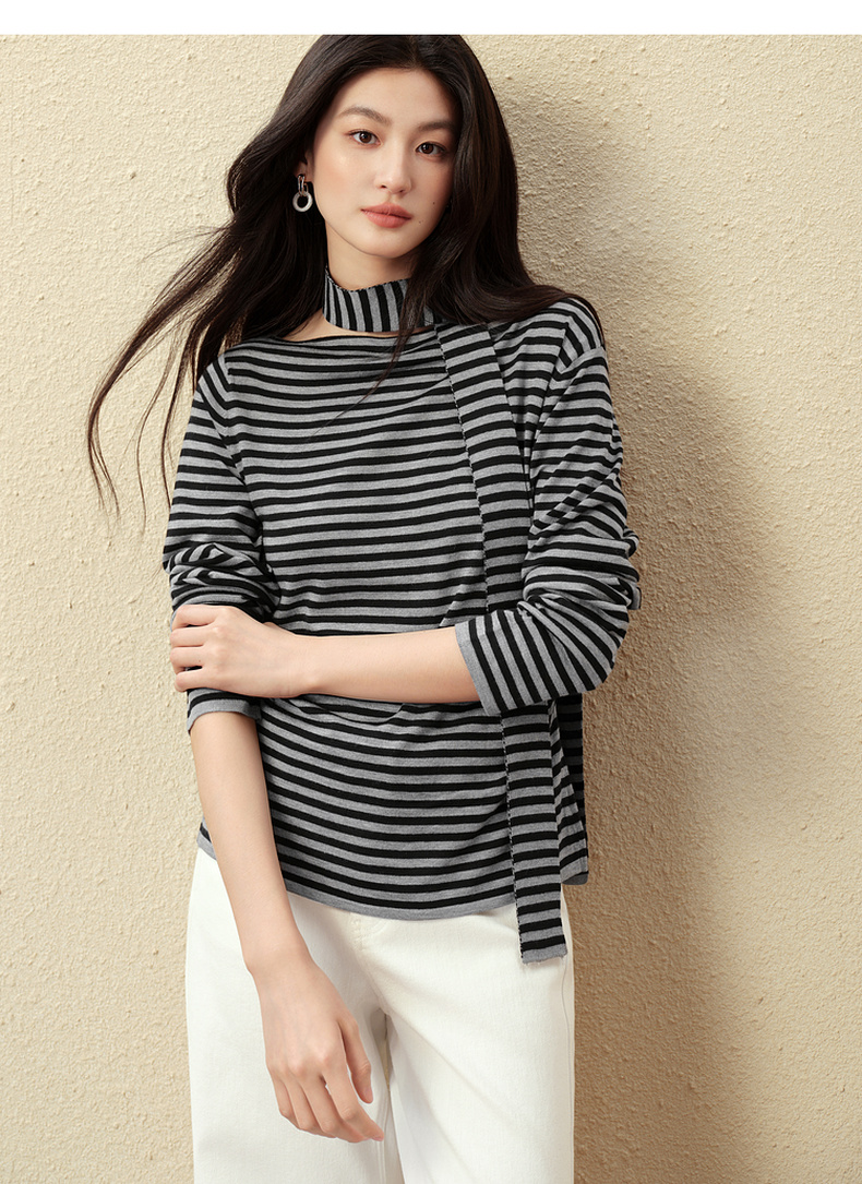 【严选】诗凡黎经典条纹飘带针织衫2025秋新款收腰修身显瘦百搭长袖打底衫7G8131021-1