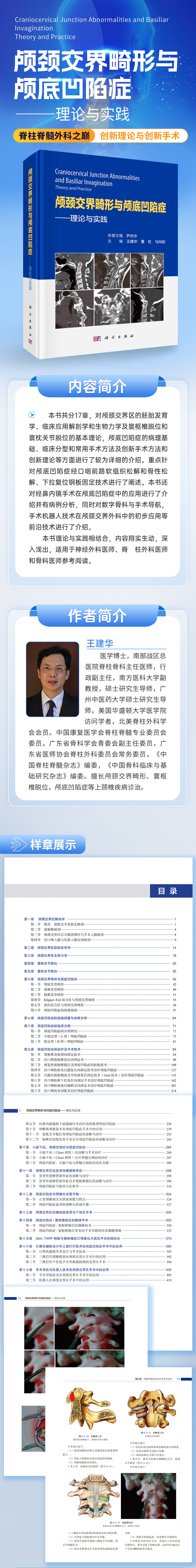 本书共分17章,对颅颈交界区的胚胎发育学、临床应用解剖学和生物力学及寰枢椎脱位和寰枕关节脱位的基本理论,颅底凹陷症的病理基础、临床分型和常用手术方法及创新手术方法和创新理论等方面进行了较为详细的介绍。重点针对颅底凹陷症经口咽前路软组织松解和骨性松解、下拉复位钢板固定技术进行了阐述。本书还对经鼻内镜手术在颅底凹陷症中的应用进行了介绍并有病例分析,同时对数字骨科与手术导航,手术机器人技术在颅颈交界外科中的初步应用等前沿技术进行了介绍。