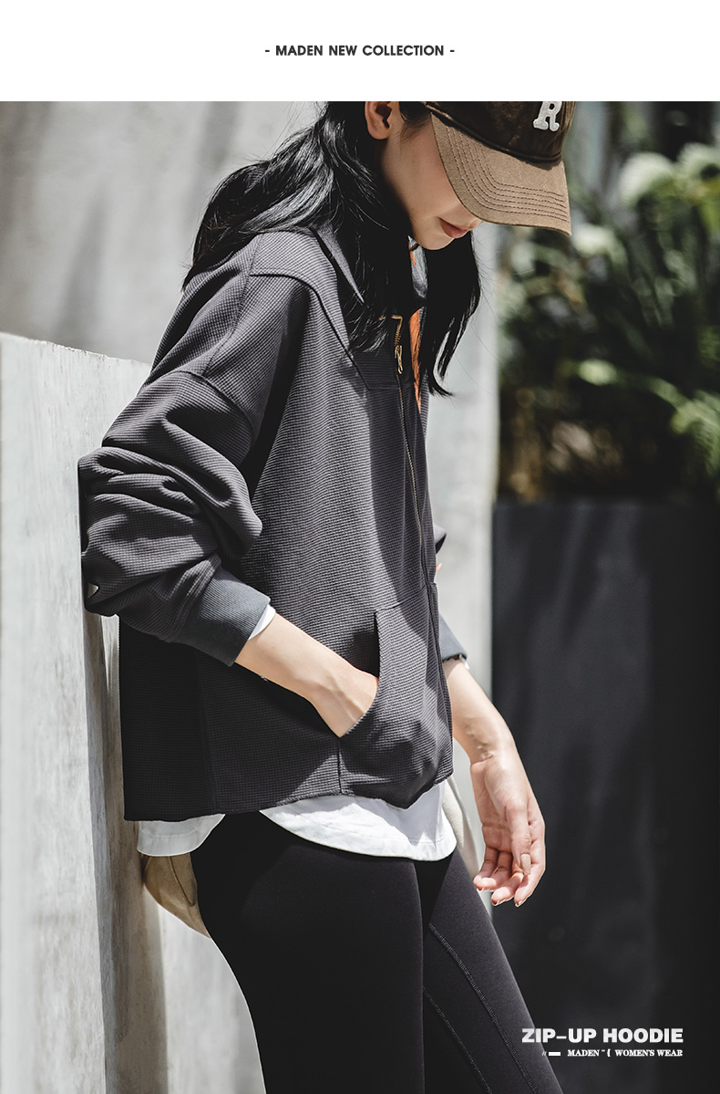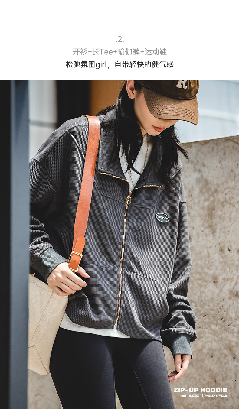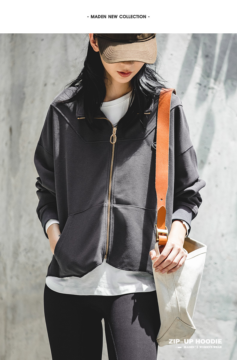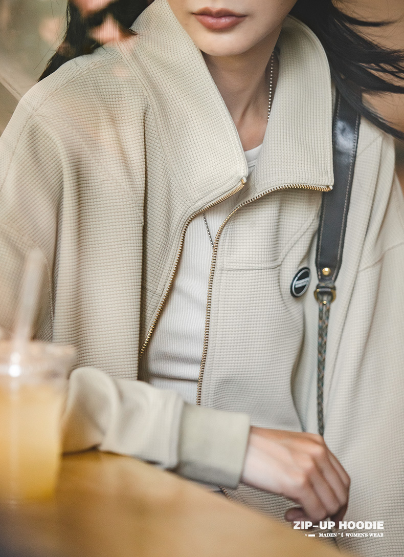 马登女装盐系氛围感半高立领拉链卫衣华夫格罗纹袖口休闲外套早秋