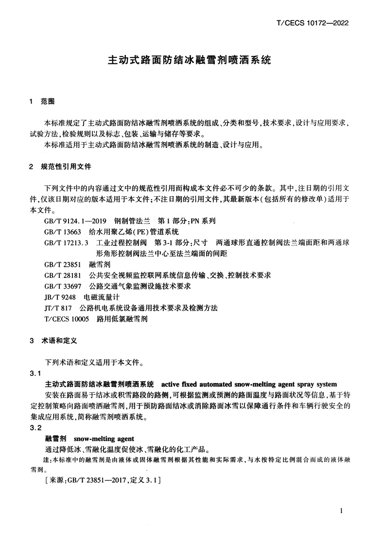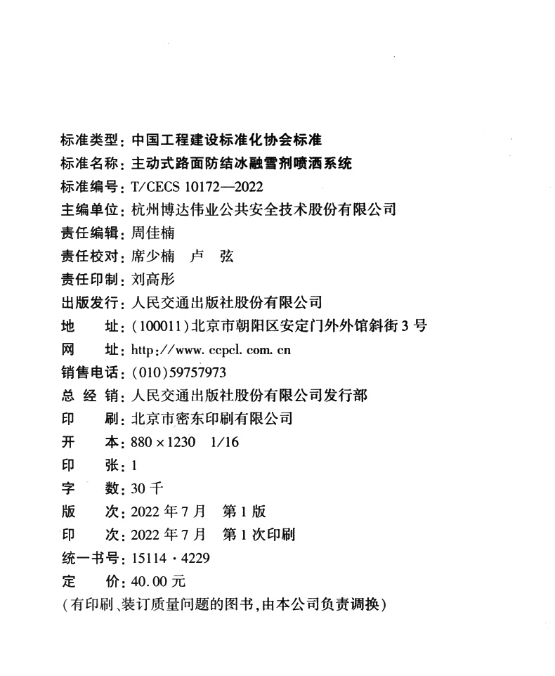 书名:主动式路面防结冰融雪剂喷洒系统(T/CECS 10172—2022)