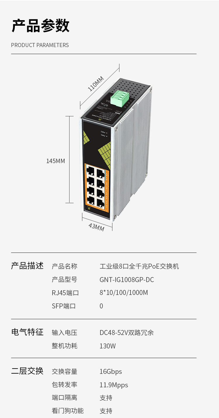 工业级8口全千兆POE交换机 IG1008GP-DC