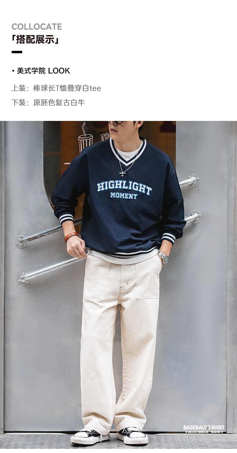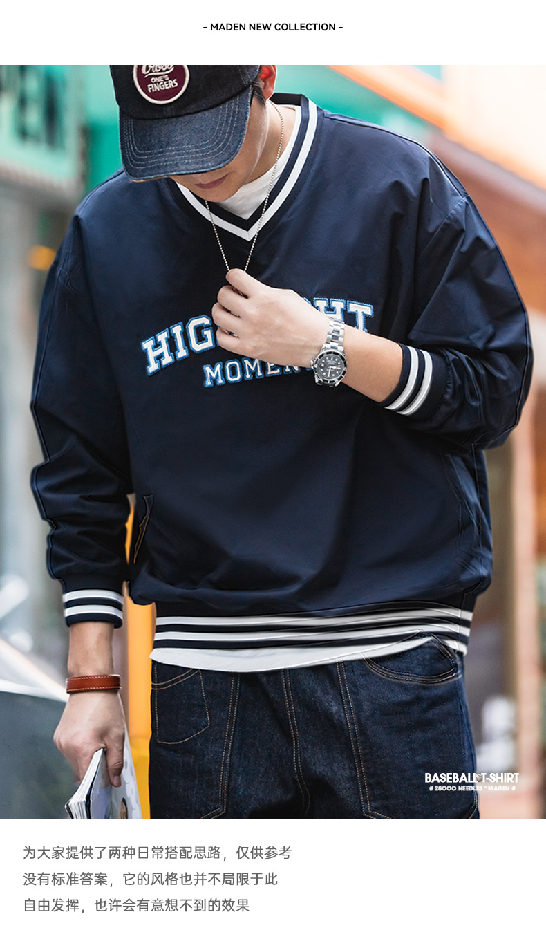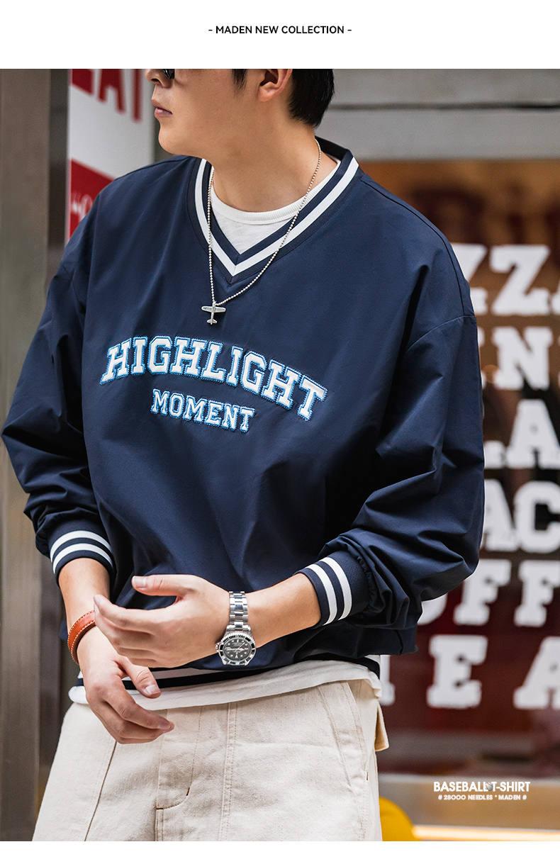 马登工装美式复古字母刺绣V领棒球服运动街头落肩长袖T恤卫衣男秋