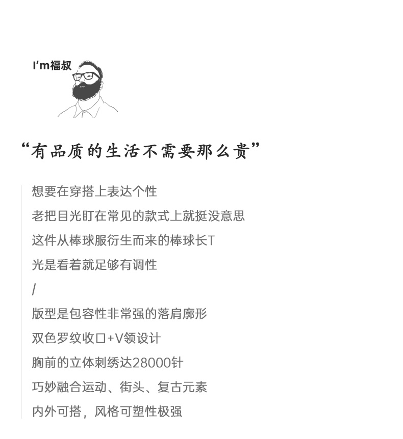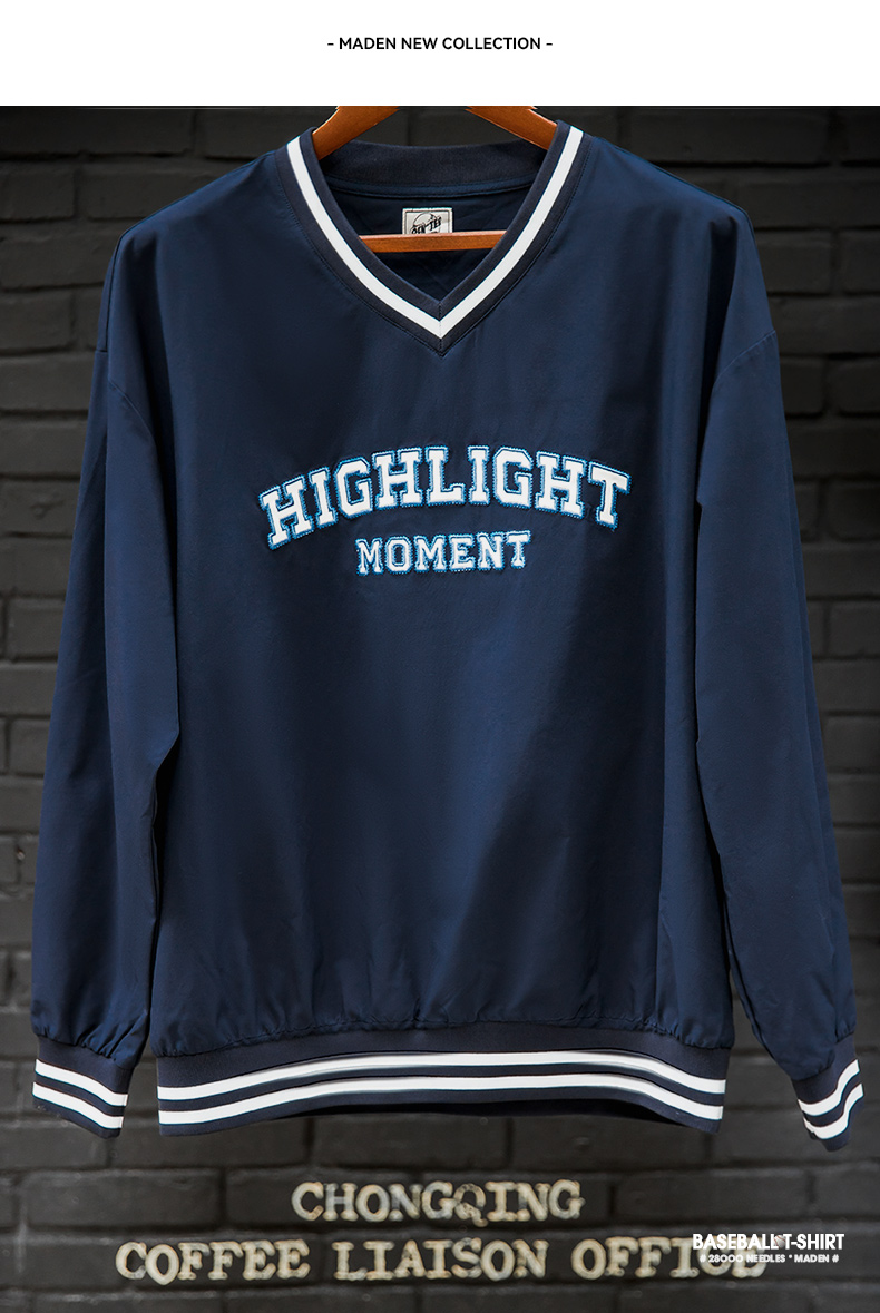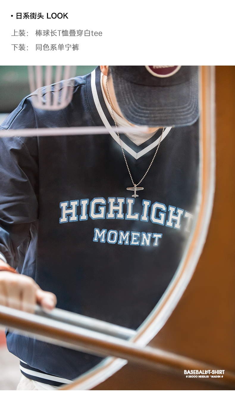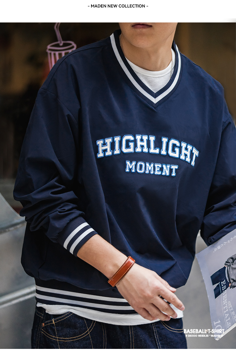 马登工装美式复古字母刺绣V领棒球服运动街头落肩长袖T恤卫衣男秋