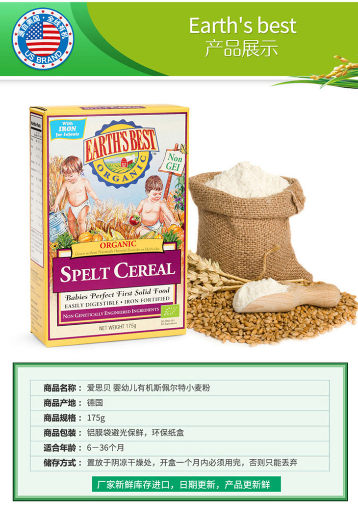 一般贸易· 爱思贝Earths Best婴幼儿有机斯佩耳特小麦粉 175g/盒(适合:6-36个月宝宝)