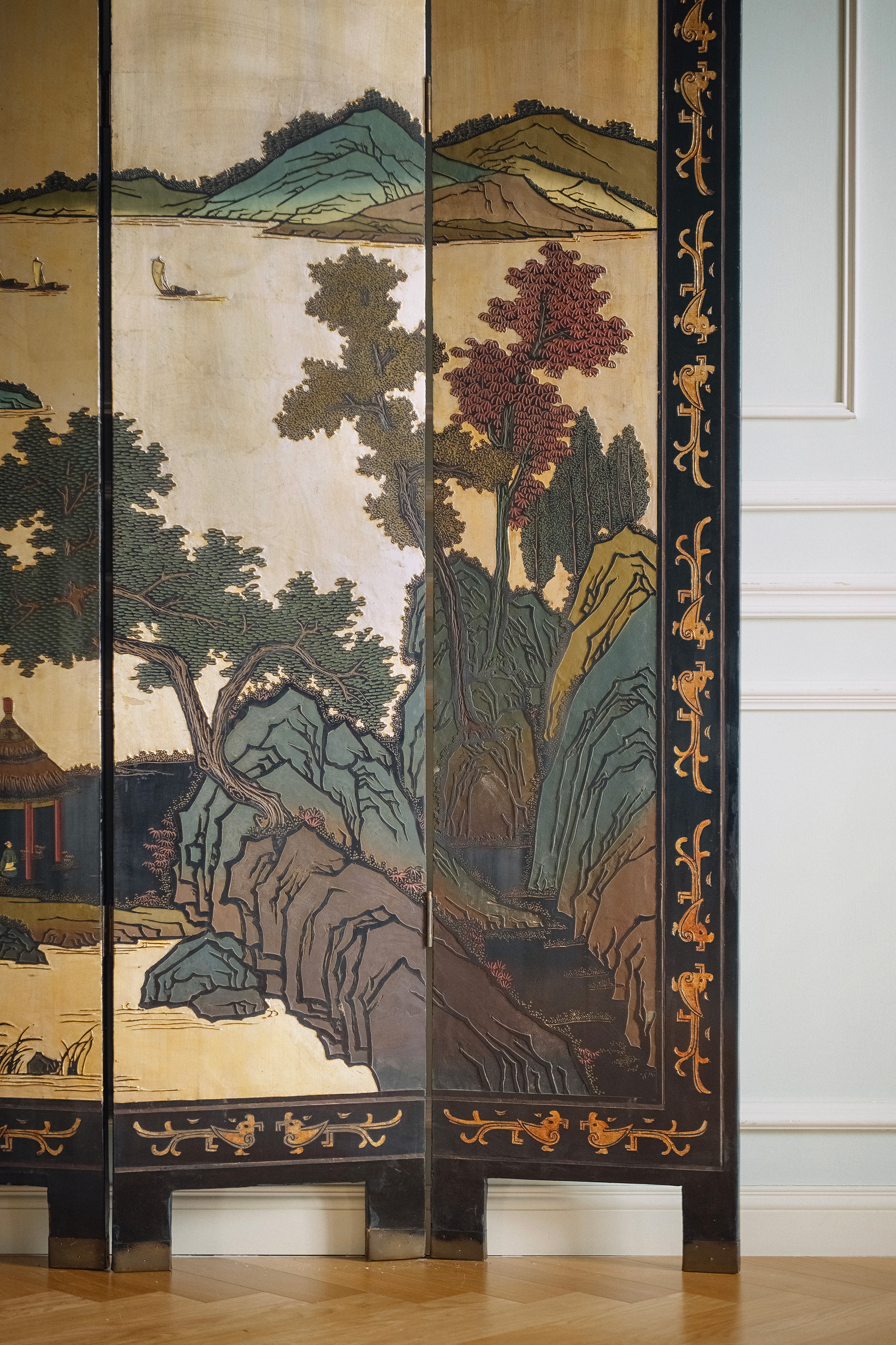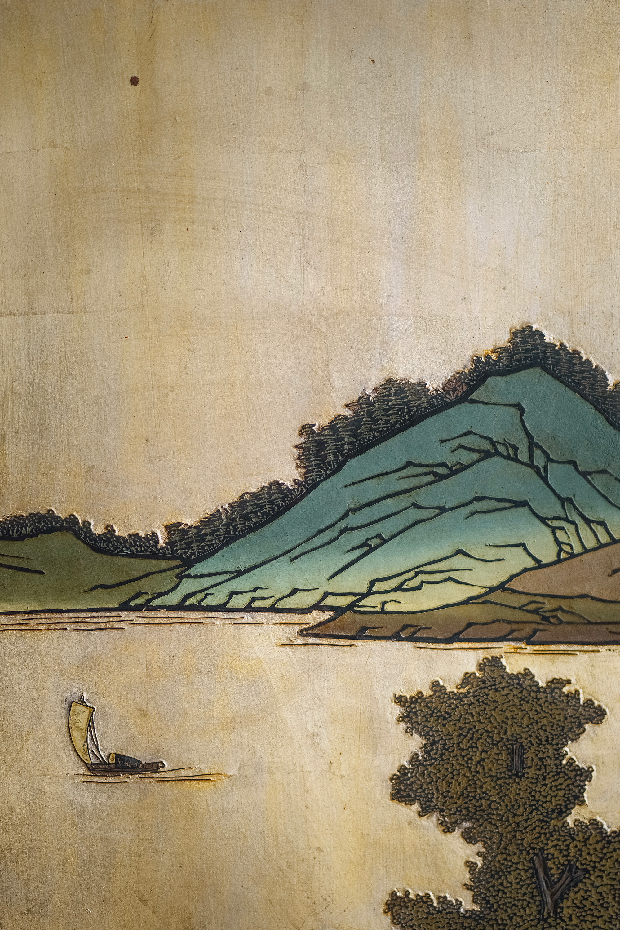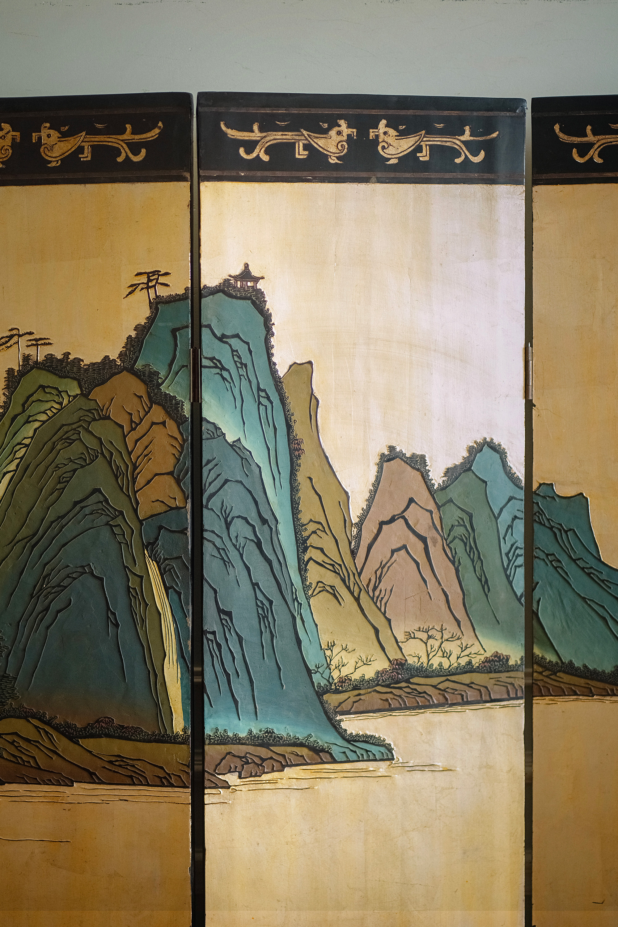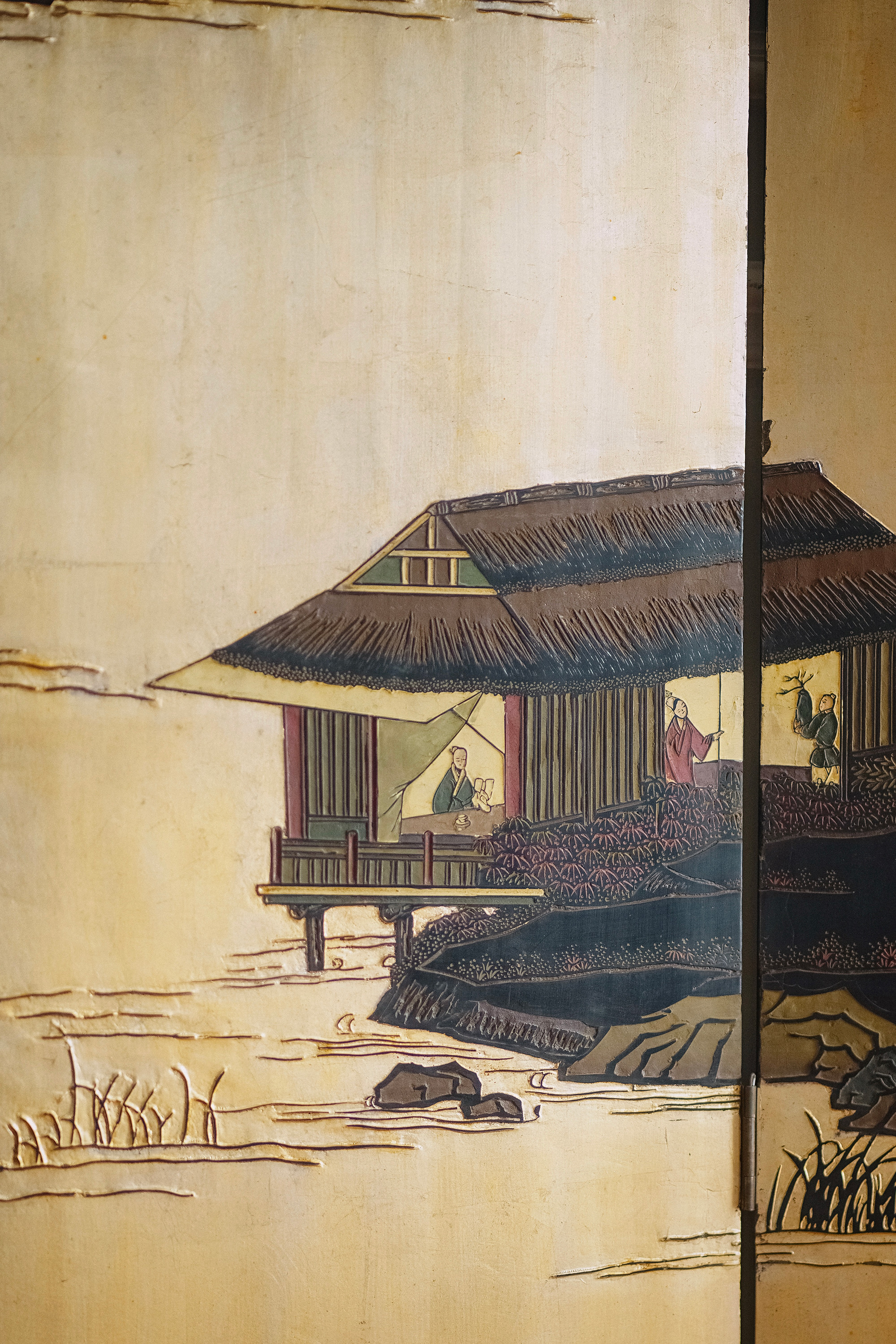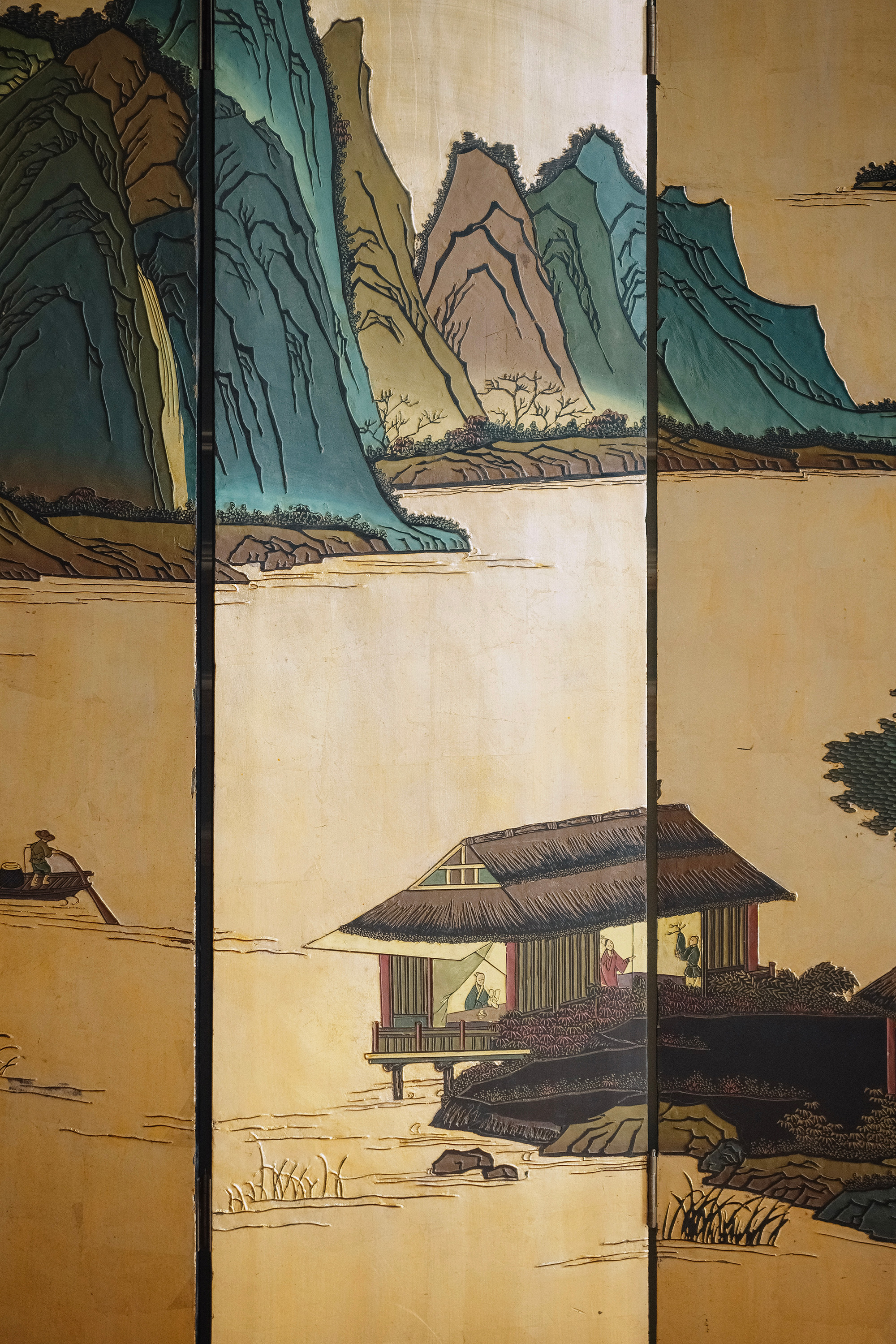 20世纪中国出品传统山水亭台主题金地款彩雕漆双面六曲屏风