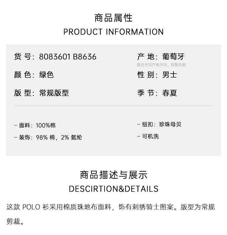 BURBERRY 巴宝莉 男士马术骑士徽标刺绣棉质短袖polo衫 绿色 8083601 B8636