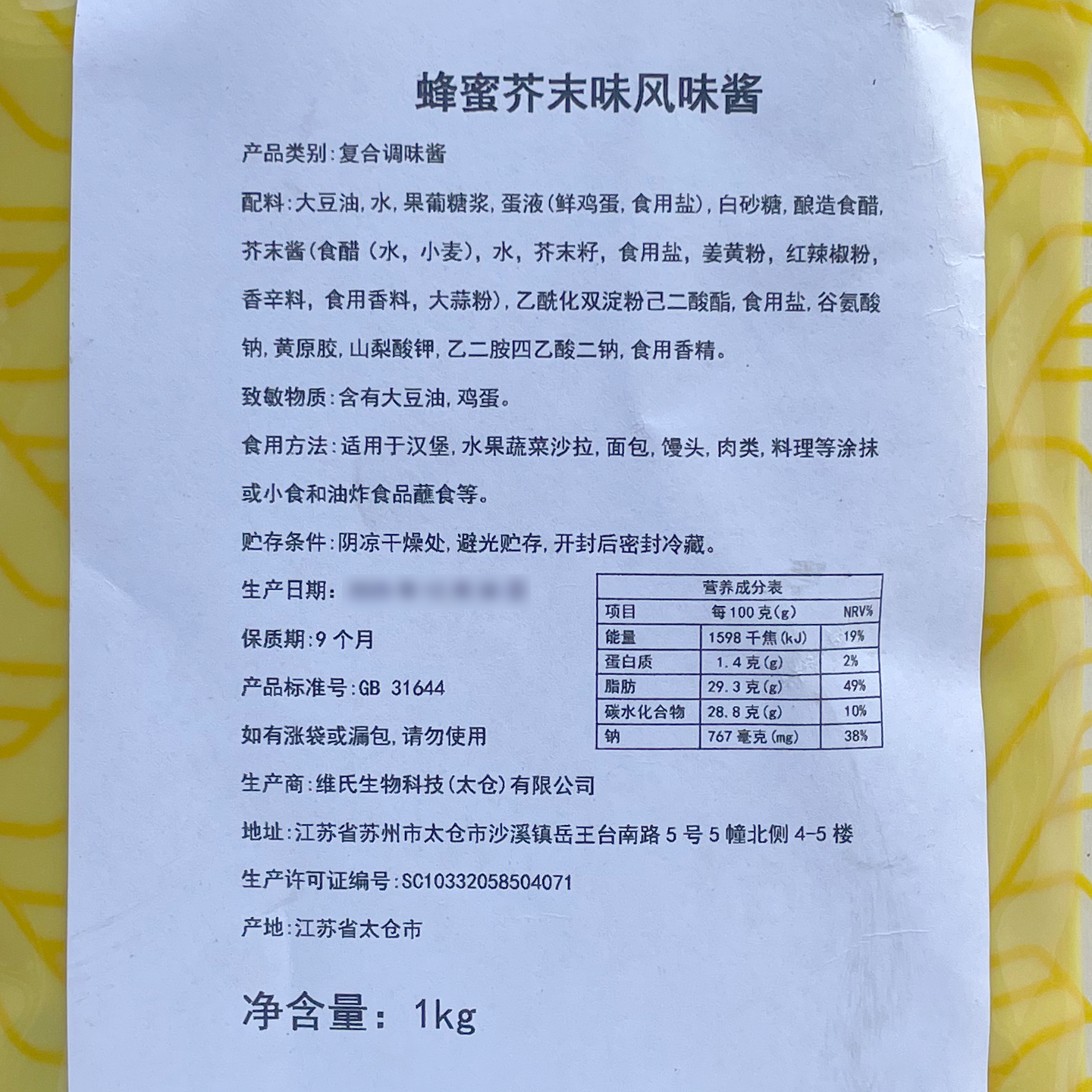 维氏星球蜂蜜芥末味风味酱1kg韩式炸鸡沙拉酱 汉堡寿司三明治 黄芥末蘸酱专用酱料