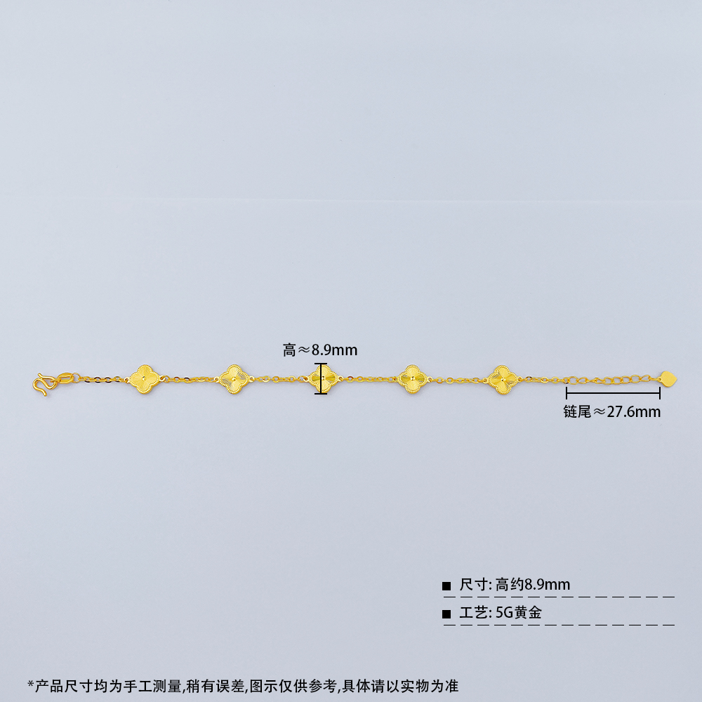 【限时克减150元】足金999 #小红书 (足金999字印)5G黄金双面车花四叶草手链五花手链调节手链(约8.7-9.1mm)(5GSL00234-02)预售产品下单后不退款不退货不换货不补差价