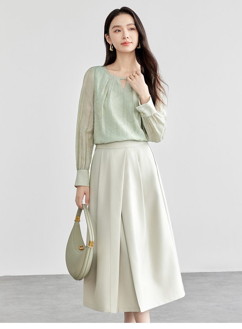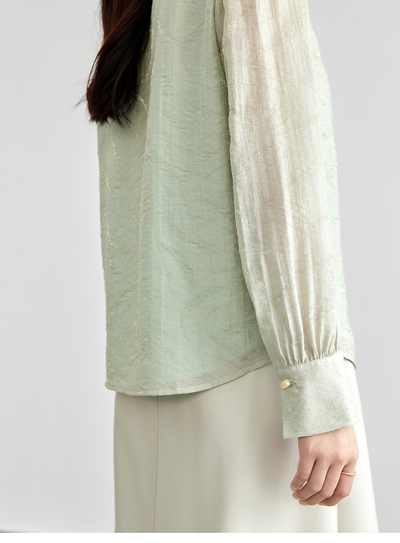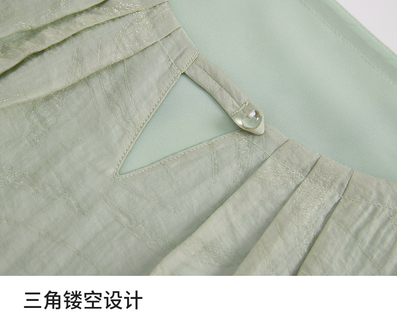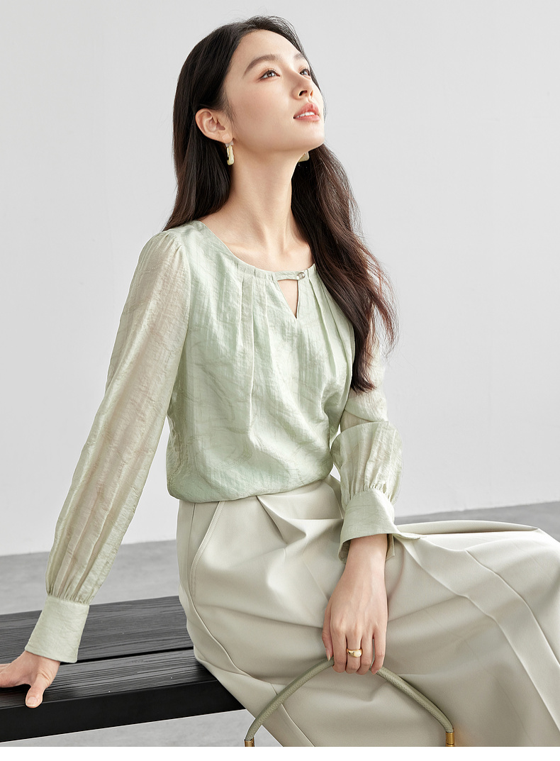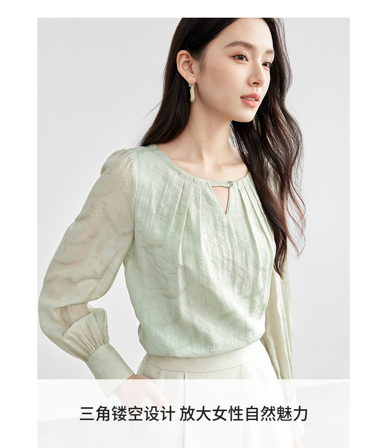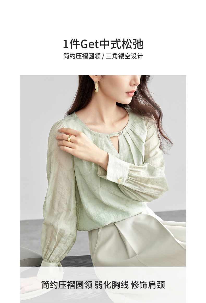 【内购】国风新中式天丝衬衣女圆领三角镂空暗纹纽扣轻薄长袖雪纺衫-57941