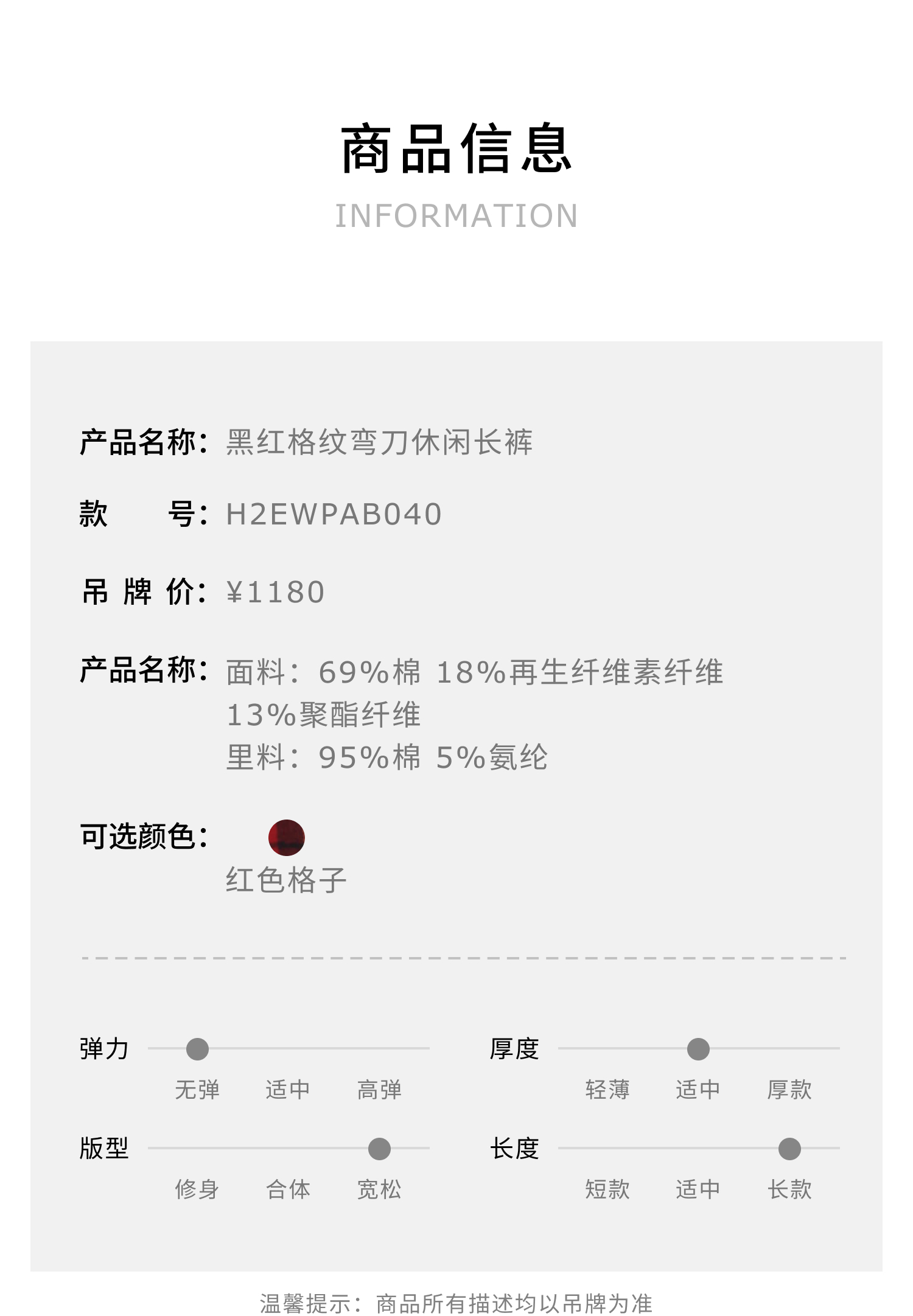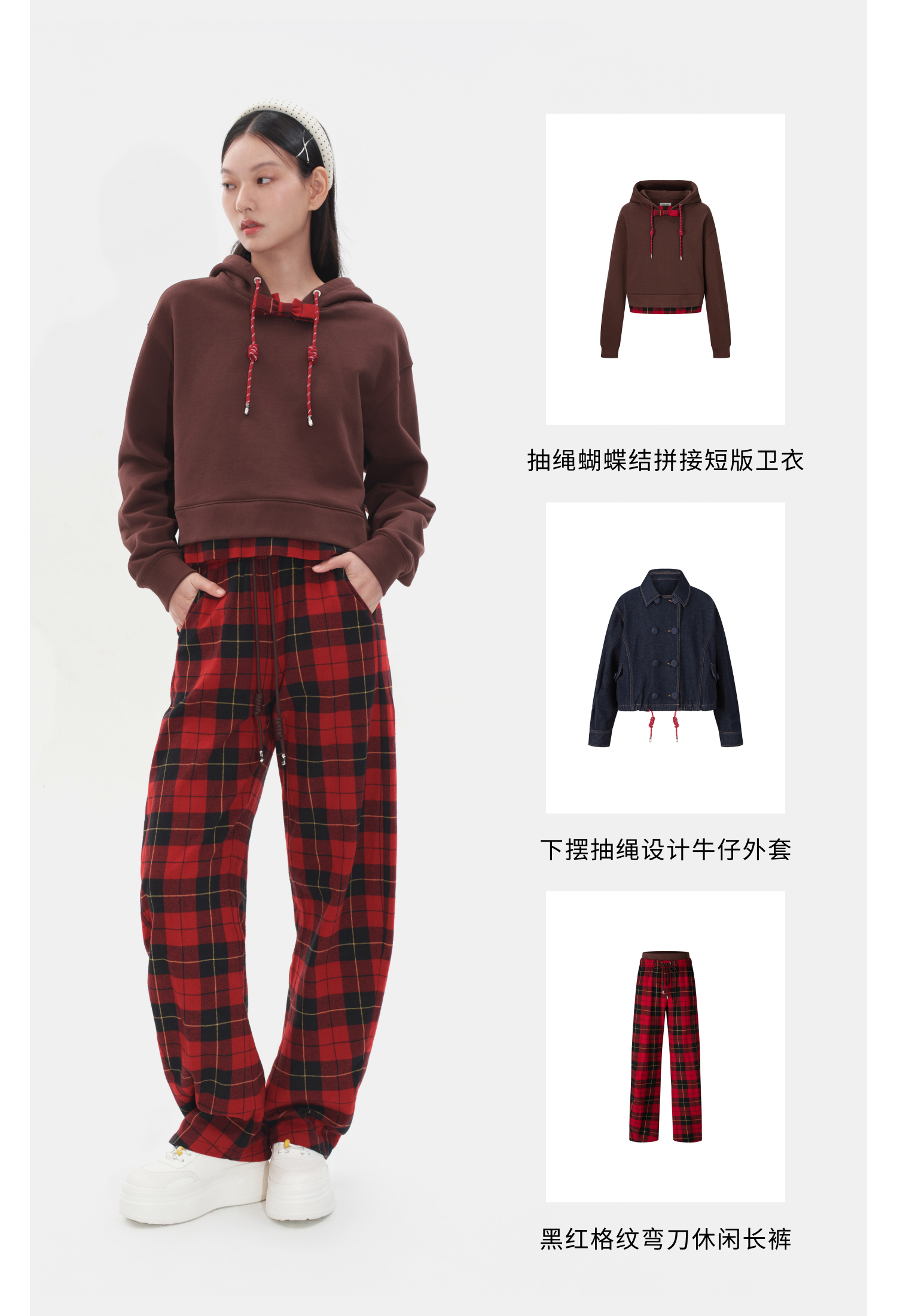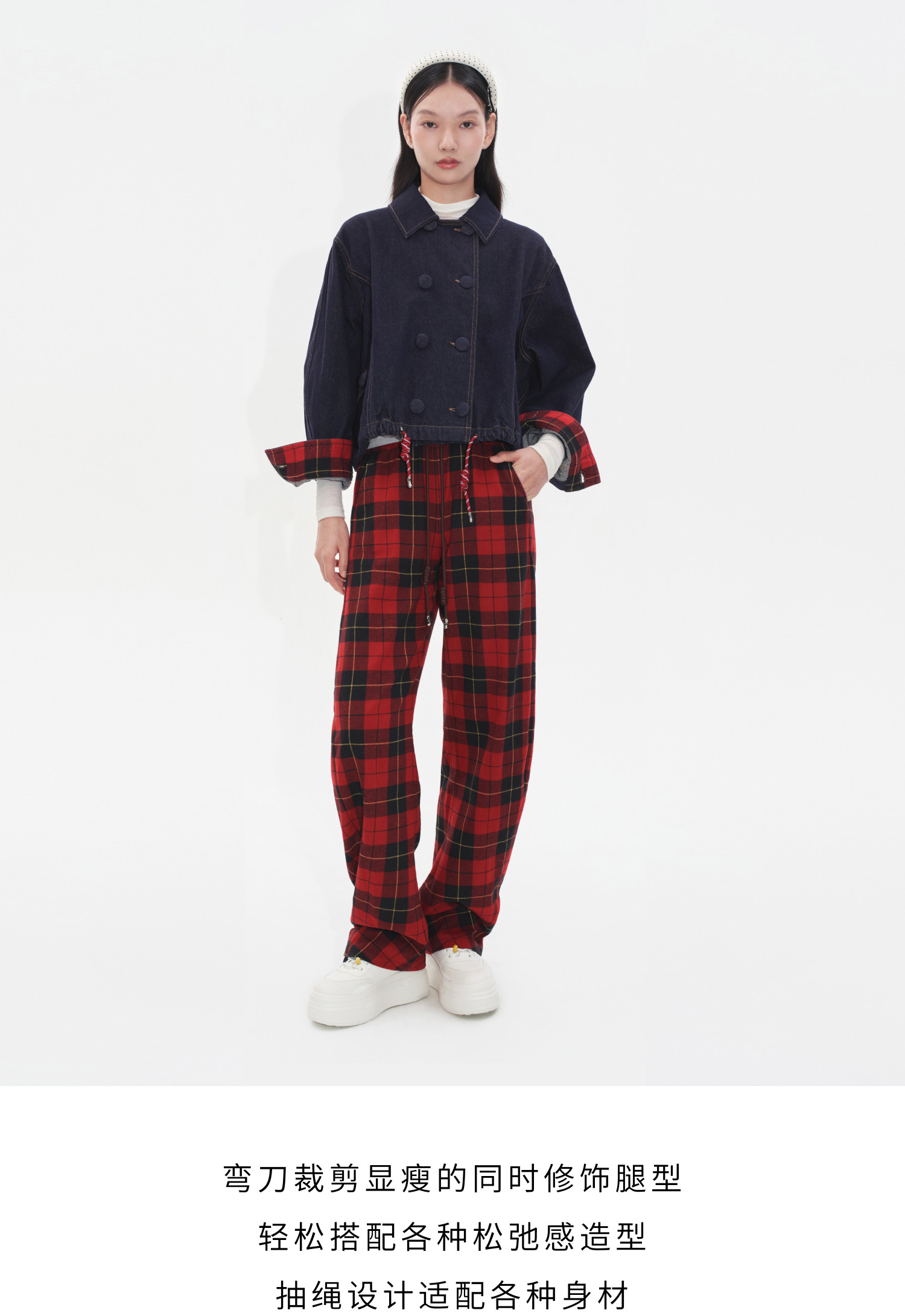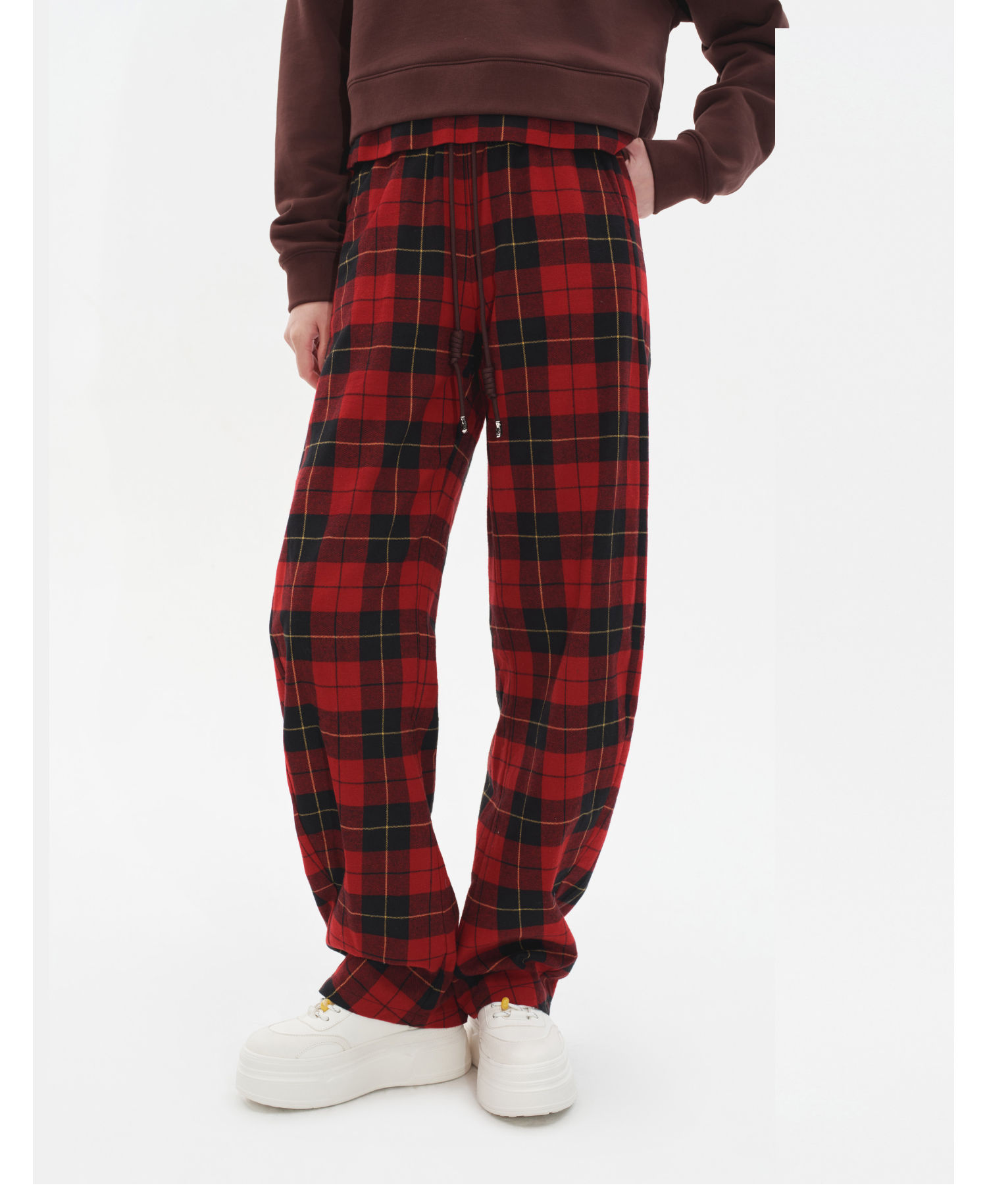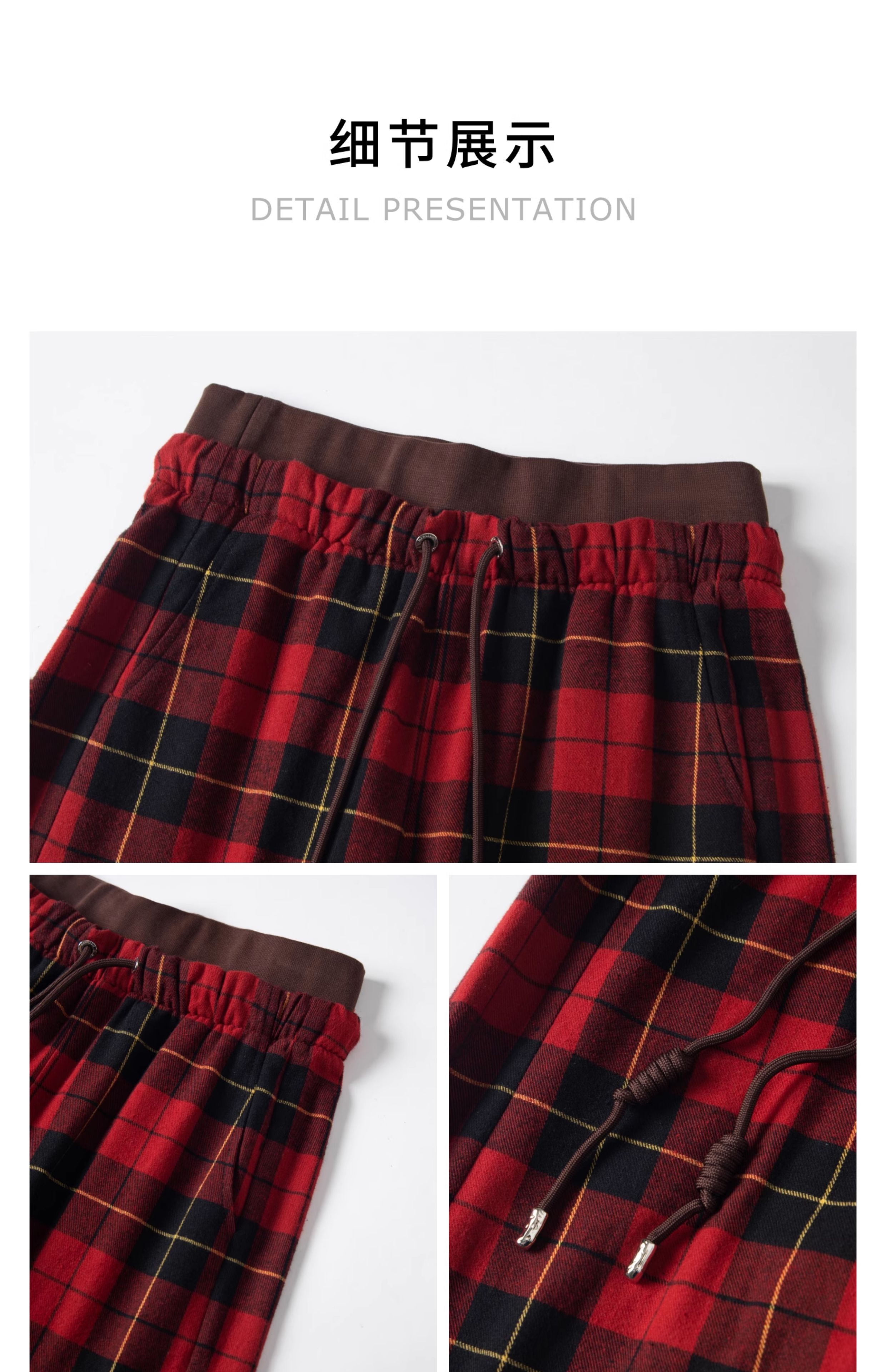 HERLIAN2025年秋季新品女士黑红格纹弯刀休闲长裤