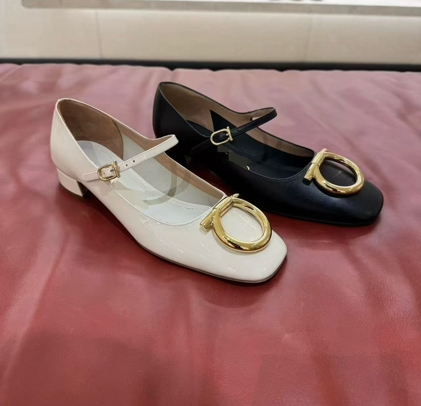 黑色白色是四季款,焦糖色是秋冬款,新款大号Gancini玛丽珍,现代柔美风格的构想,致敬1960年代的时尚。方中有圆,圆中有方,方形鞋头,圆形大号金色扣头,时尚前卫复古时髦。
