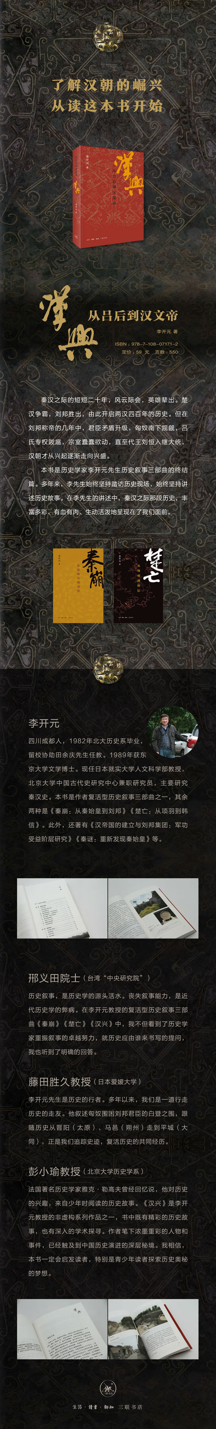 法国著名历史学家雅克·勒高夫曾经回忆说,他对历史的兴趣,来自少年时阅读的历史故事。《汉兴》是李开元教授的非虚构系列作品之一,书中既有精彩的历史故事,也有深入的学术探寻。作者笔下浓墨重彩的人物和事件,已经触及到中国历史演进的深层秘境。我相信,本书一定会启发读者,特别是青少年读者探索历史奥秘的梦想。