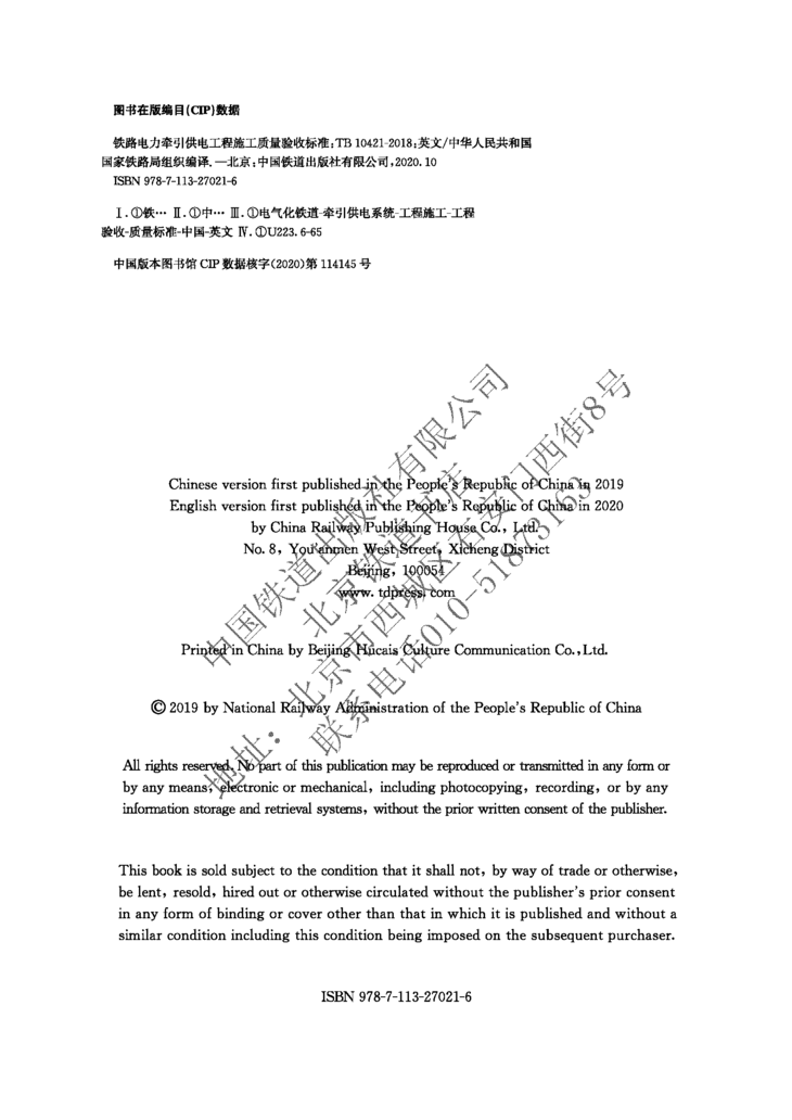 978-7-113-27021-6_铁路电力牵引供电工程施工质量验收标准(TB 10421-2018)英文版