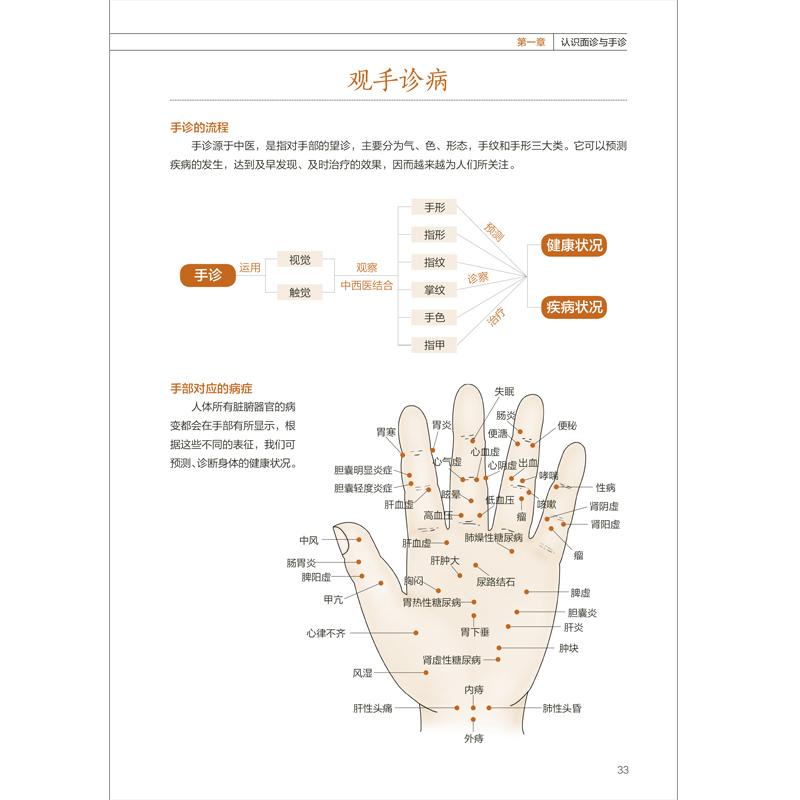 章认识面诊与手诊什么是面诊 / 10面诊的理论依据 / 12头面部的脏腑反射区 / 14掌握面诊的要点 / 30什么是手诊 / 32手诊的理论依据 / 34认识手疗 / 40手疗的基本操作方法 / 42 第二章面部的诊病方法面色异常与疾病判断 / 46眼部异常与疾病判断 / 54耳部、鼻部异常与疾病判断 / 62口腔异常与疾病判断 / 66舌部异常与疾病判断 / 78 第三章观手诊病的方法 观手的外形诊病 / 94观五指诊病 / 98观指甲诊病 / 10214 条主要掌纹线的病理变化 / 1068 种常见病理纹的对应病症 / 134 第四章常见疾病的诊疗法 流行性感冒 / 152慢性支气管炎 / 154慢性胃炎 / 156胃下垂 / 158肠炎 / 160便秘 / 162神经衰弱 / 164脑动脉硬化 / 166高血压 / 168低血压 / 170冠心病 / 172贫血 / 174癫痫 / 176糖尿病 / 178尿路感染 / 180 痔疮 / 182腰痛 / 184颈椎病 / 186湿疹 / 188荨麻疹 / 190痤疮 / 192神经性皮炎 / 194麦粒肿 / 196过敏性鼻炎 / 198扁桃体炎 / 200咽炎 / 202耳鸣 / 204牙痛 / 206尿路结石 / 208前列腺炎 / 210阳痿 / 212遗精 / 214早泄 / 216月经不调 / 218痛经 / 220闭经 / 222子宫肌瘤 / 224卵巢囊肿 / 226乳腺增生 / 228不孕症 / 230百日咳 / 232眩晕 / 234头痛 / 236失眠 / 238