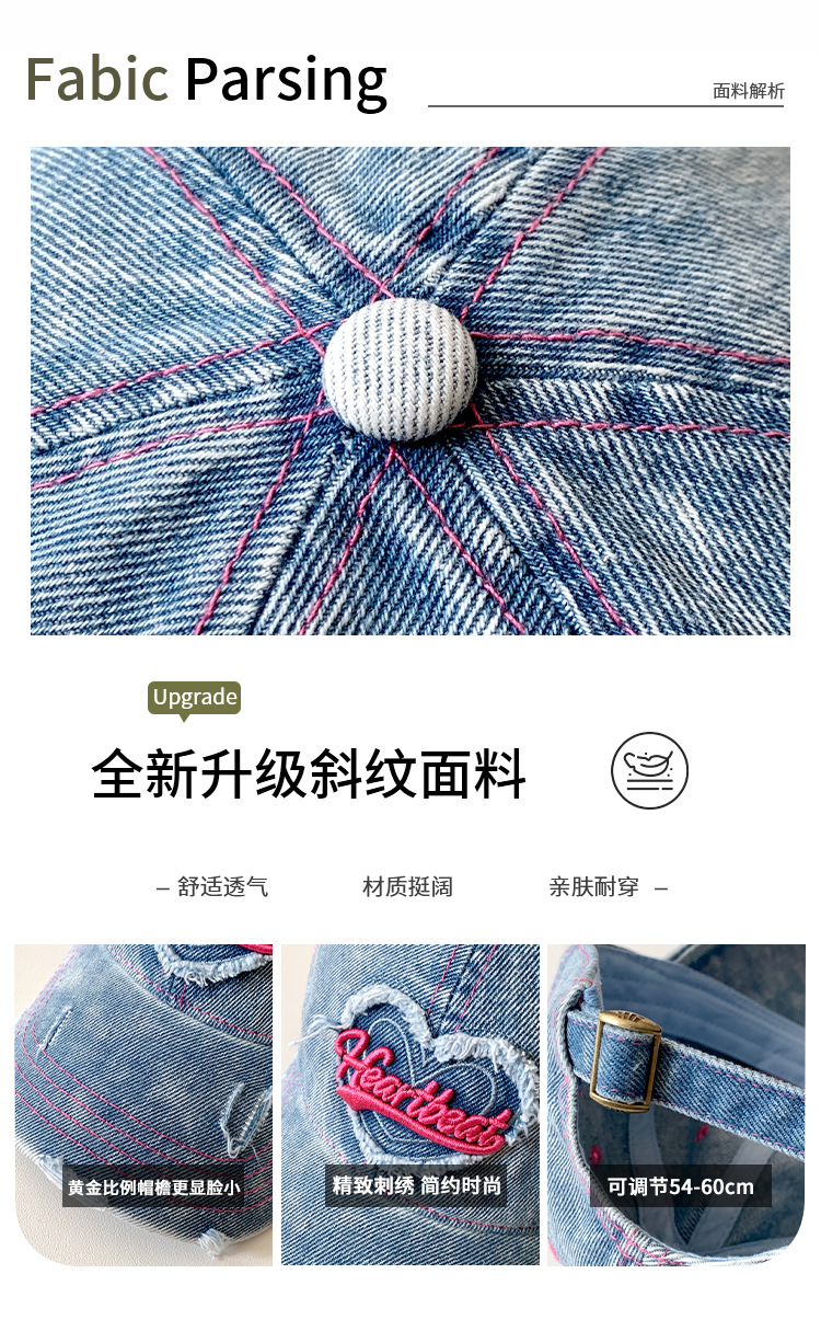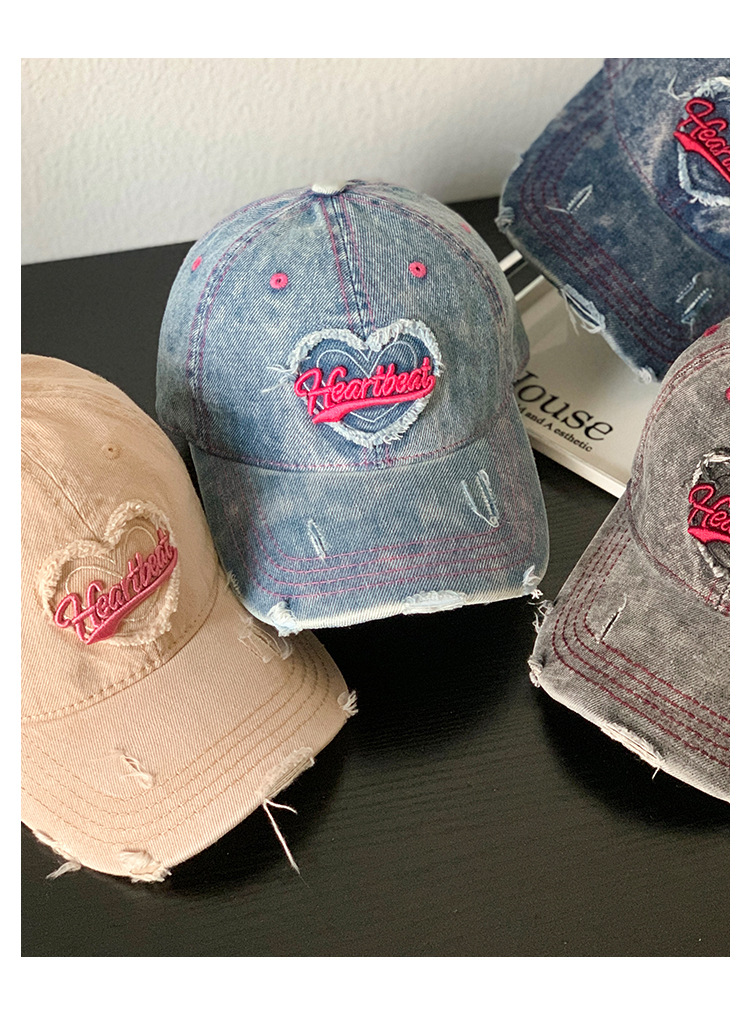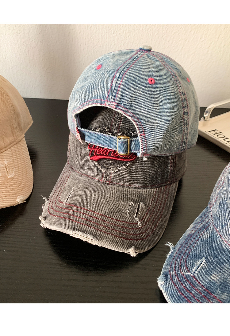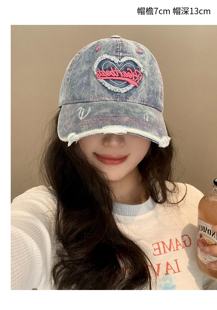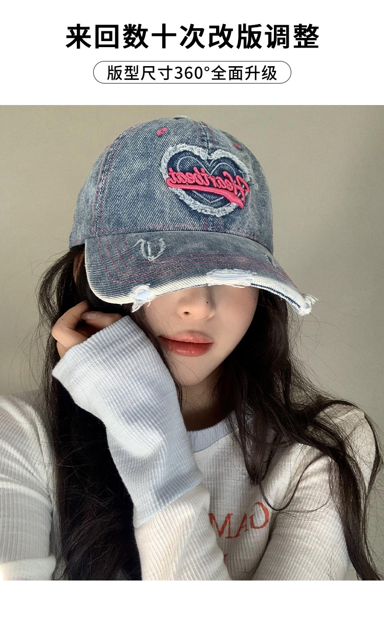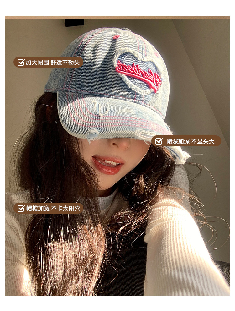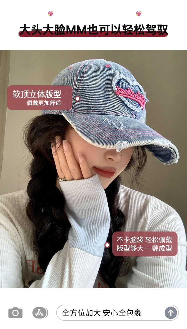 【爱心水洗牛仔棒球帽女】复古破洞做旧宽帽檐鸭舌帽 大头围显脸小帽子  商品图8
