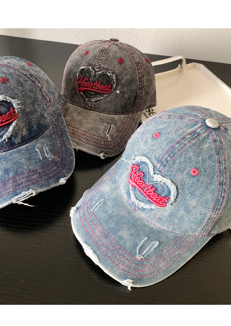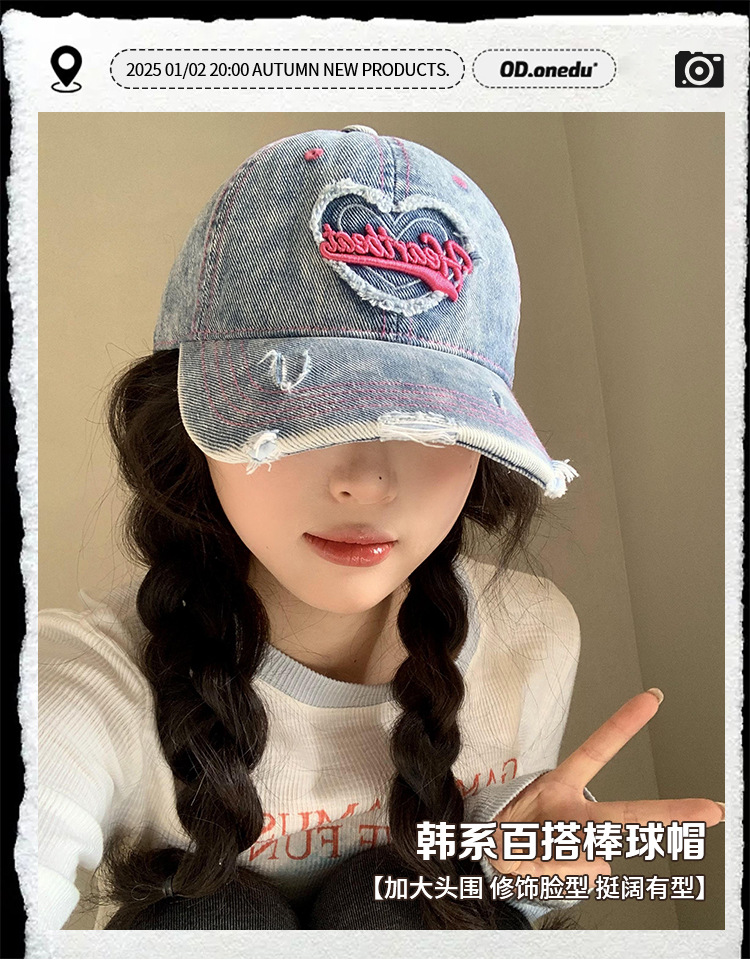 【爱心水洗牛仔棒球帽女】复古破洞做旧宽帽檐鸭舌帽 大头围显脸小帽子  商品图1