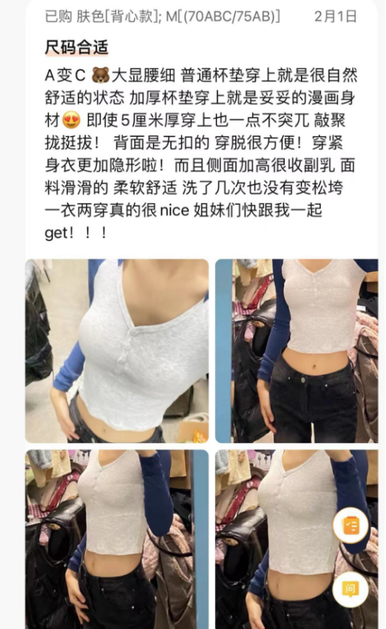 这款胸衣穿过的都说好,贴服稳定,抬手不上滑。让你舒适一整天。关键是胸型真的是超美的。