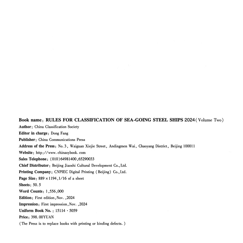 书名:钢质海船入级规范2024(第2分册)(英文版)