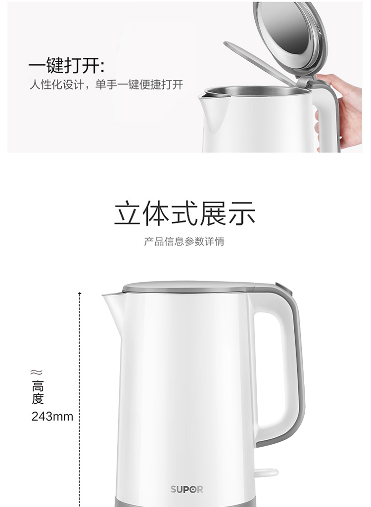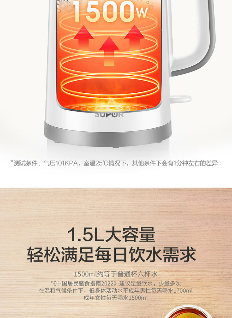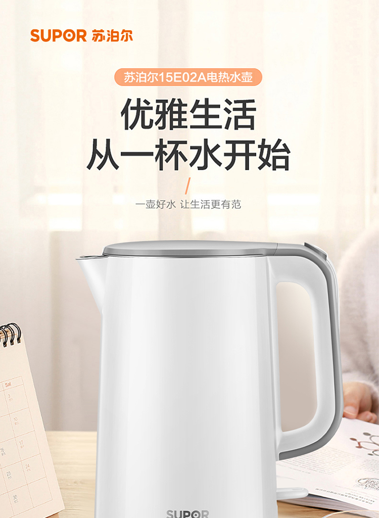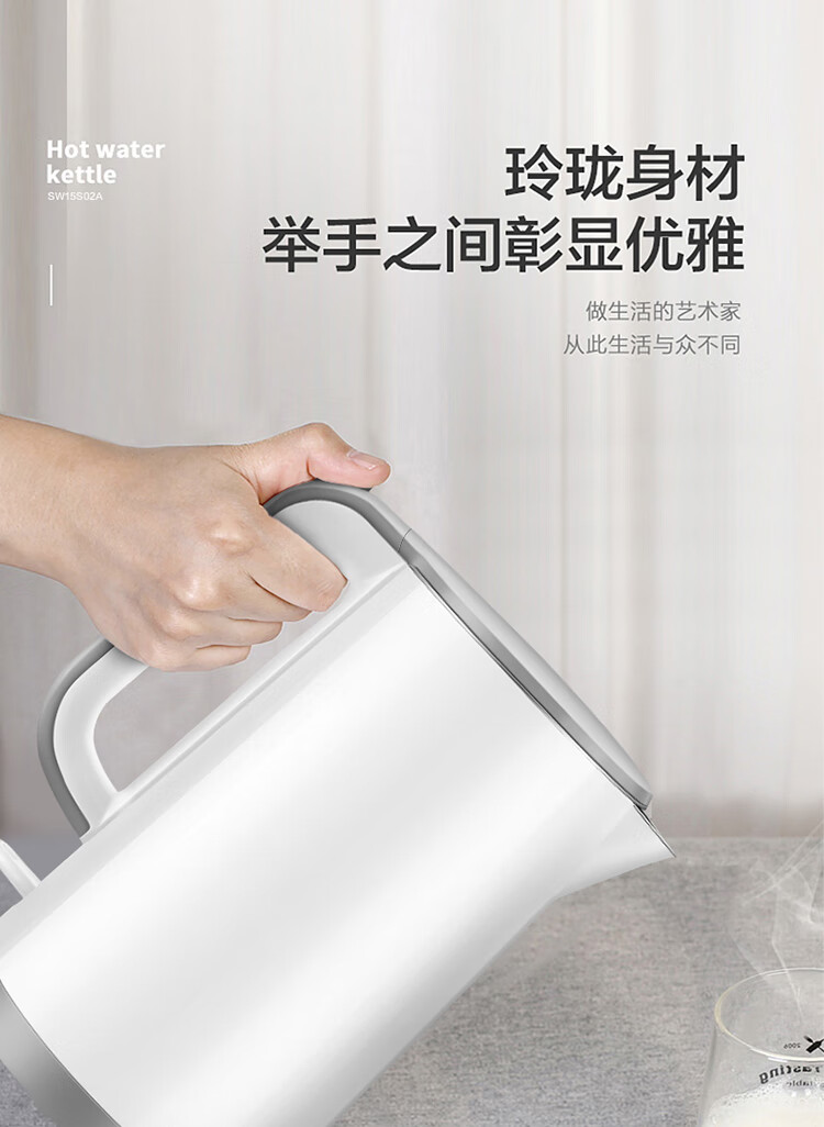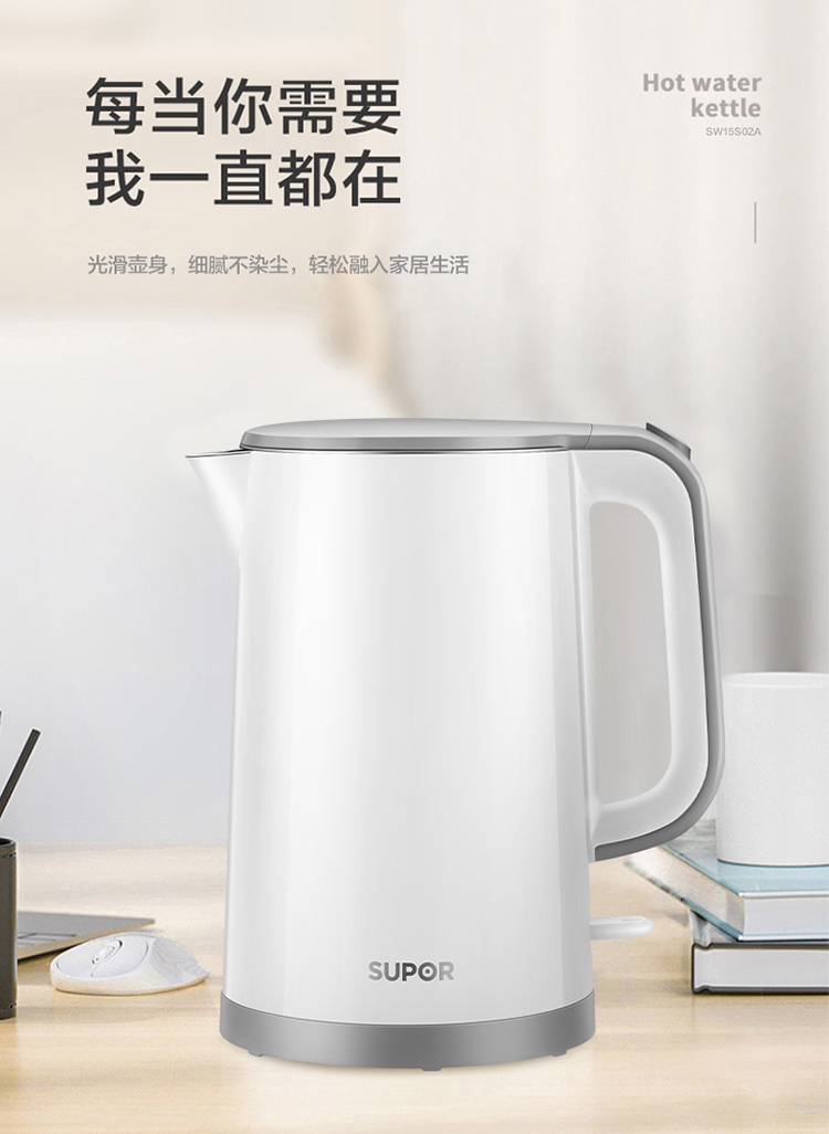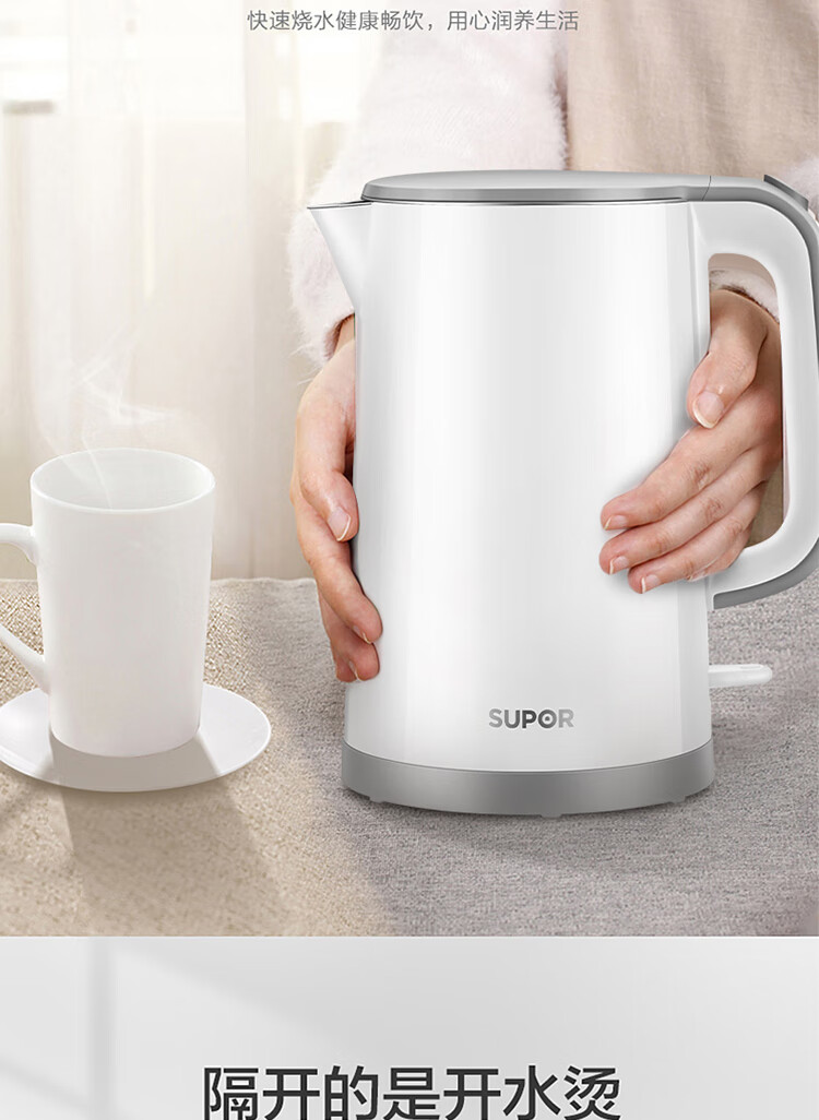 苏泊尔(SUPOR)1.5L容量电水壶 304不锈钢无缝内胆 双层隔热壶壁 1500W快速沸腾 SW-15E02A