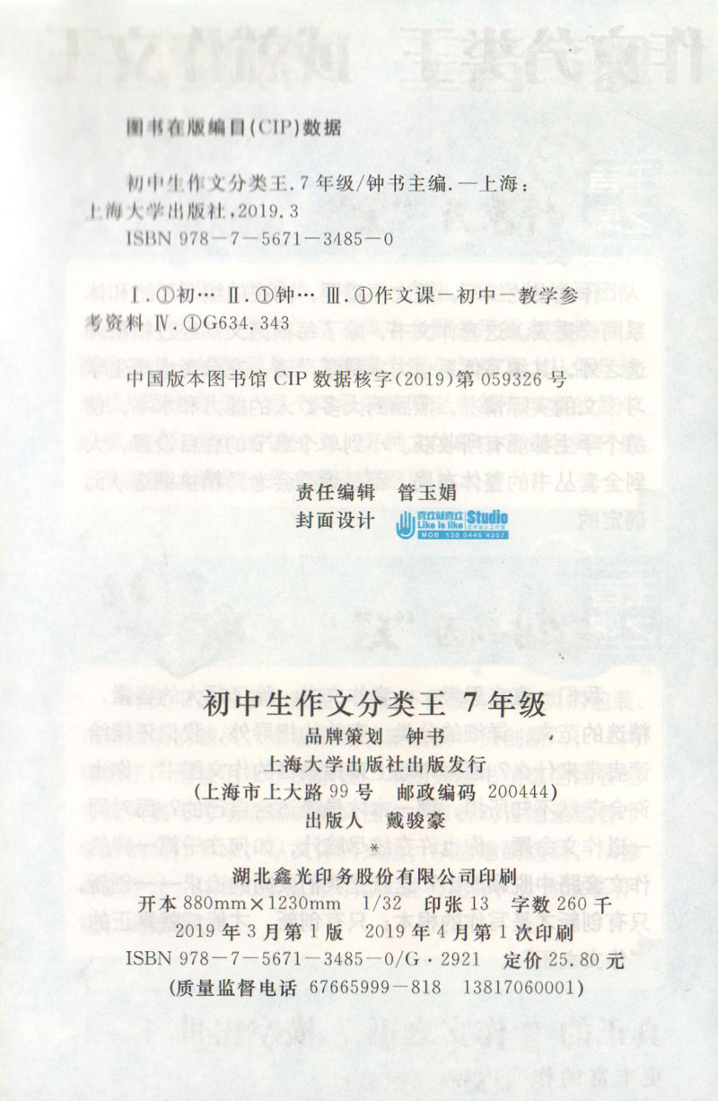 钟书作文榜样 初中生作文分类王 7年级/七年级 根据部编版教材写作要求编写 初中同步作文写作技巧训练 上海大学出版社