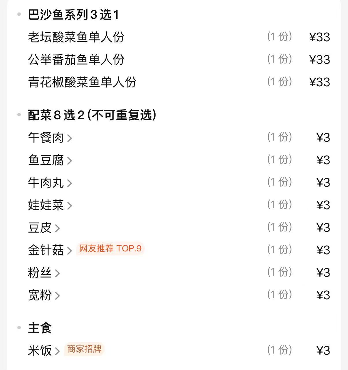 3.产品投量标准提示,实际以门店操作标准为准,菜品搭配:巴沙鱼片150克、酸菜60克-100克、配菜75克-150克/种之间