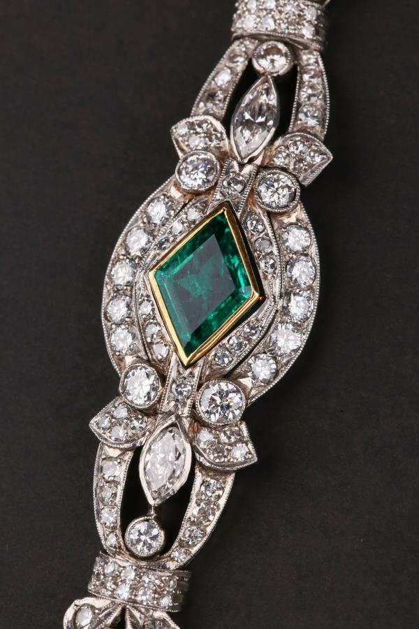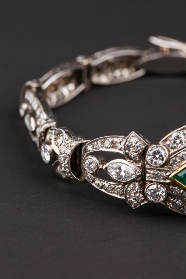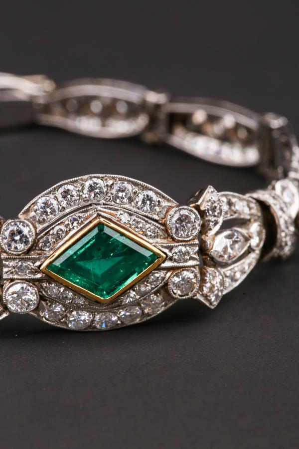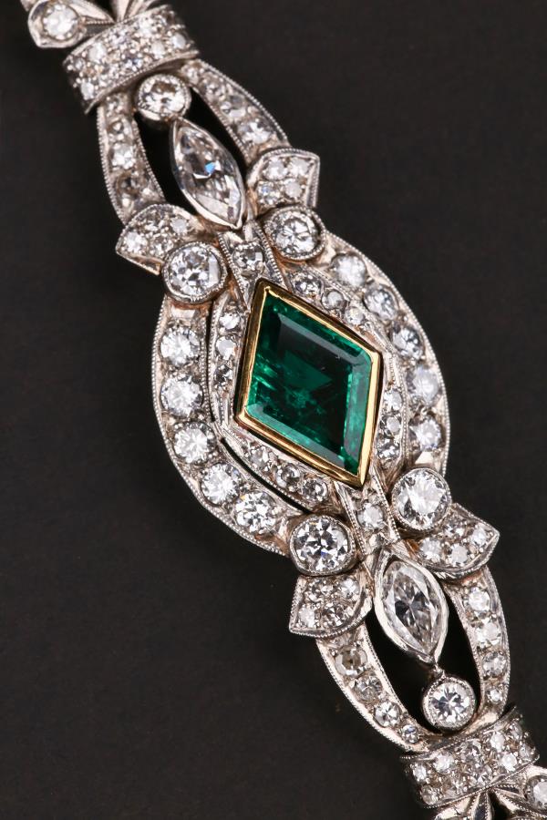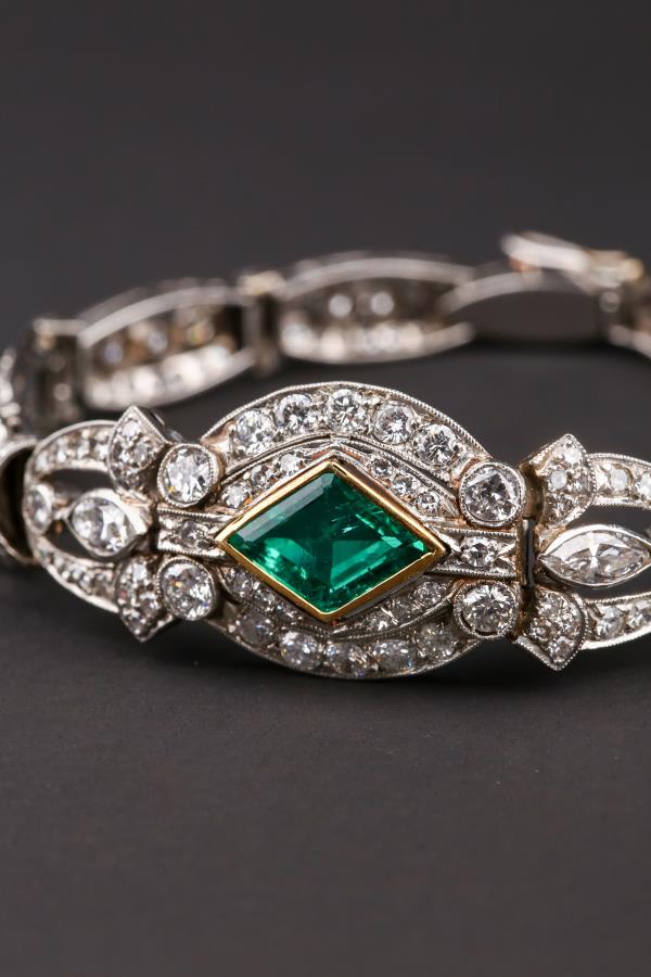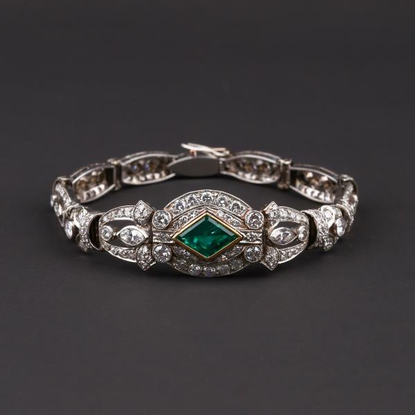 独角鹿西洋古董装饰艺术时期铂金镶嵌钻石哥伦比亚祖母绿手链手镯