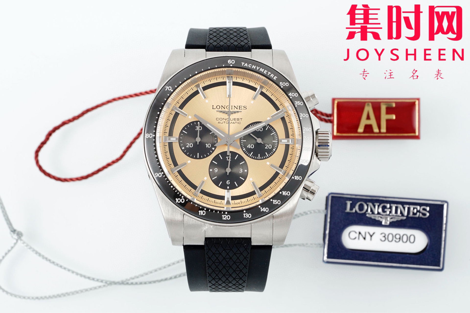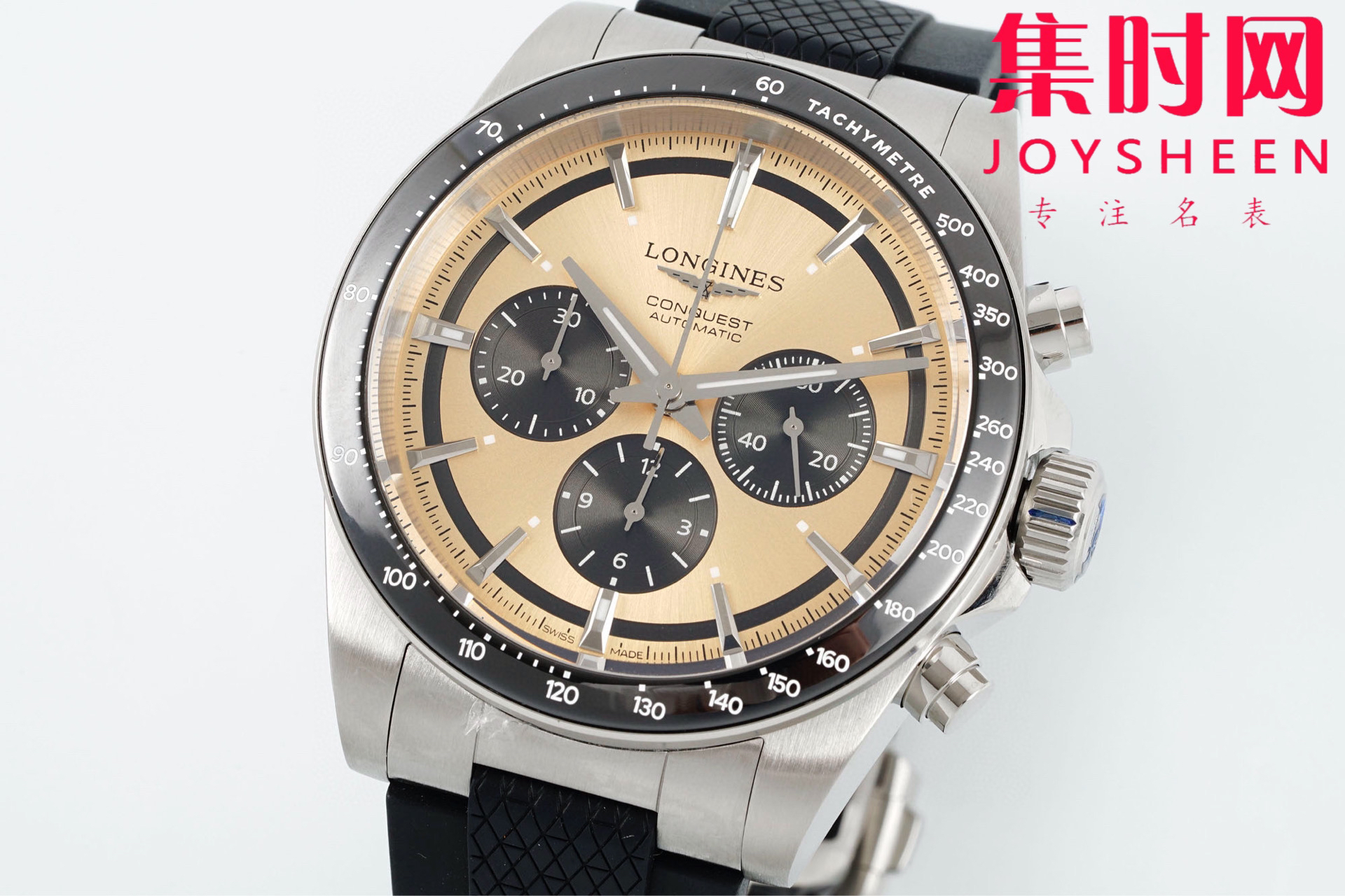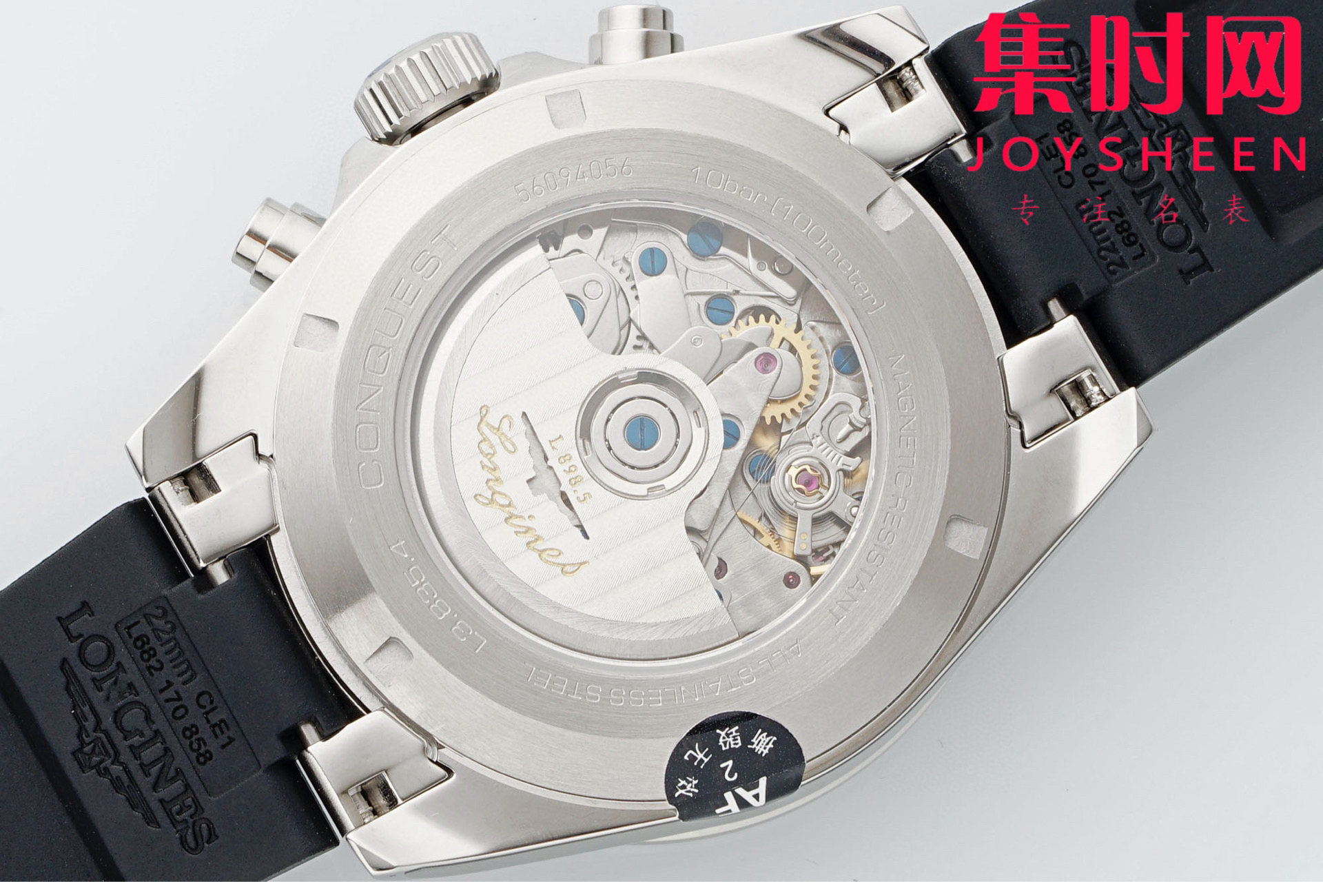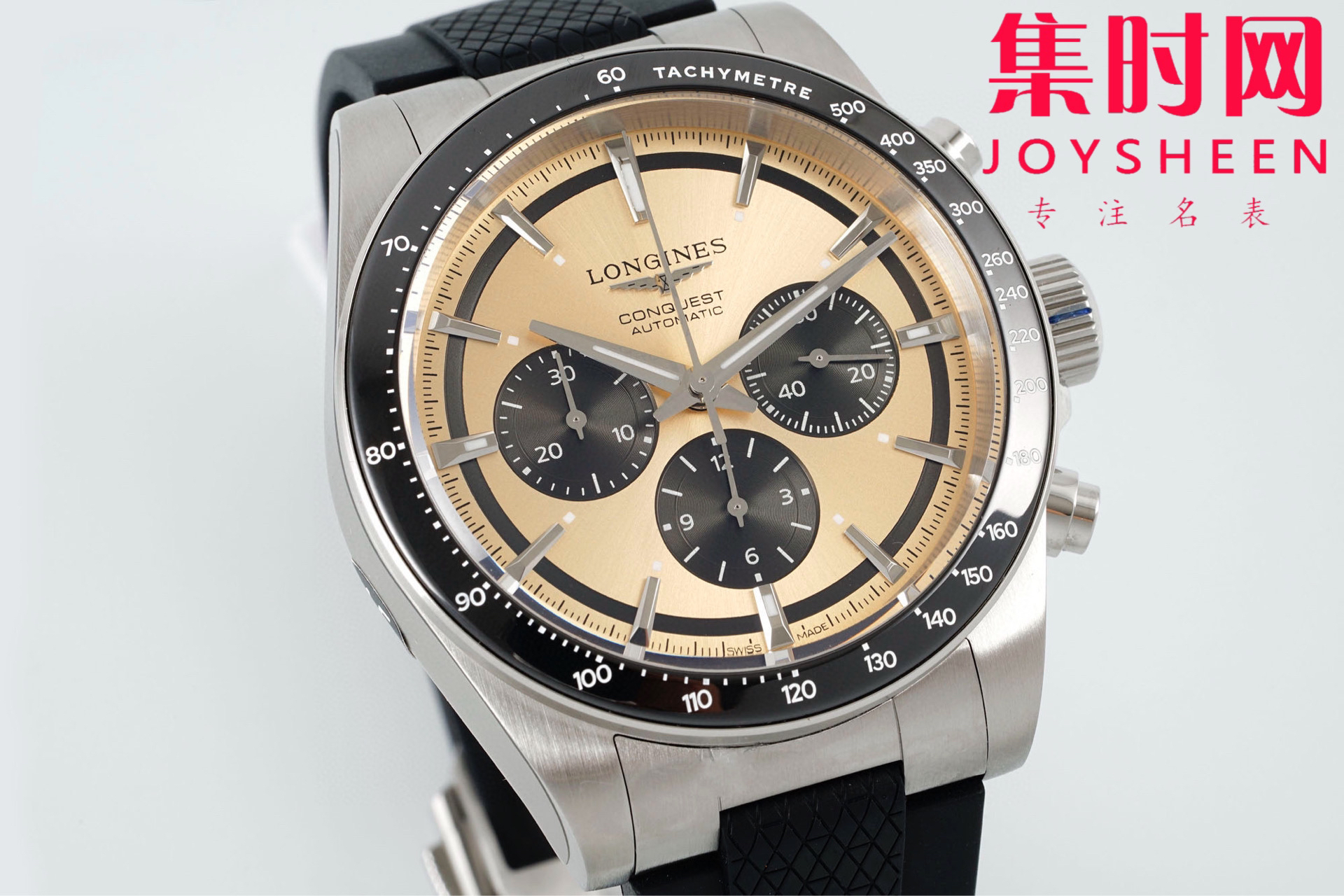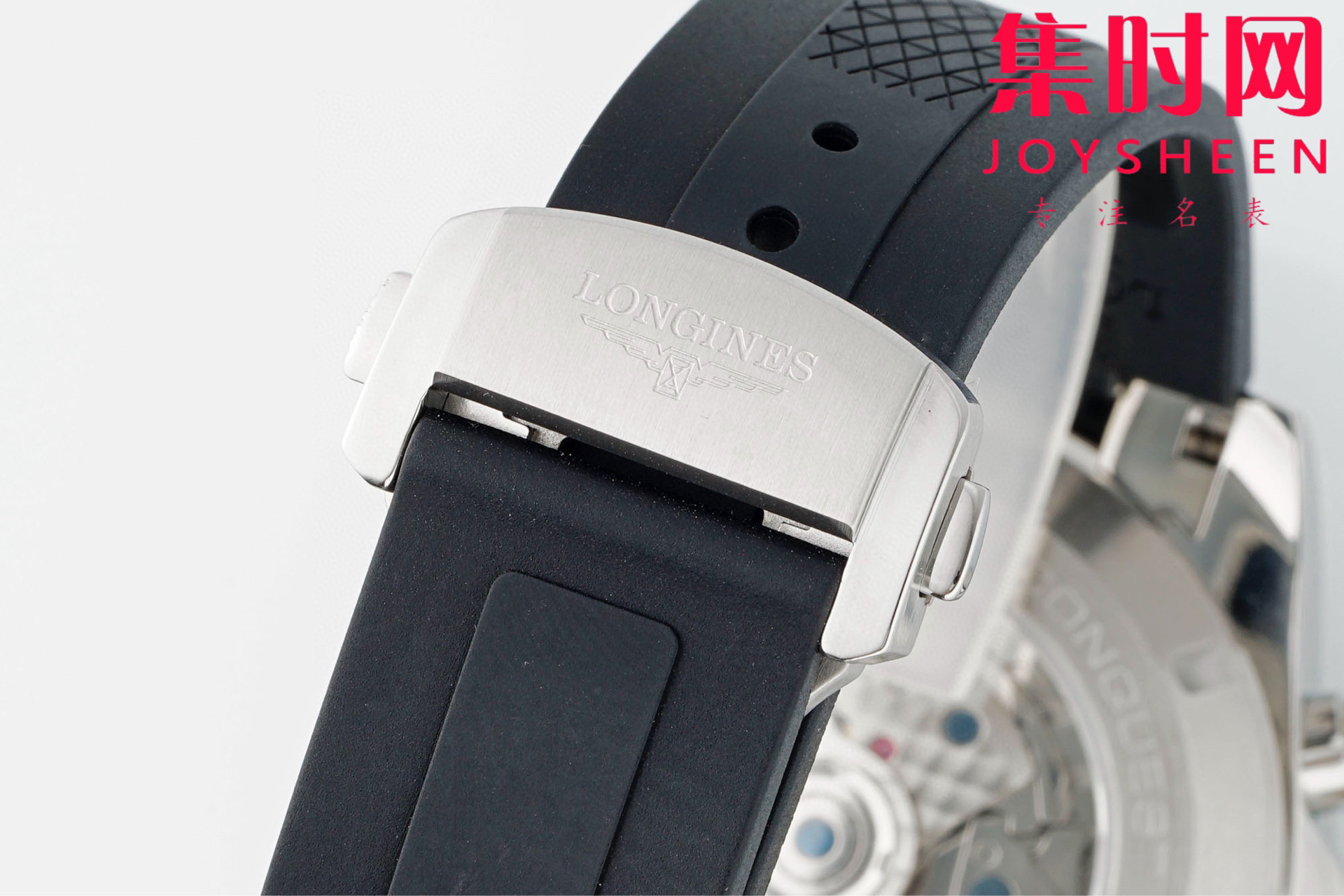 AF浪琴康卡斯计时系列 康卡斯悦动计时 男士腕表 胶带款 表径42mm,使用陶瓷表圈,表圈上有有测速圈,并有红字点缀。