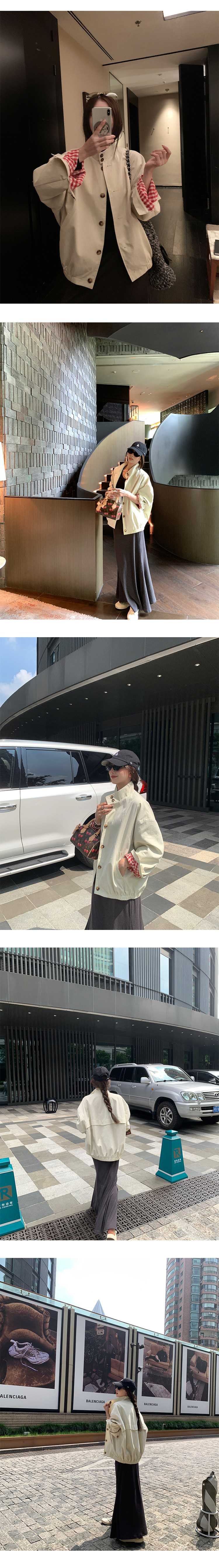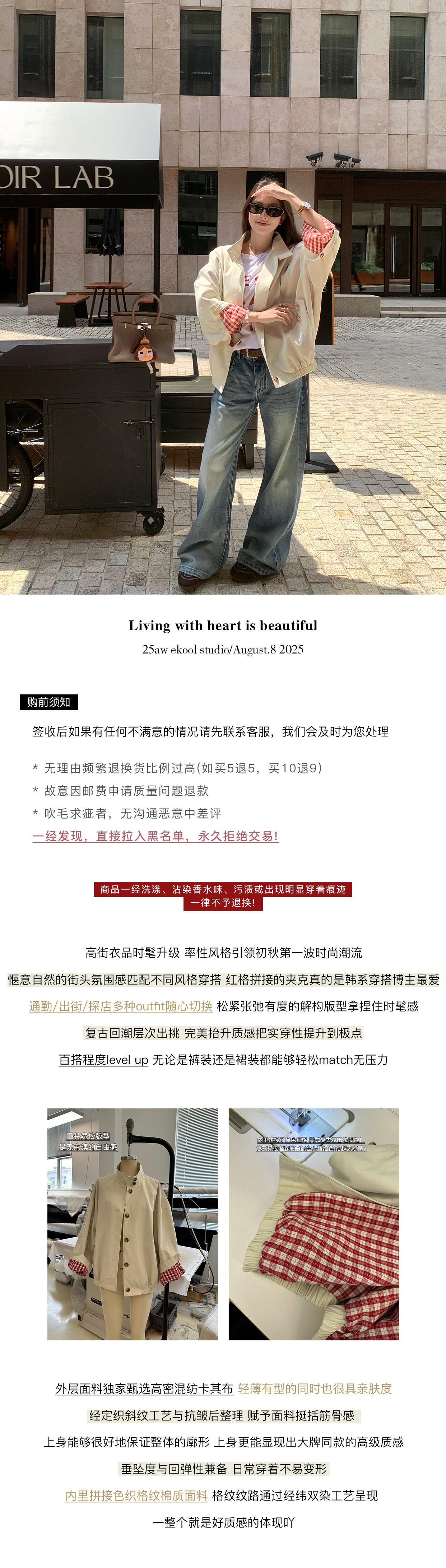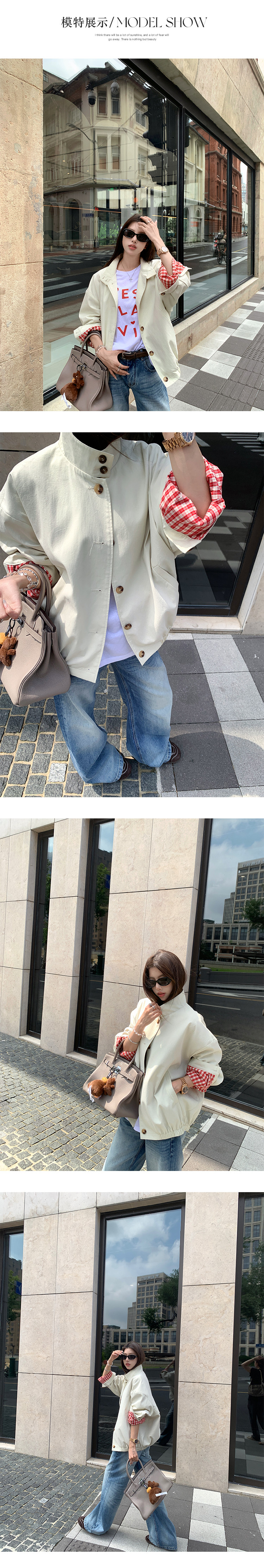 EKOOL衣库 格子里布立领工装外套女早秋新款宽松廓形百搭夹克上衣