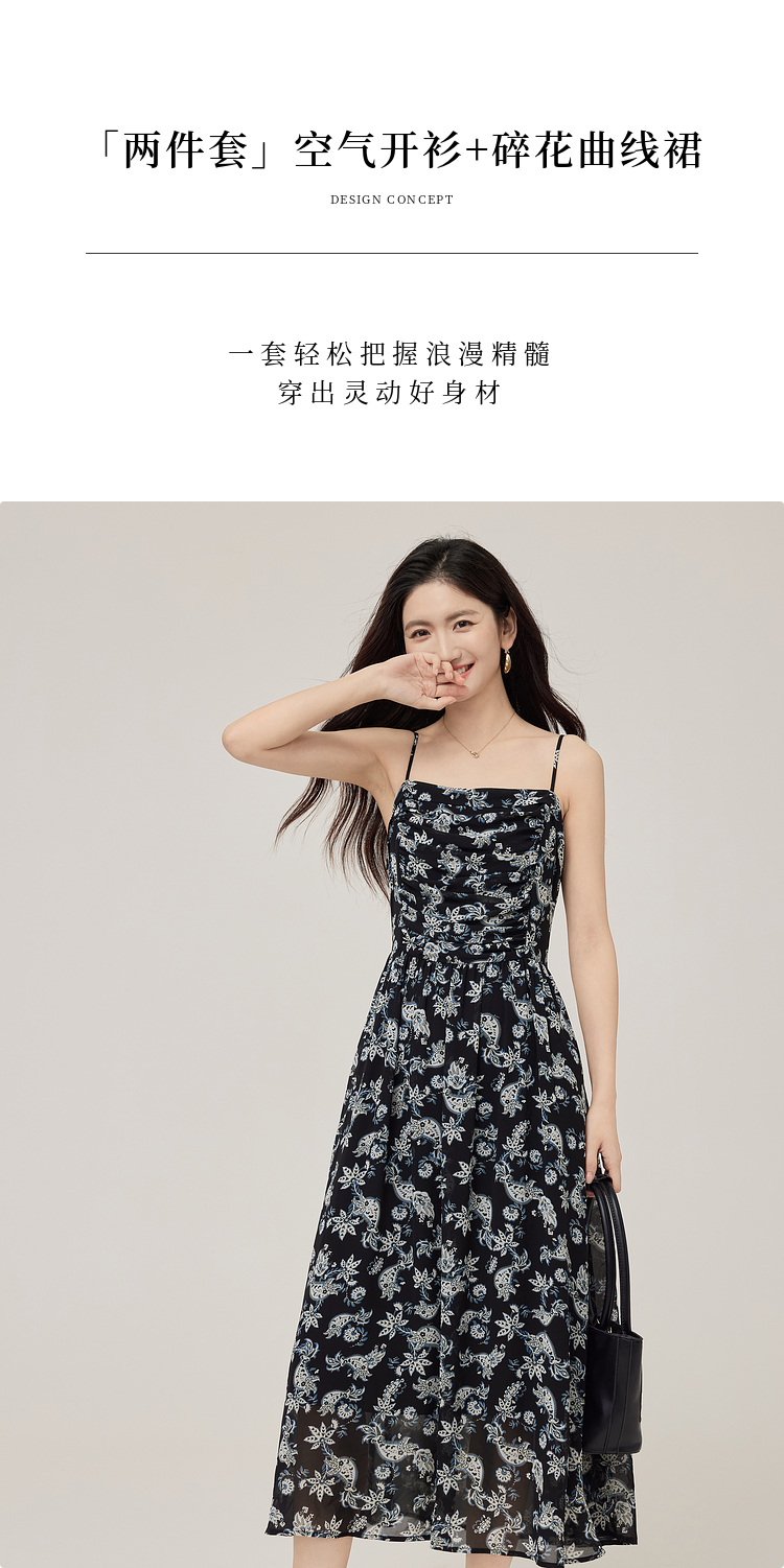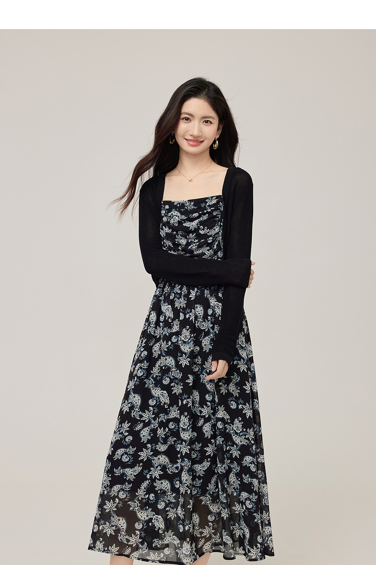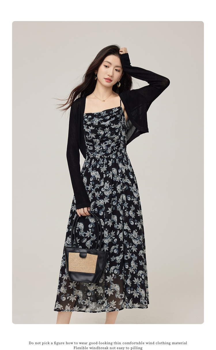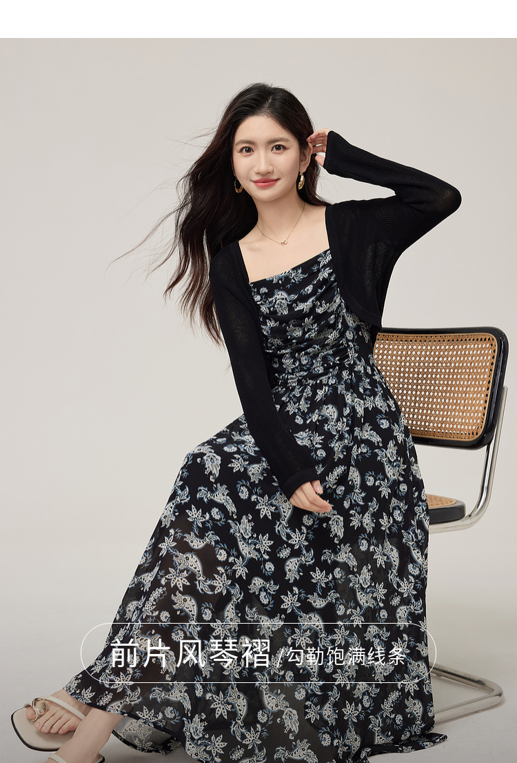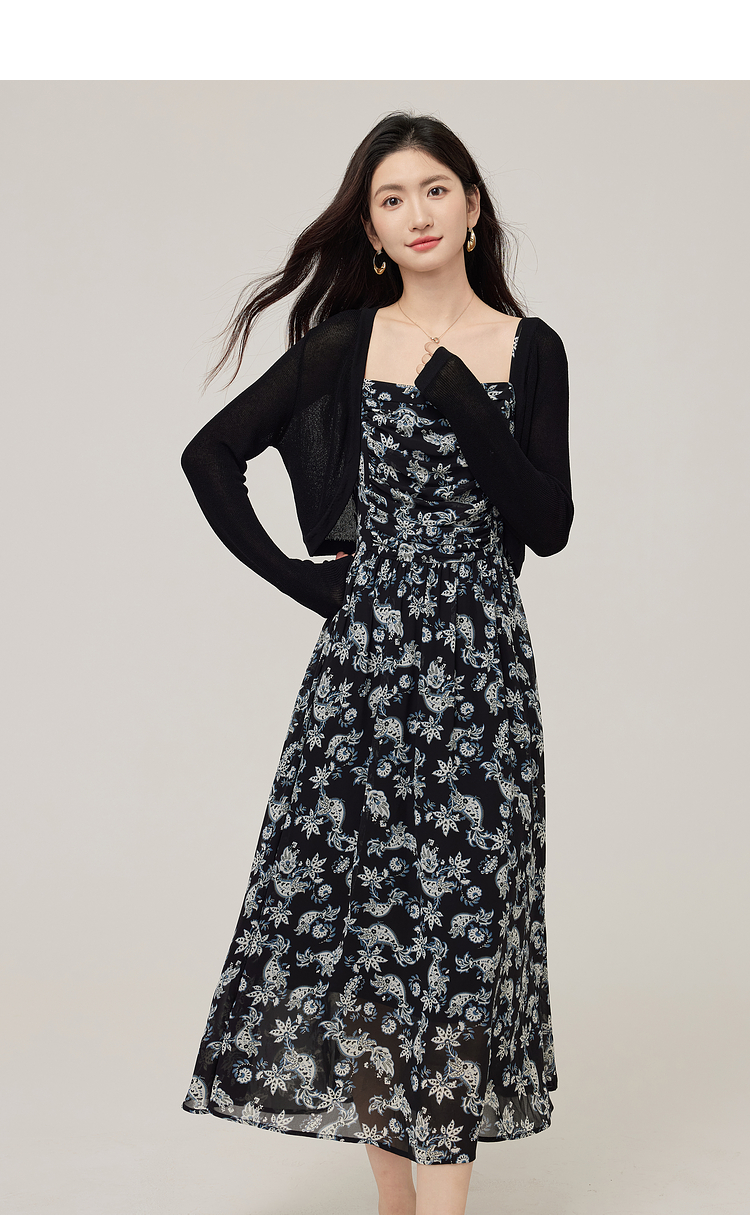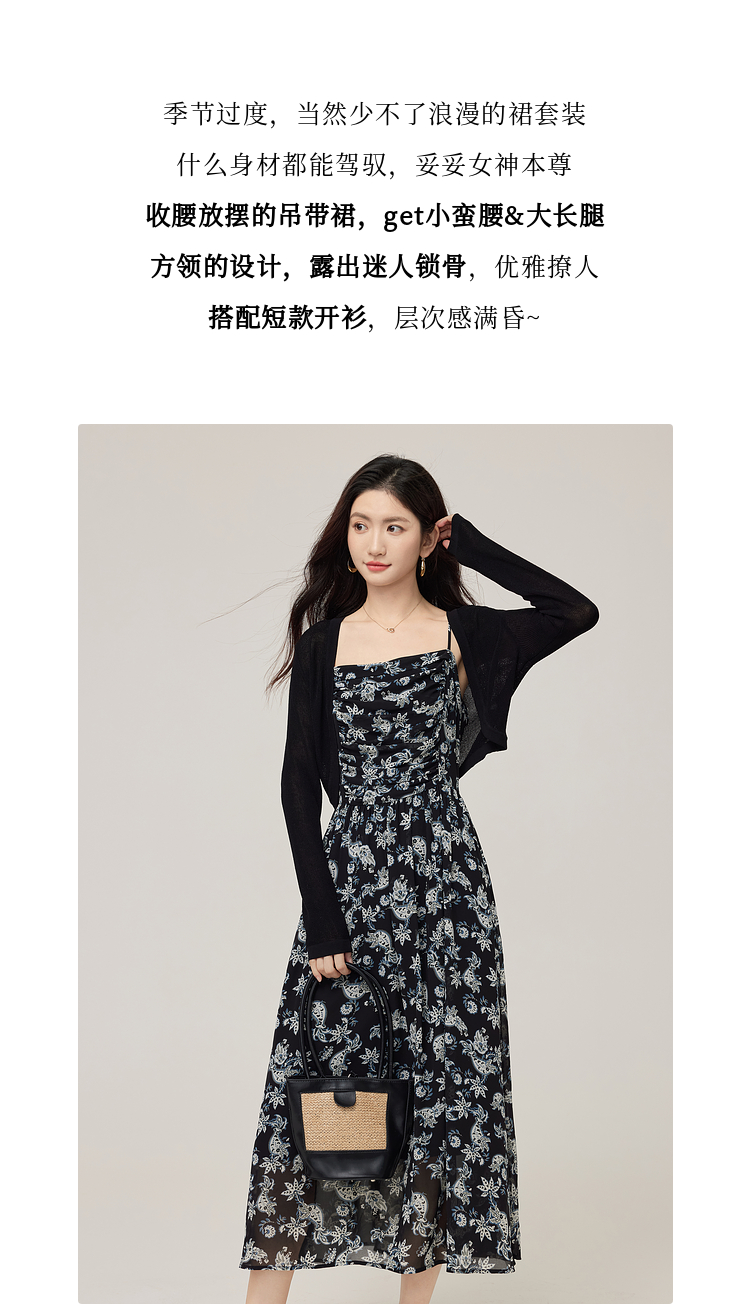 【08/12新品】熙世界复古印花吊带连衣裙套装女2025早秋新款针织开衫裙子两件套