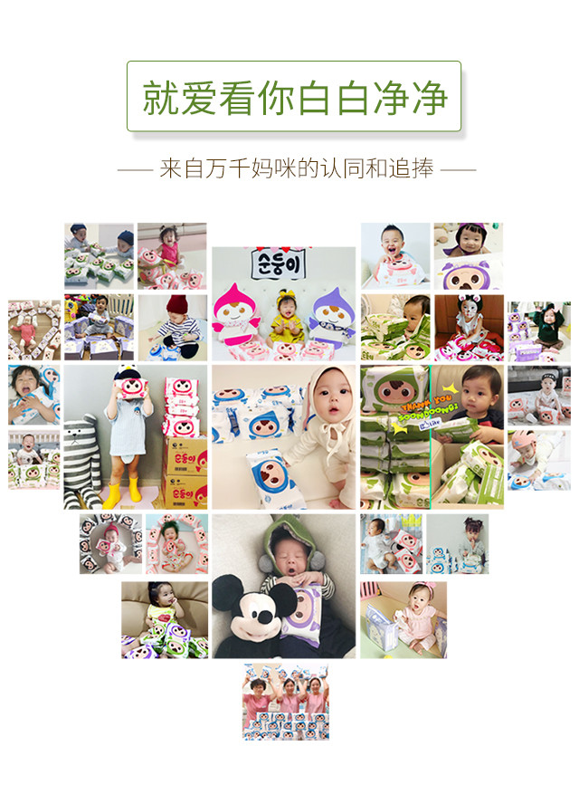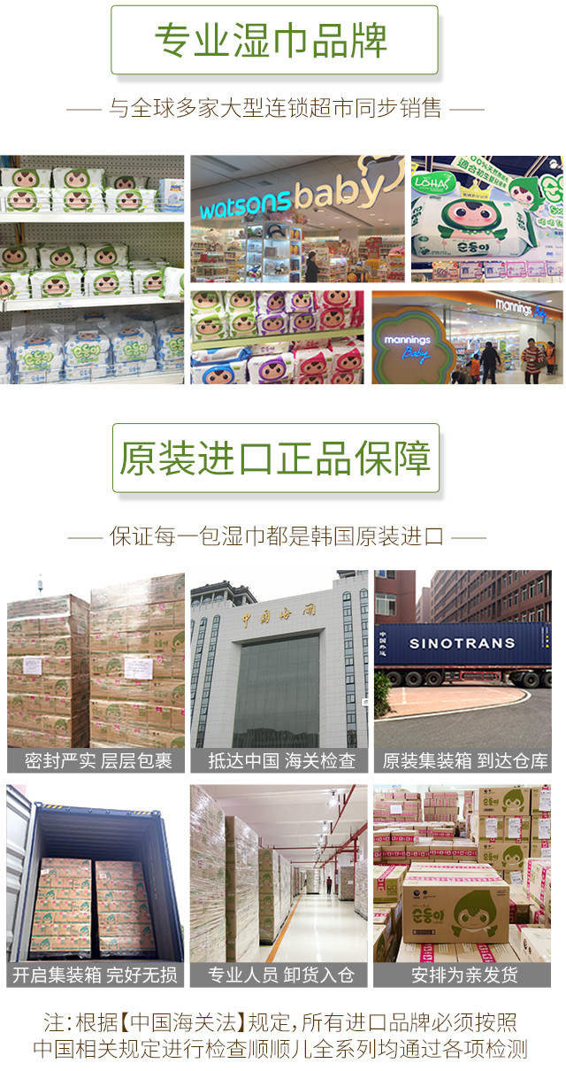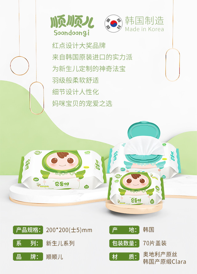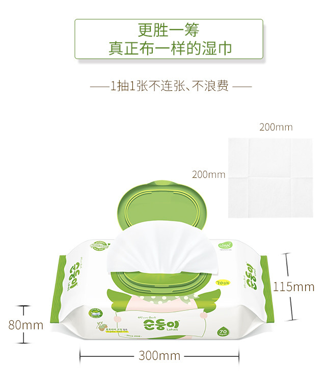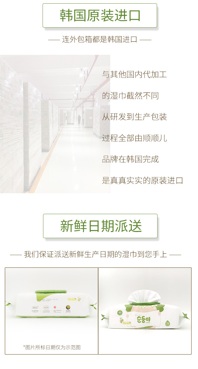 顺顺儿韩国原装进口婴儿湿巾绿色70抽10包