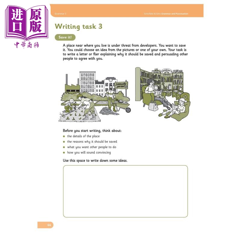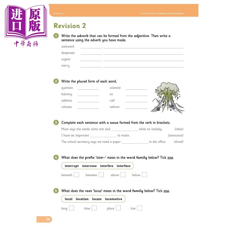 《Grammar 5》学生用书包含 30 个单页课程,涵盖了 5 年级的国家课程要求。主要特点包括: 每节课的关键学习点的用户友好摘要 大量练习,从检查理解的简短“试试看”活动到需要孩子自己造句的更深入的问题 定期复习页面以巩固学习并帮助您识别优势和劣势 各种写作任务以促进新知识的应用 自我评估清单以鼓励学生评估自己的学习 词汇表以支持自信地使用语法术语。