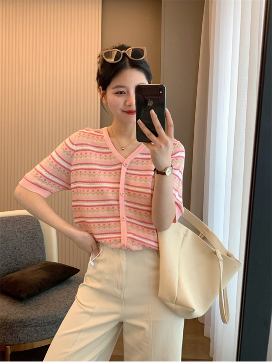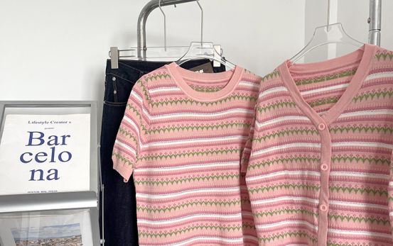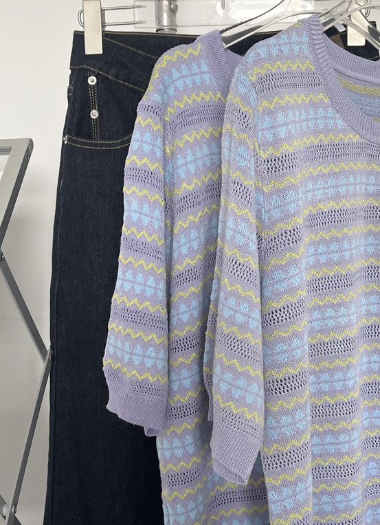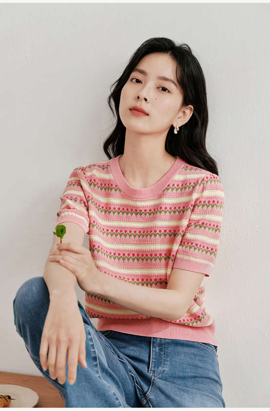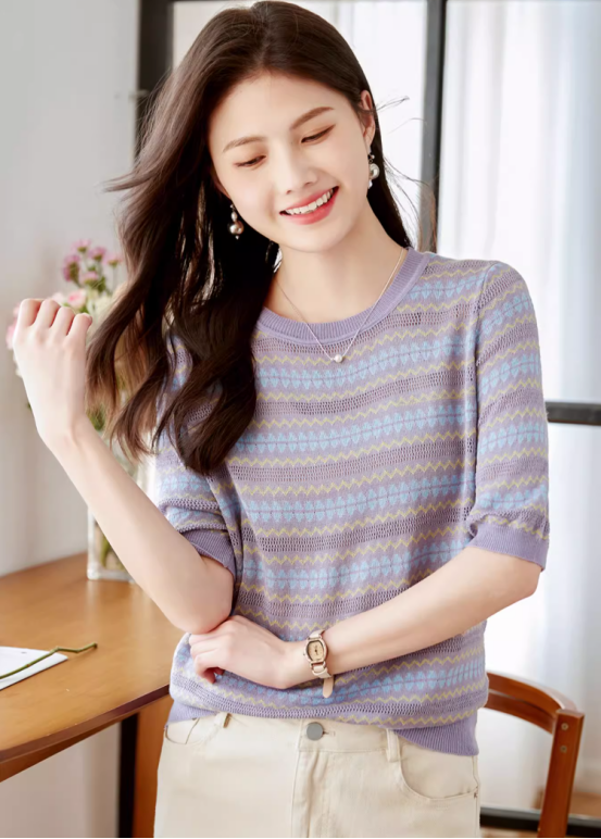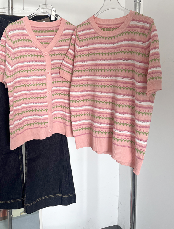 🏆[独家重磅!! 佐姿莎夏日条纹花朵镂空短袖 ]2款可选☀️ 夏天穿也不会热的针织衫 区别市场普货!!🌈侧缝条纹完全对齐,耗料重工! 🔺 面料选用进口冰爽丝 !清爽透气很凉快 不闷热