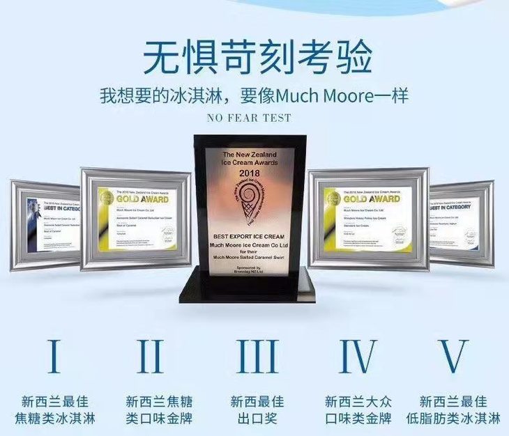 MuchMoore在各项大赛上斩获N多奖项、实实在在的明星产品 简单举例一下: 最佳标准香草冰淇淋 – 金奖及最佳奖 最佳标准冰淇淋 – 银奖 最佳咖啡冰淇淋 – 银奖 最佳高端香草冰淇淋 – 银奖 最佳高端冰淇淋 – 金奖 最佳创意雪葩冰淇淋 – 银奖 最佳出口冰淇淋奖 – 银奖 最佳低脂冰淇淋 -金奖及最佳奖 以上仅仅只是是不完整统计哦,可见履历简直惊人的优秀!