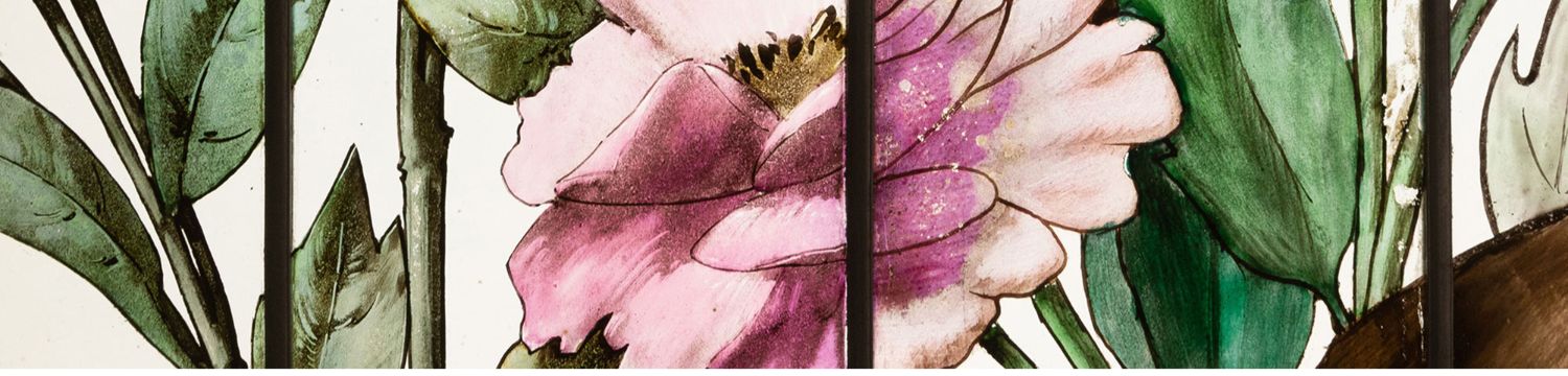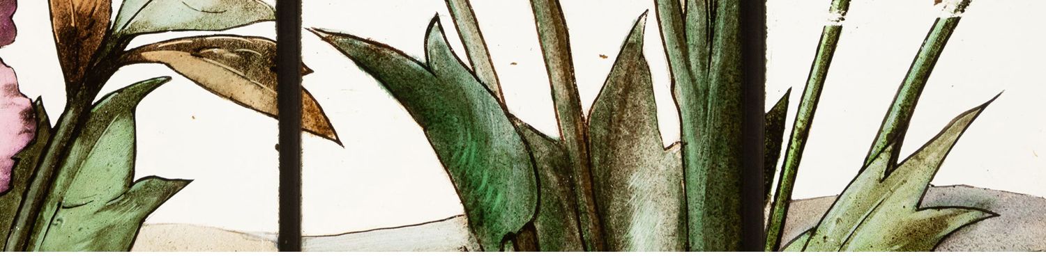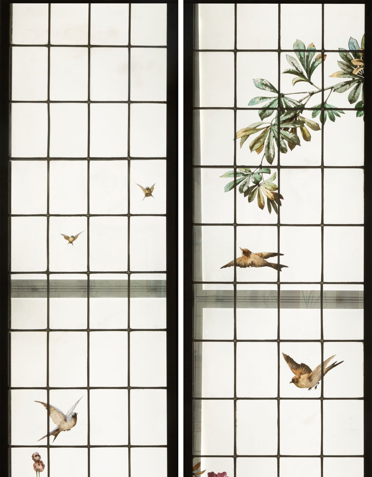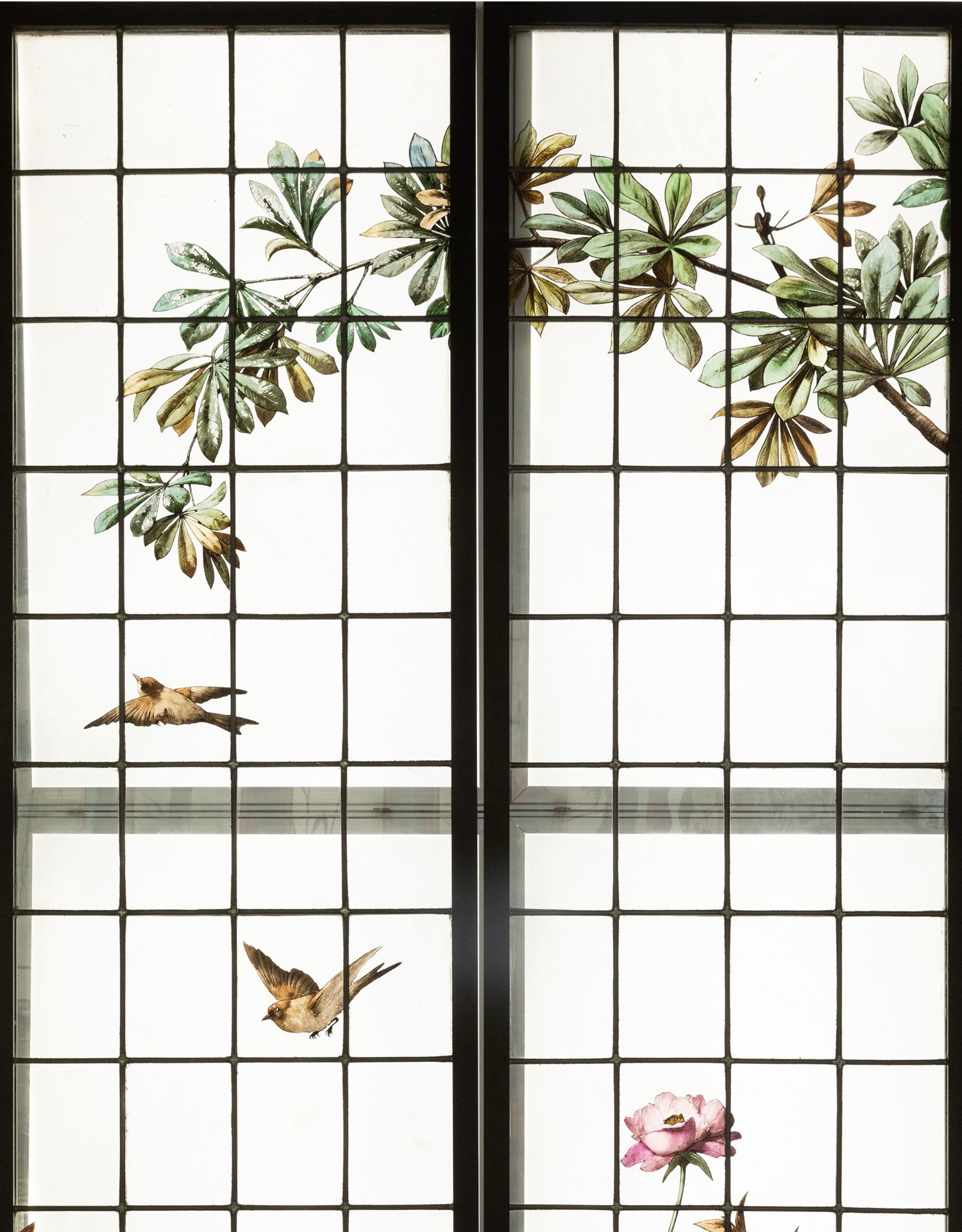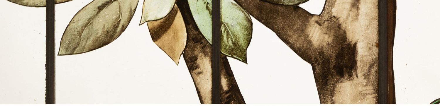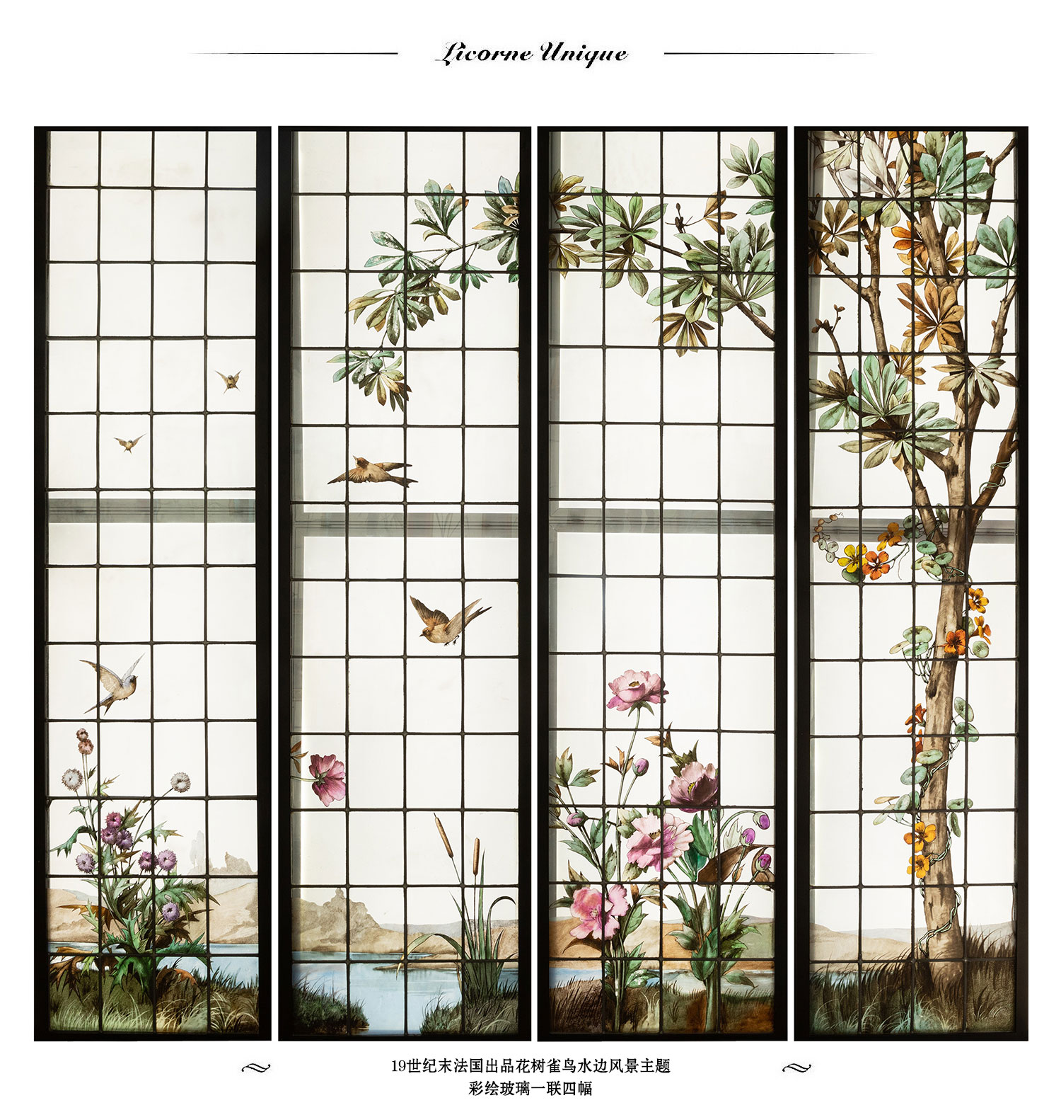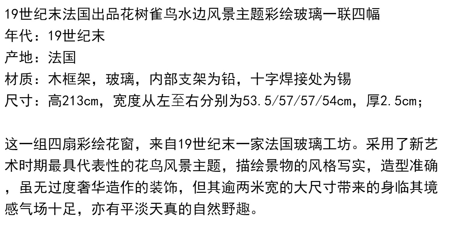 独角鹿西洋古董19世纪法国花树雀鸟水边风景彩绘玻璃花窗一联四幅