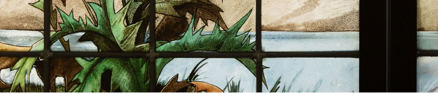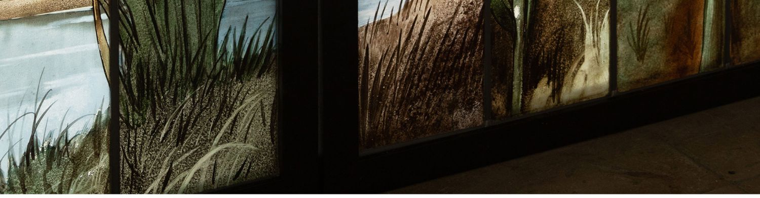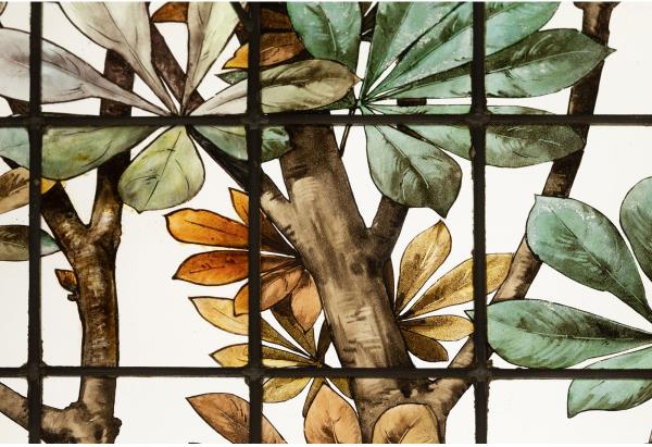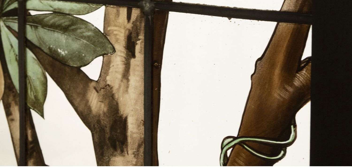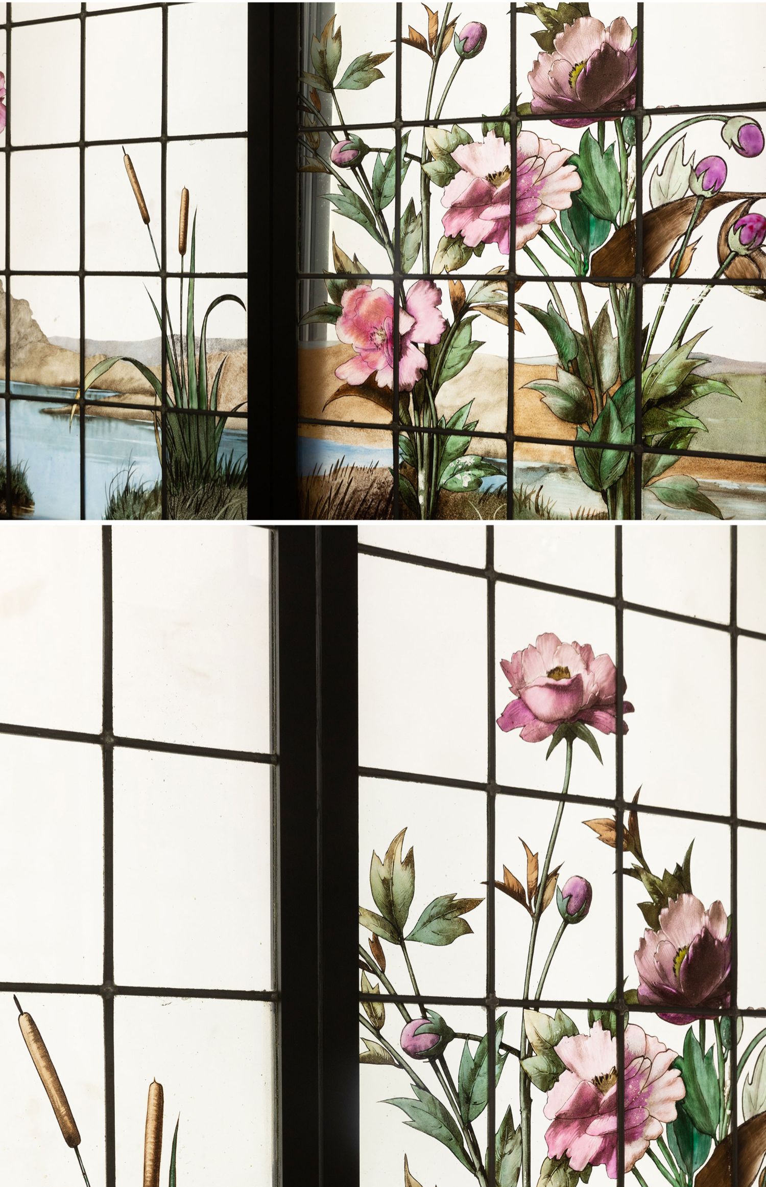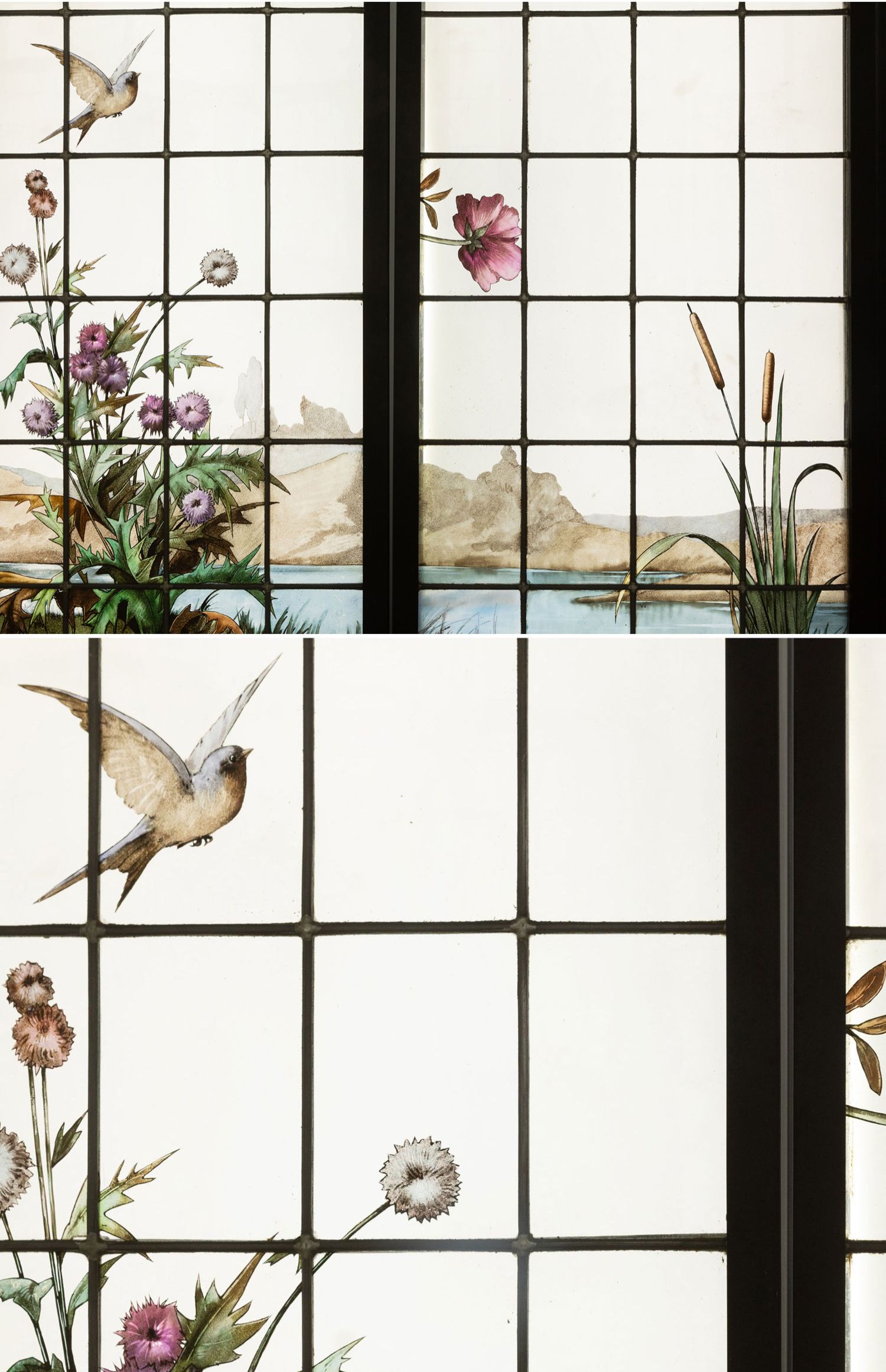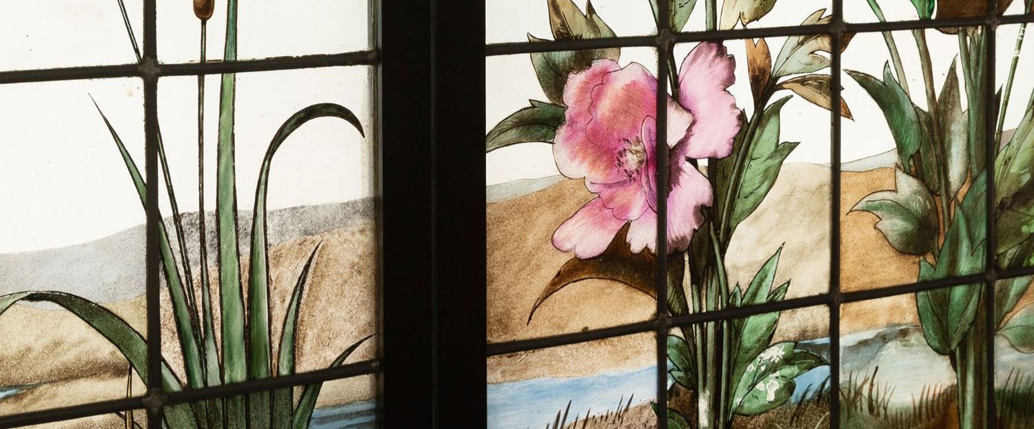 独角鹿西洋古董19世纪法国花树雀鸟水边风景彩绘玻璃花窗一联四幅