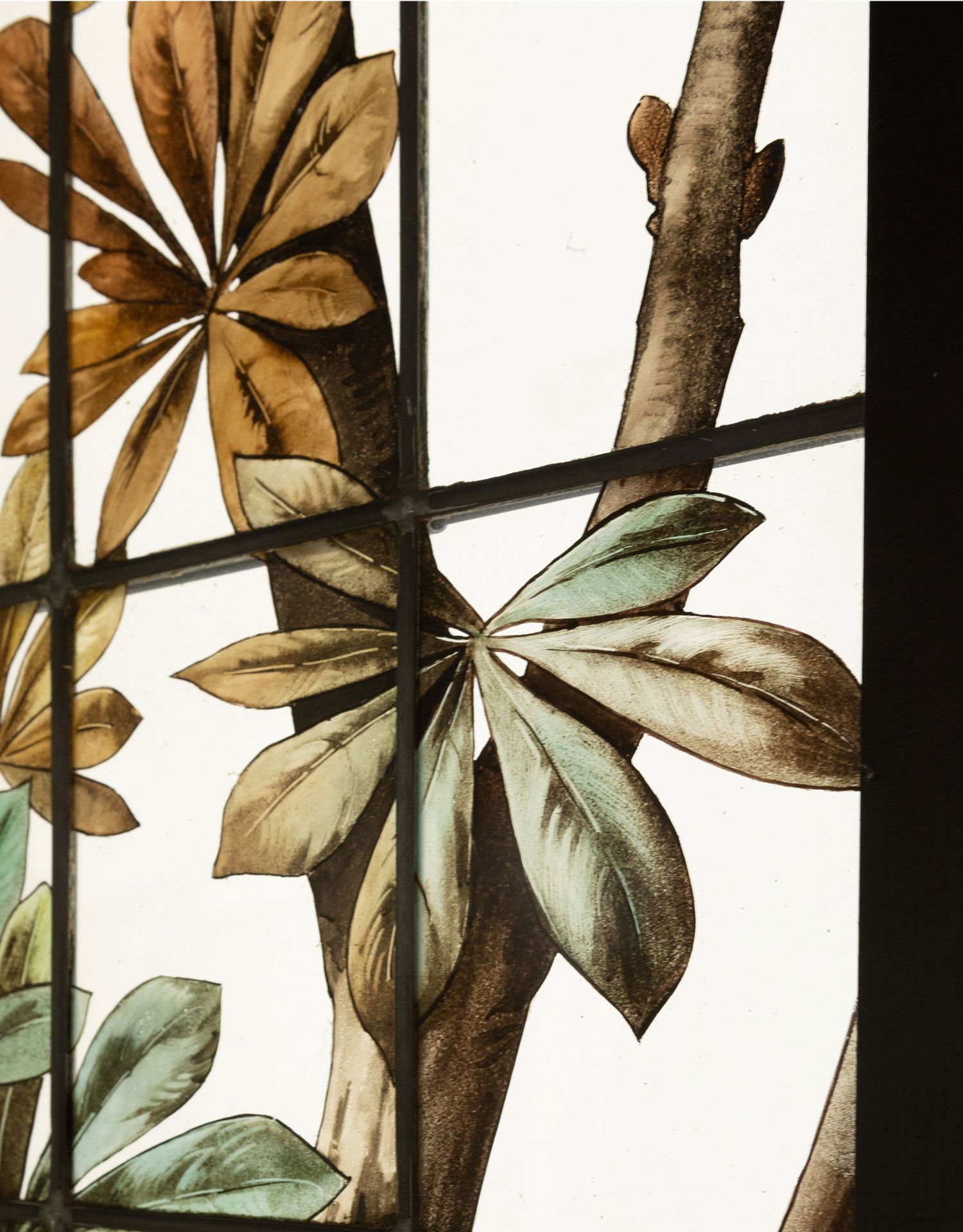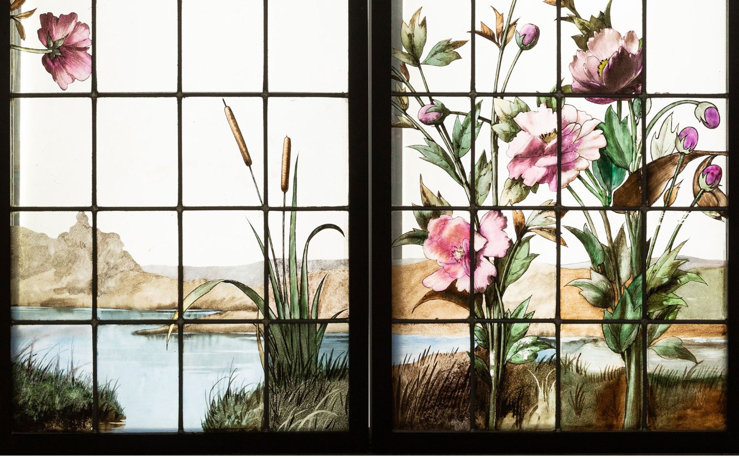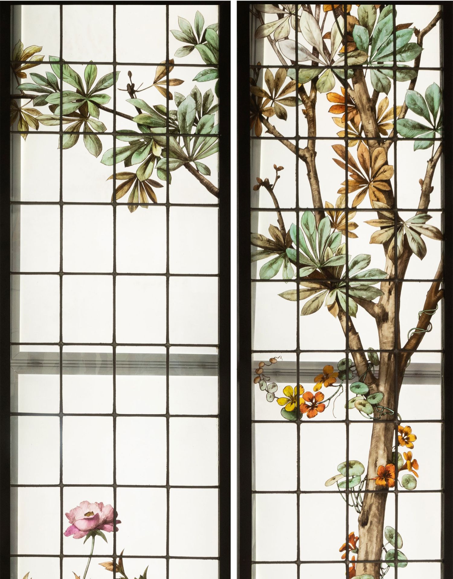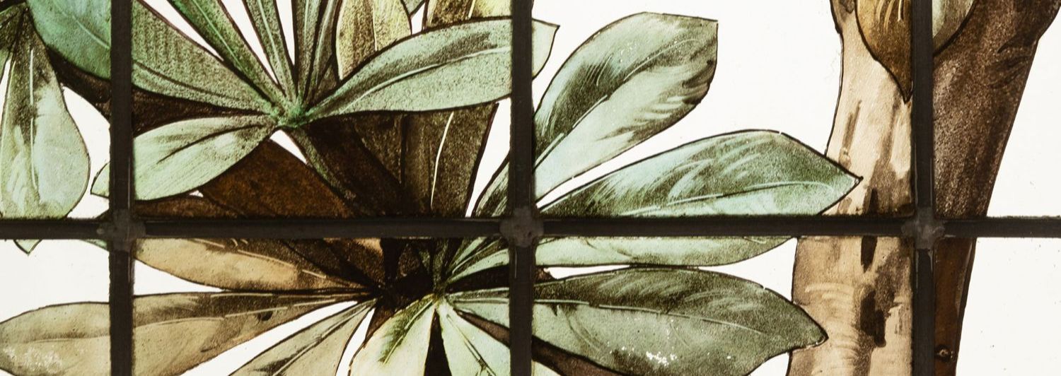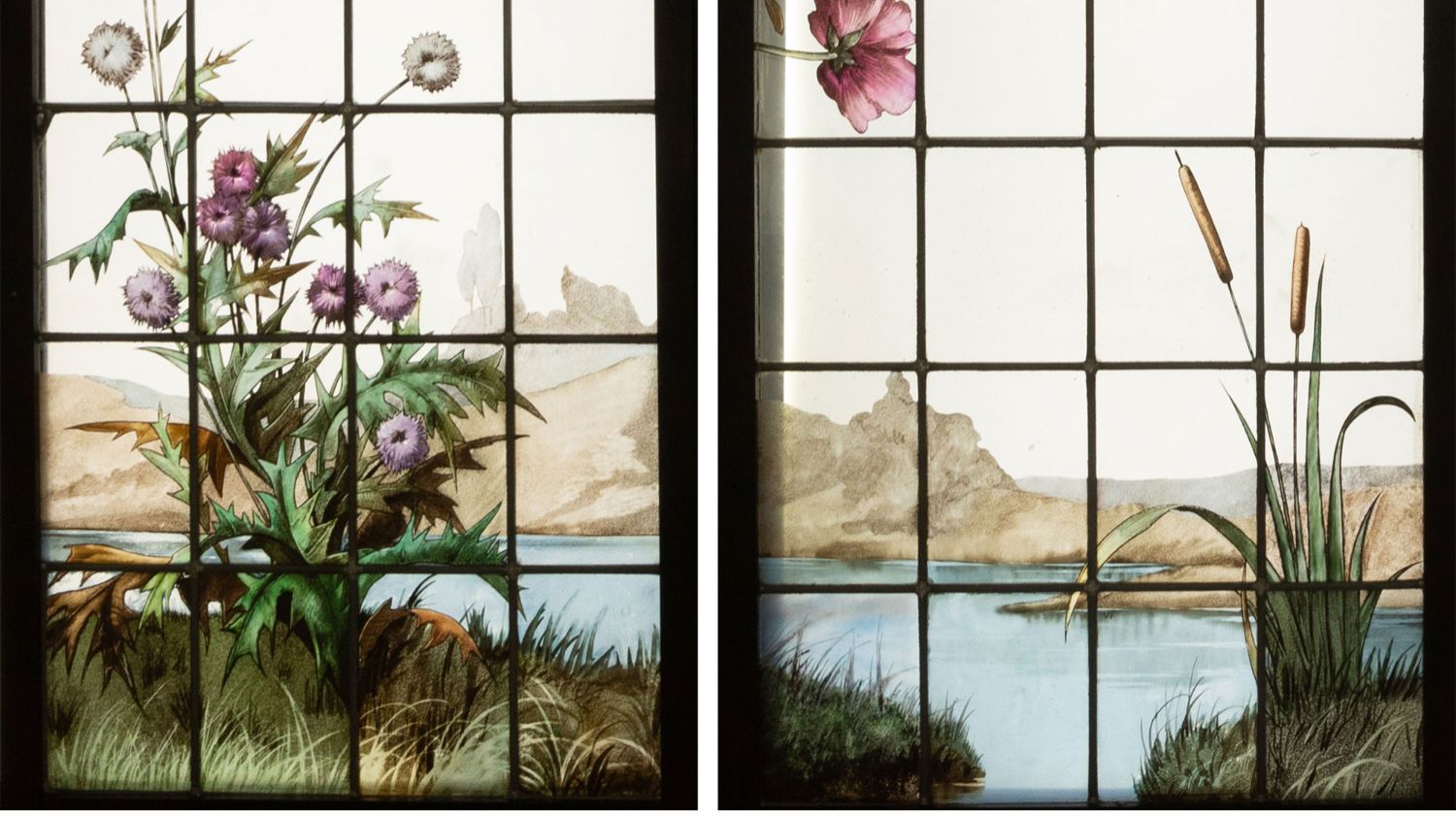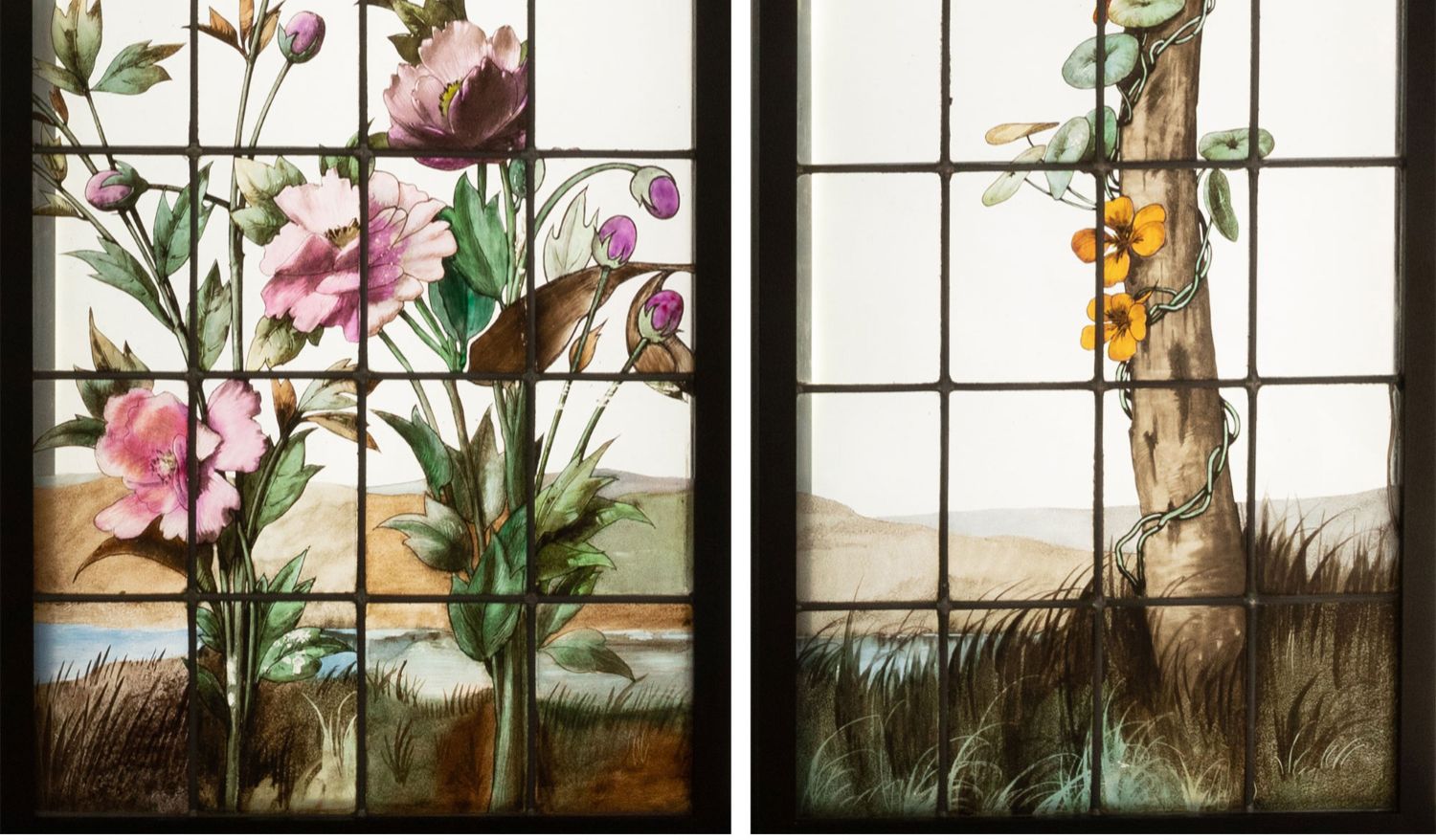 独角鹿西洋古董19世纪法国花树雀鸟水边风景彩绘玻璃花窗一联四幅